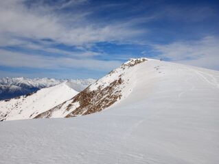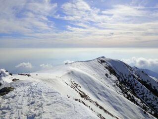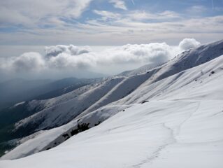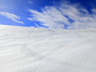 Una decina di minuti a piedi, poi buona copertura. Giornata calda con velature alte. Parte alta con buoni spazi lisci, sotto le tracce rigelate danno fastidio. Prima discesa passando per bivacco, la dorsale sotto ed il canale a sinistra, fin dove troppo ripido. Di qui risalita in punta e discesa classica