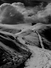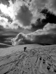 In discesa pendii molto arati, la prima parte in crosta abbastanza portante ammorbidita dal sole, nella parte bassa, dall’ intermedia al colle, ancora qualche bella curva in farina ventata o crosta leggera ben sciabile. Stradina battuta e divertente senza nulla di affiorante.