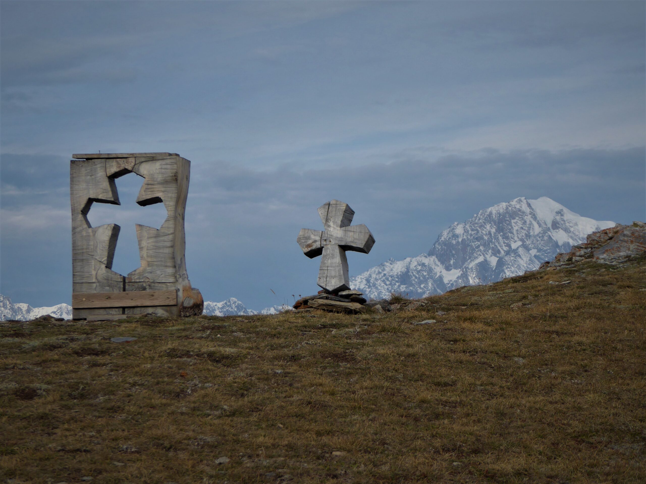 Partiti dai 1740 metri di Vens, dato che la strada asfaltata è vietata 100 metri dopo la frazione; dopo il colle il sentiero, ottimamente tracciato, sale redditizio sino ad una caratteristica conca a circa 2300 metri, dove ci sono un grosso cerchio disegnato con le pietre e due particolari sculture in legno, oltre un’impagabile vista sul Bianco. Poca fatica e si raggiunge la panoramica cima, oggi con meteo con copertura nuvolosa alta e sole assente fin oltre mezzogiorno.
