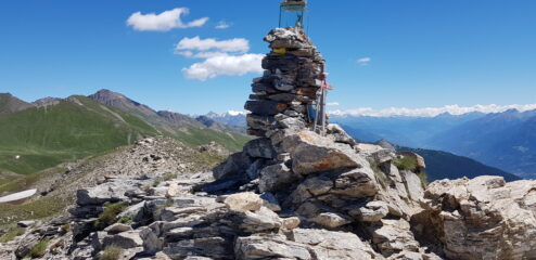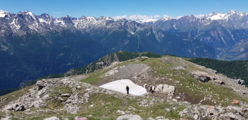 bellissimo sentiero dalla graziosa borgata di Vens, un balcone su Grivola, Pointe de la PIerre e più in alto su Emilius e pure Granpa. Percorso ben segnalato e con tempi di percorrenza coerenti, 2 ore e 40 per la cima. Giornata ventosa e pertanto limpida. Con Marzia ed Elisabetta, nessun altro sul percorso.