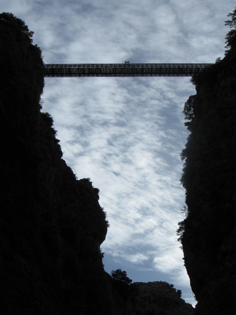Inizia ora la discesa che si concluderà dopo circa 2,5 ore sulla spiaggia di Marmara. Ci si inoltra nella gola passando sotto l’altissimo ponte di Aradena. Tra altissime pareti si scende un primo tratto nell’alveo, per poi risalire a ds una aerea mulattiera scalinata che si alza velocemente sulla profonda gola. Alla salita segue una discesa sempre su mulattiera e sentiero sassoso che riporta nella gola.