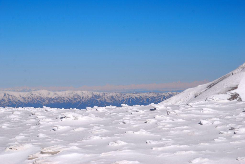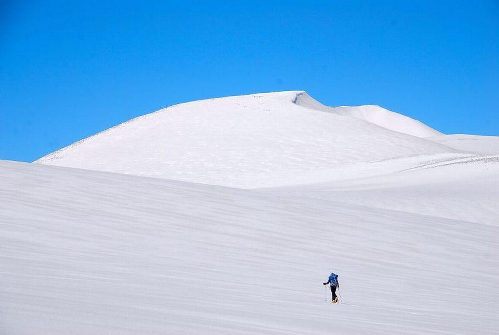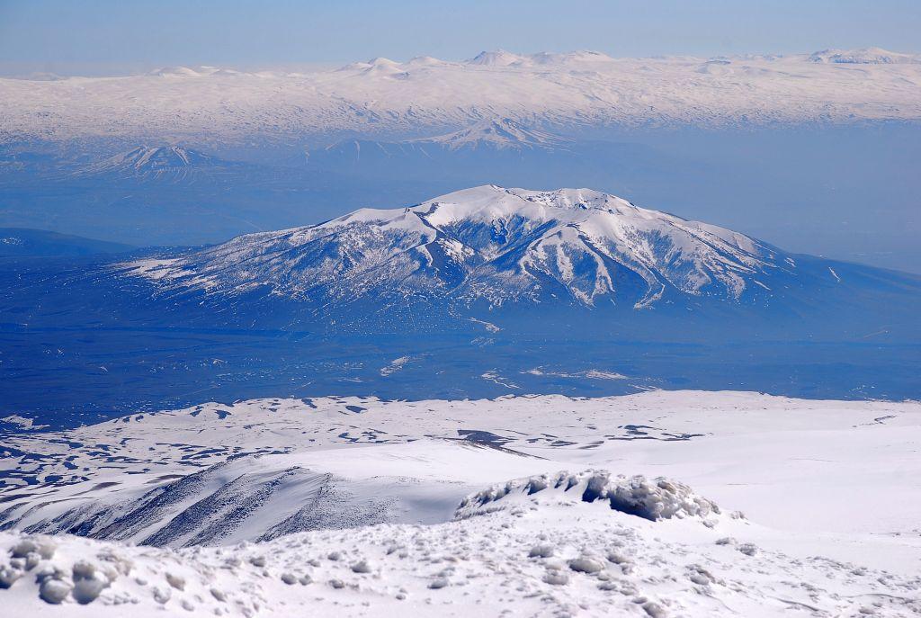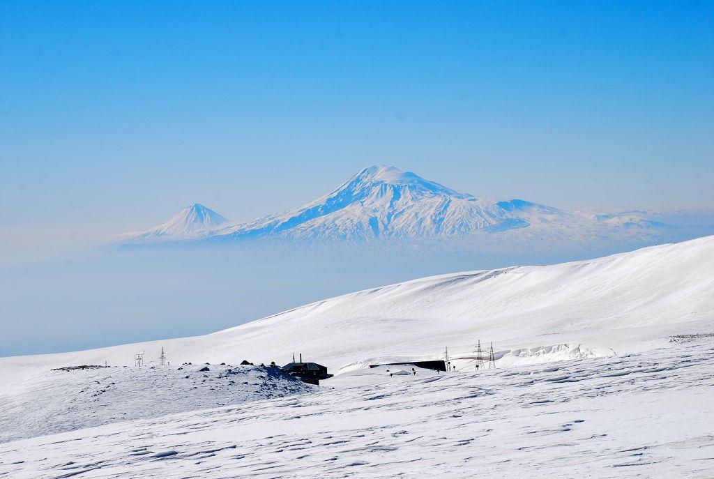 Dalla strada, che dai pressi di Byurakan va verso Amberd, nel punto in cui non è più agibile causa neve, si calzano gli sci e si sale su dolci pendi con radure alternate a boschetti, dove ben presto appare l’ Ararat. Si continua per ampie vallette e conche fino a puntare alla linea di pali d’alta tensione che conduce al centro ricerca. Si segue questa linea senza poter sbagliare e si arriva all’ ampia conca dove sono disseminate varie costruzioni, quasi tutte in disuso. Il centro ricerche ha sicuramente vissuto tempi migliori all’ epoca dell’ URSS. Nella casa principale si può trovare la sistemazione per la notte (5000 ADM, c. 9-10€) Si attraversa il Lago Kare e si abbordano i pendii, prima di moderata pendenza poi più ripidi, fino all’evidente Cima Sud. Si scende pochi metri dalla cima, si contorna sulla sx un’elevazione e si scende al colle tra le cime O e S. Da qui inizia la lunga discesa nel vallone fornato dal cratere lungo vaste conche e pendii. Una prima strettoia la si scende senza problemi sulla sx, così la seconda facendo un traverso delicato su salti di roccia fino a un canalone che si abborda dove è ripido, ma in breve la pendenza scema nella facile conoide (questo è l’unico tratto con pericolo valanghe). Dopo si segue l’impluvio principale con lunghe scivolate. Si passano due dighette stando a dx e si arriva allo sbocco della valle a pochi minuti dal villaggio di Aragats.