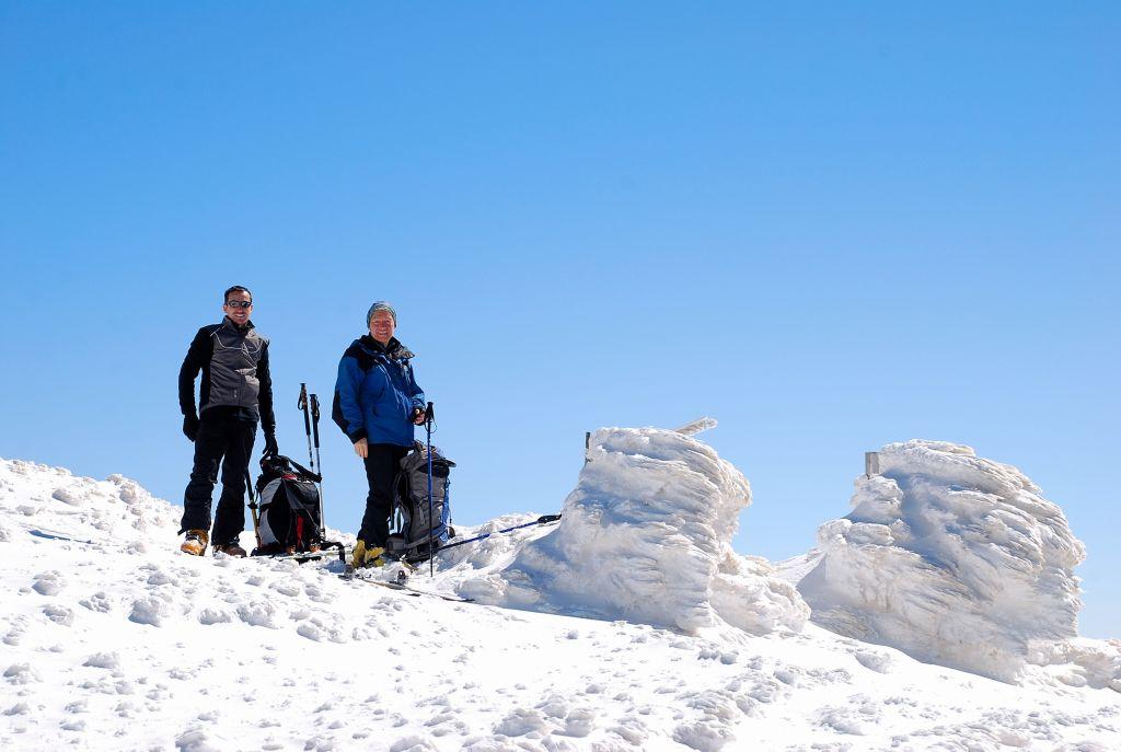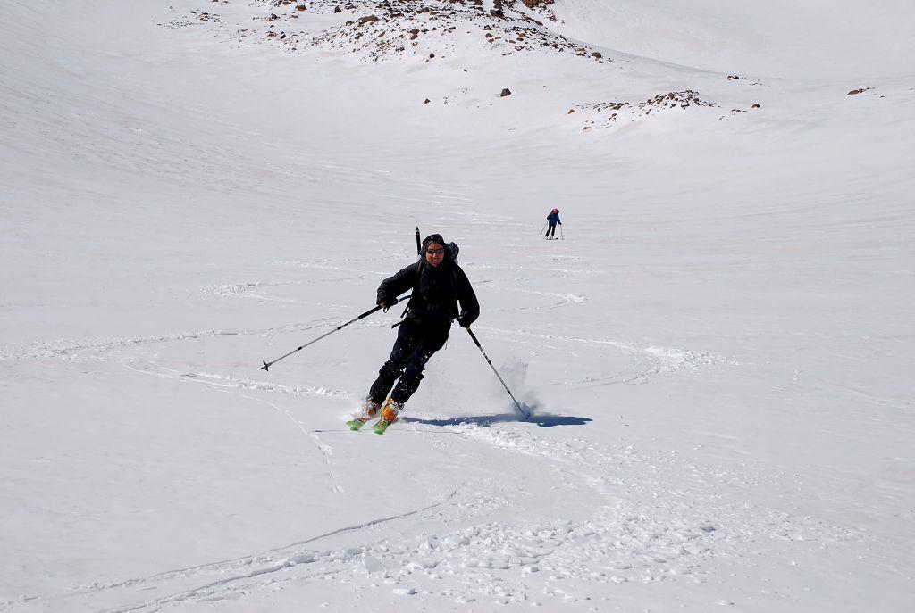 Percorso di grande soddisfazione fatto in 2 giorni dormendo alla stazione astrofisica. Tempo perfetto con un po’ di venticello e freddo il primo giorno, quasi assenza di vento il secondo, -25° nella notte. Abbiamo impiegato 6 ore e 45′ per fare i 1350 m fino alla stazione su un percorso lungo su pendii che ingannano la loro reale dimensione. Trovato tracce del lupo e di volpi, che abbiamo visto. Bellissimo l’it. sino alla cima dove nell’ultima parte c’è una neve veramente particolare con sculture bizzarre formate dal vento. Dalla cima panorama spaziale nella sua più vasta accezione. Oltre alle altre cime dell’ Aragats, a nord pressochè per intero tutto il Caucaso dove si individuavano l’ Elbruz e il Kazbek, a sud l’ Ararat imponente con il Piccolo Ararat svettante lì vicino e un’infinità di catene turche verso il lago di Van, a est le catene di monti che confinano con l’ Azebarjian e così a ovest. In cima assenza di vento. In discesa i primi 100 m su questa neve buffa fino alla sella tra le cime Sud ed Ovest (quest’ultima bellissima, con le rocce ammantate di cavolfiori glaciali). Dalla sella inizia la discesa nel cratere meravigliosa e sarà così fino all’ultimo metro di discesa.