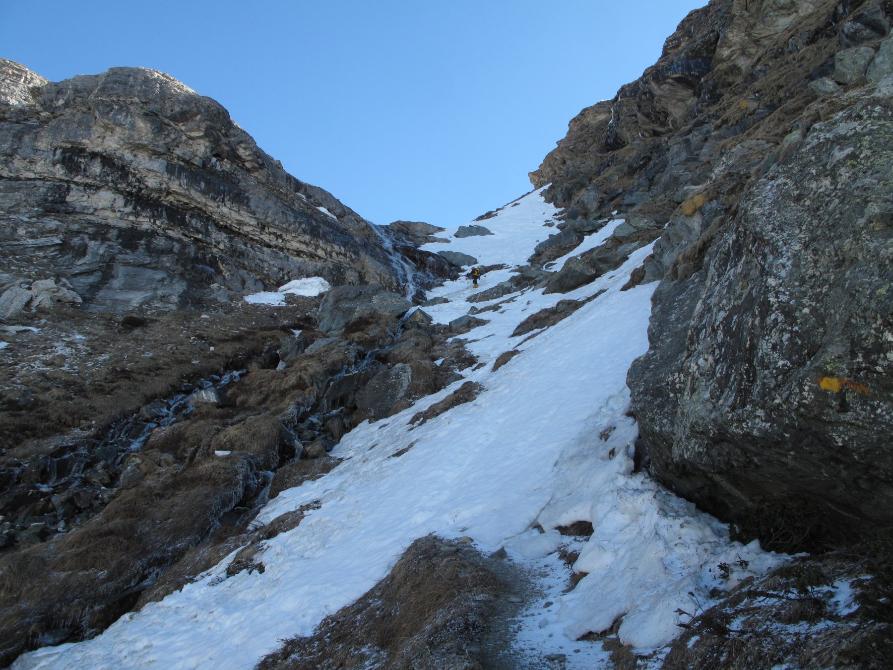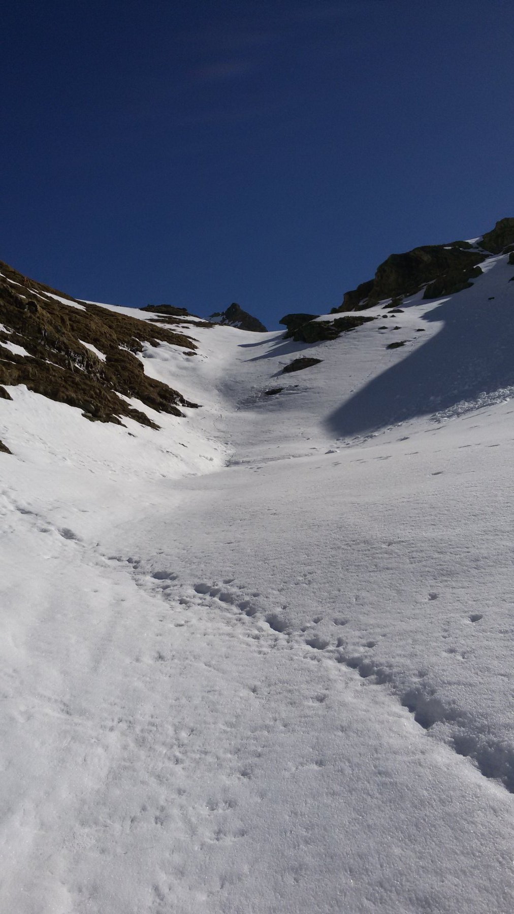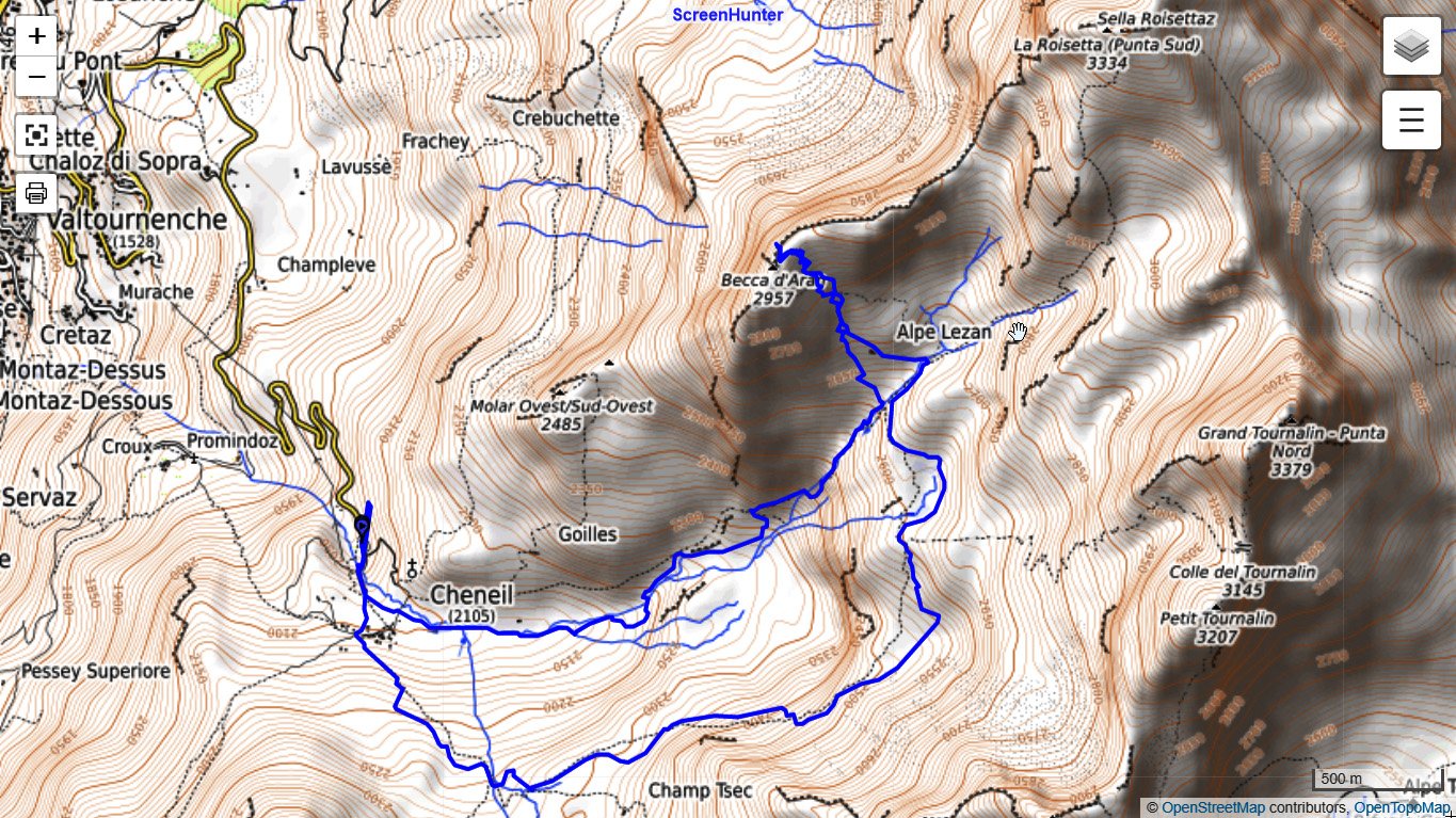 Da Cheneil si sale verso il ripido canale (non sempre praticabile) del torrente Cheneil (direz. E-NE), a seconda delle condizioni di innevamento seguire la traccia del sentiero estivo (segnavia n° 26), o tenersi in centro al vallone.