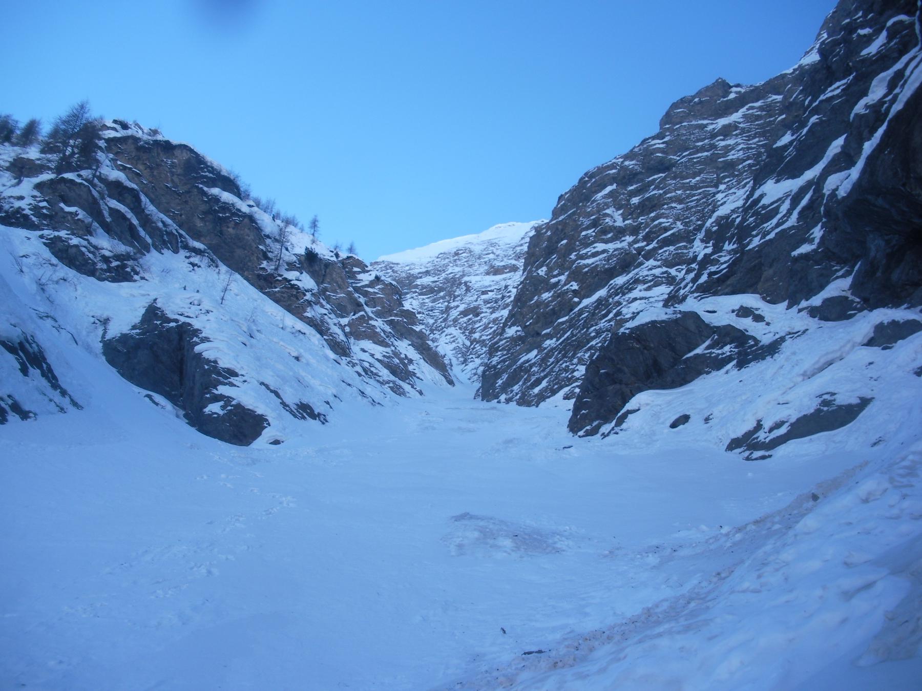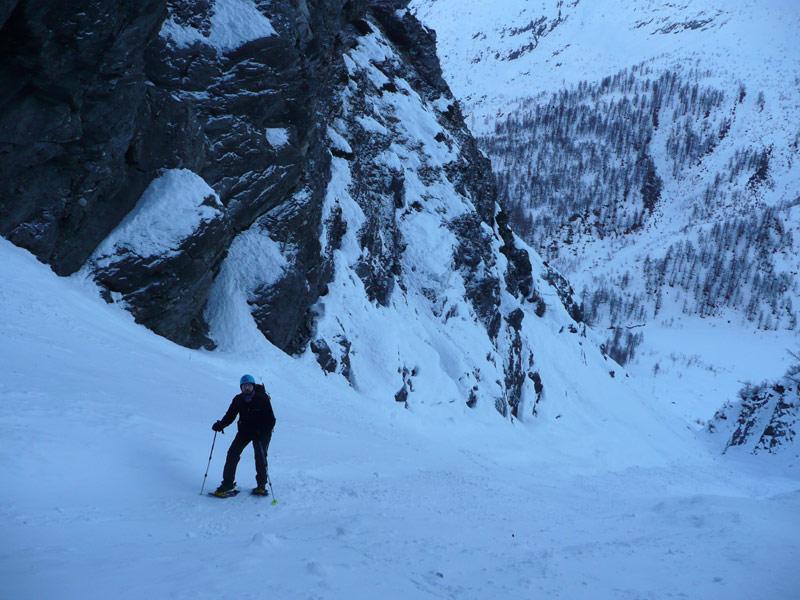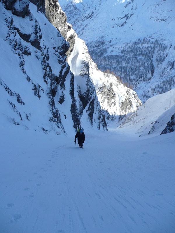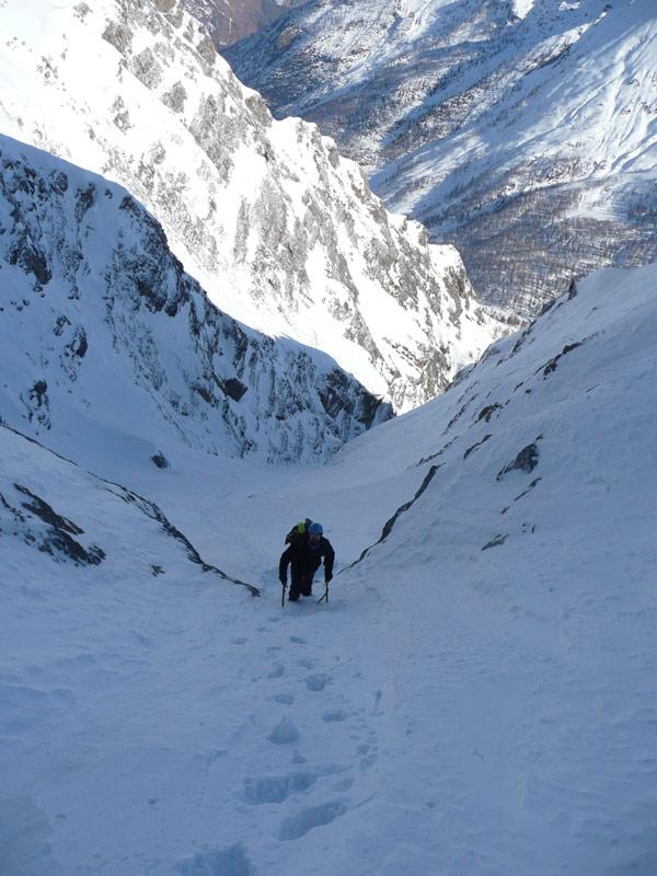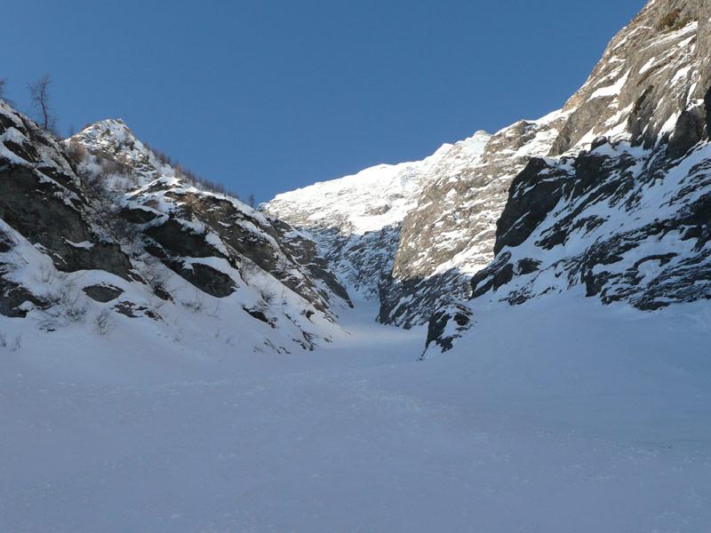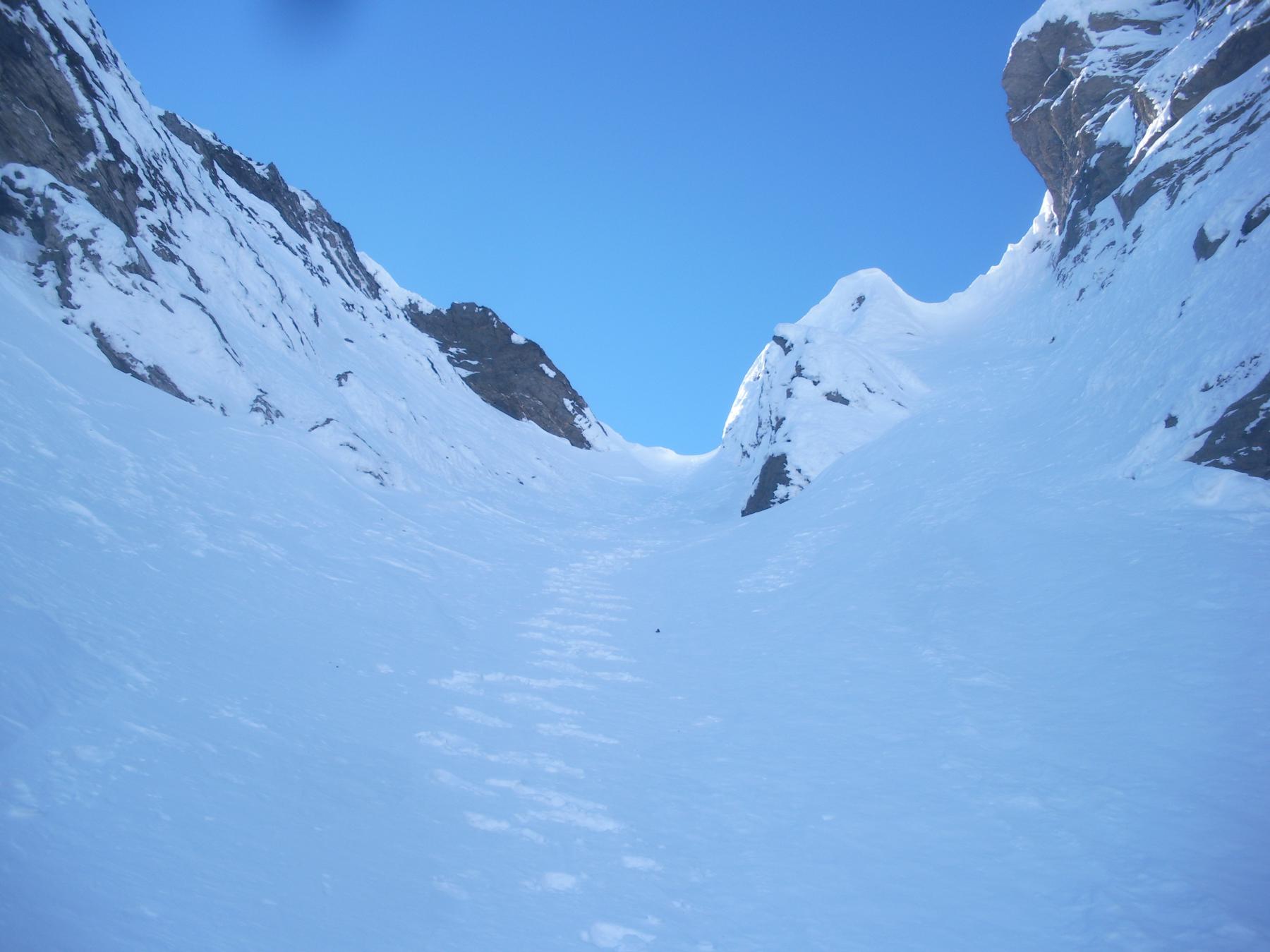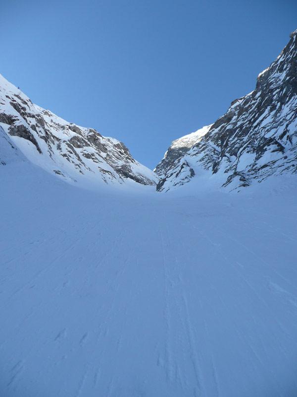 Poco prima del gruppo di malghe, volgere a dx (ovest) e imboccare l’evidente canalone, inizialmente poco ripido, che sfocia in un ampio conoide. Il canale, dopo una strozzatura che lo costringe a formare una “S” (tratto di misto in caso di poca neve), diventa incassato fra alte pareti rocciose, e assume un andamento più lineare pur conservando una forma curvilinea che ne nasconde l’uscita.