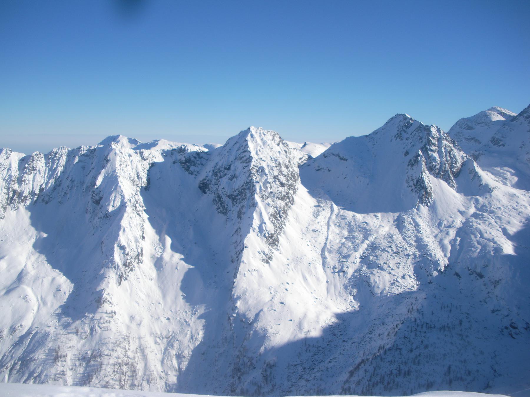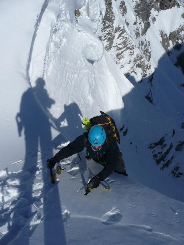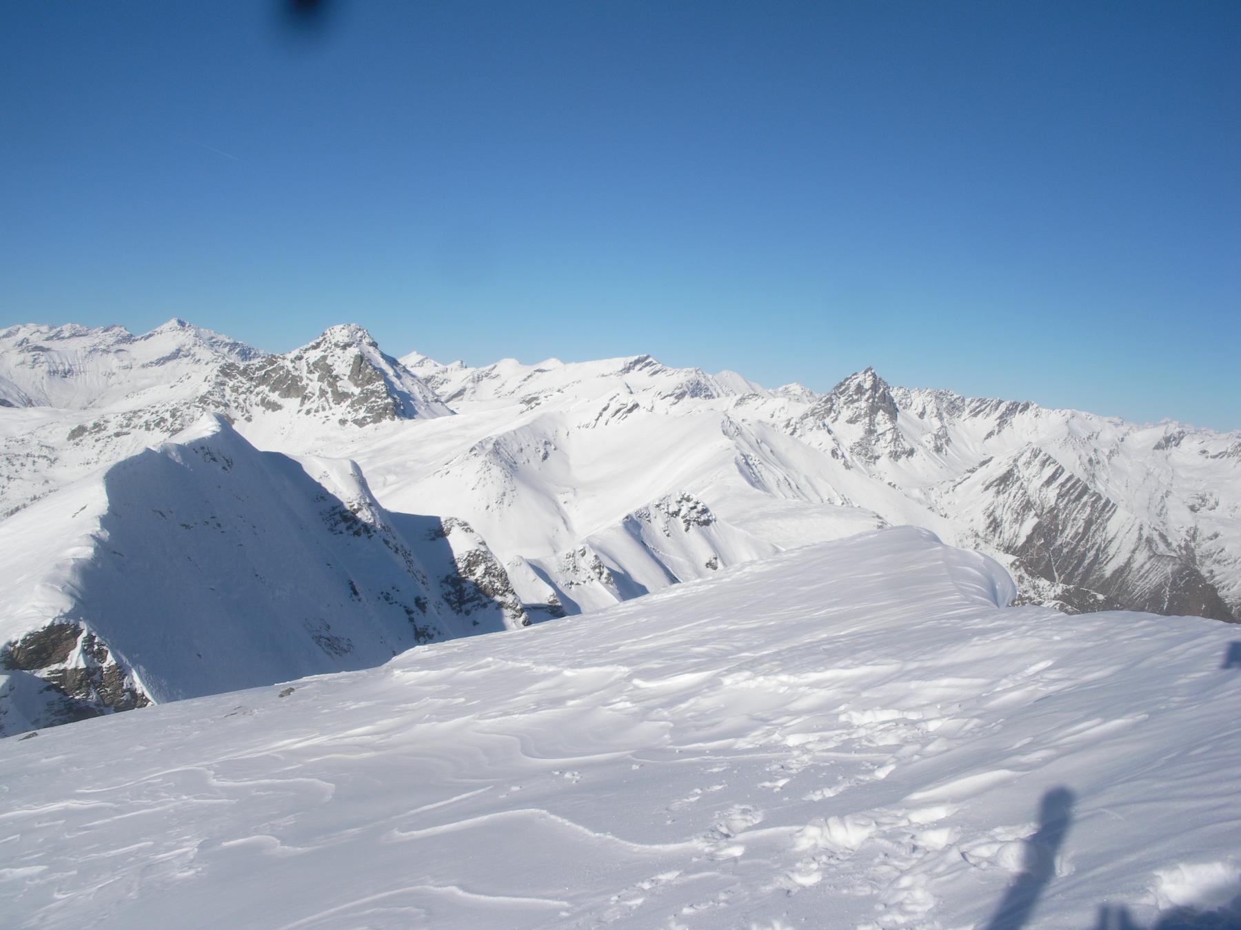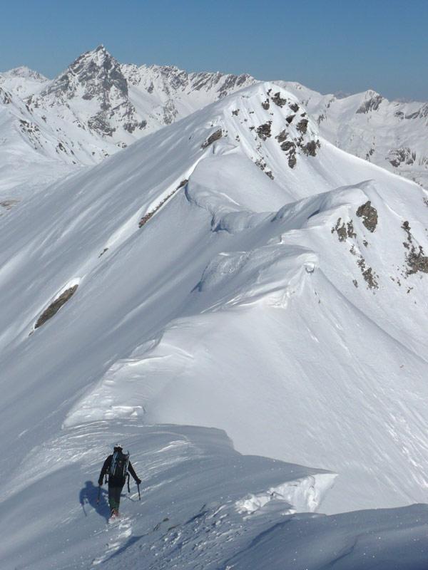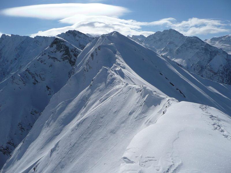 Discesa: lungo il canalone o in traversata passando dal Colle della Croce. In questo caso, tornati al colletto del Cumbalas, seguire la cresta Italia-Francia verso N. In assenza o con poca neve la cresta è piuttosto elementare, altrimenti richiede prudenza per la presenza di insidiose cornici che si alternano su ambo i lati.