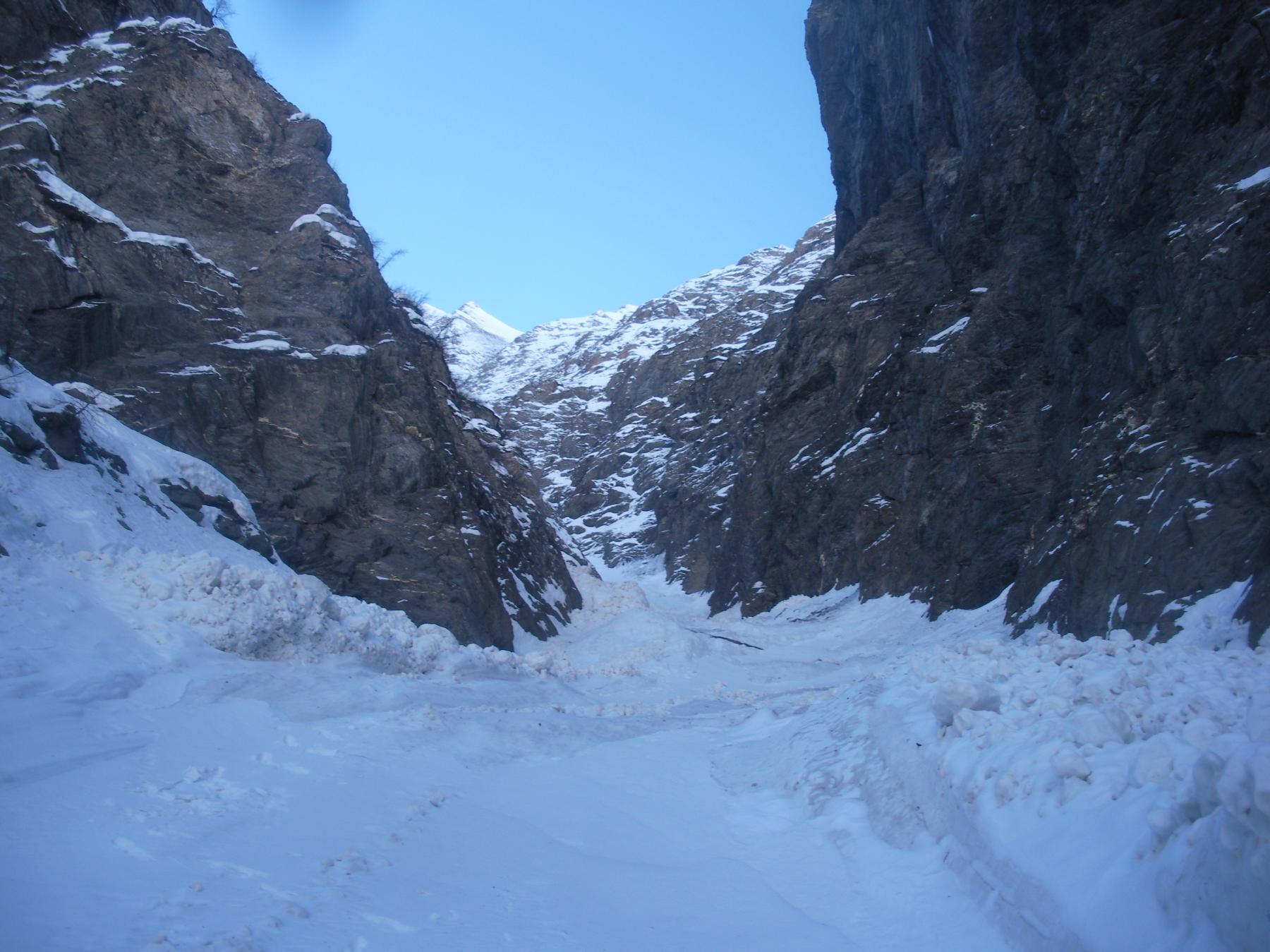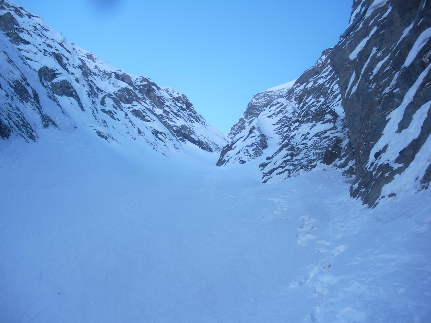 Ho percorso questo canale in discesa essendo giunto sull’Arbance per altra via. Per meta’ la parte alta tutta di neve pressata su fondo duro scendibile, tolto il breve tratto iniziale, picca ramponi faccia a valle con un po’ d’attenzione. Sconsigliata la discesa in sci poiche’ da meta’ fino allo sbocco e’ tutto svalangato con grosse zolle di neve gelata disagevole da scendere anche a piedi.