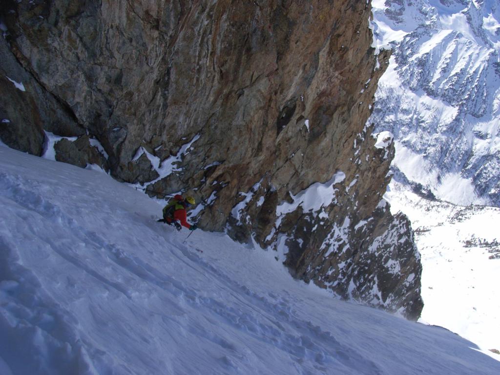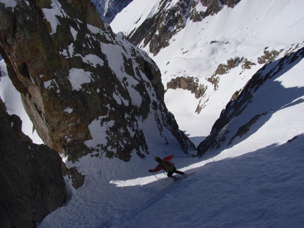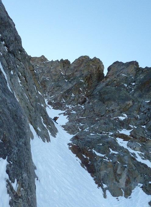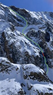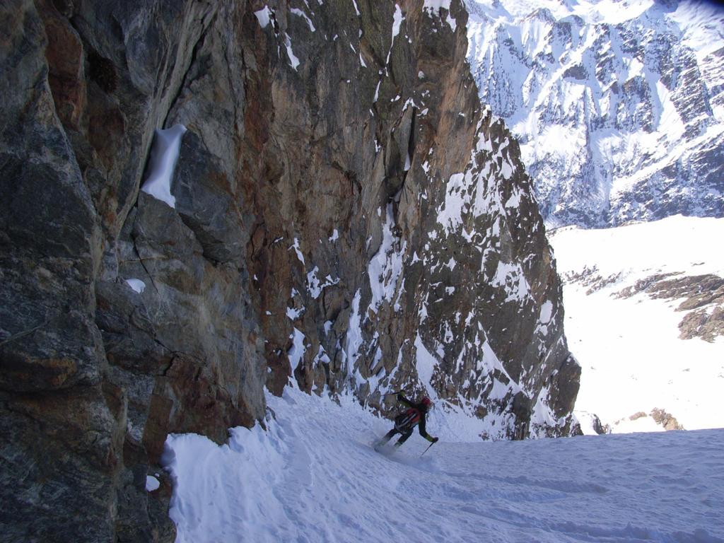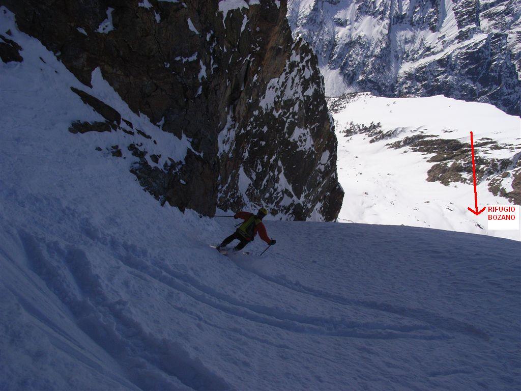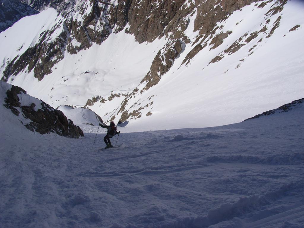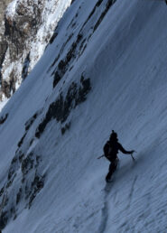 Canale,a banana nella parte alta(400m). Poi nevaio sospeso, infine canale con strettoie + salto di ghiaccio (massimo 10m, meno se con buon innevamento) per i restanti 400m. Itinerario severo ed esposto, raramente in buone condizioni per la discesa integrale in sci.