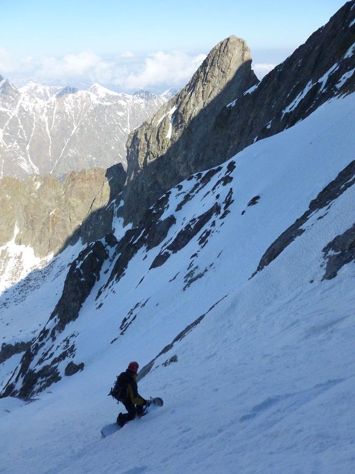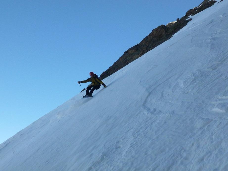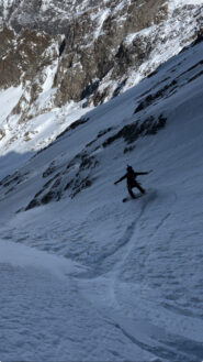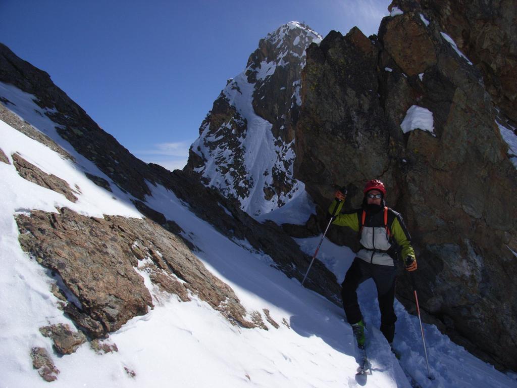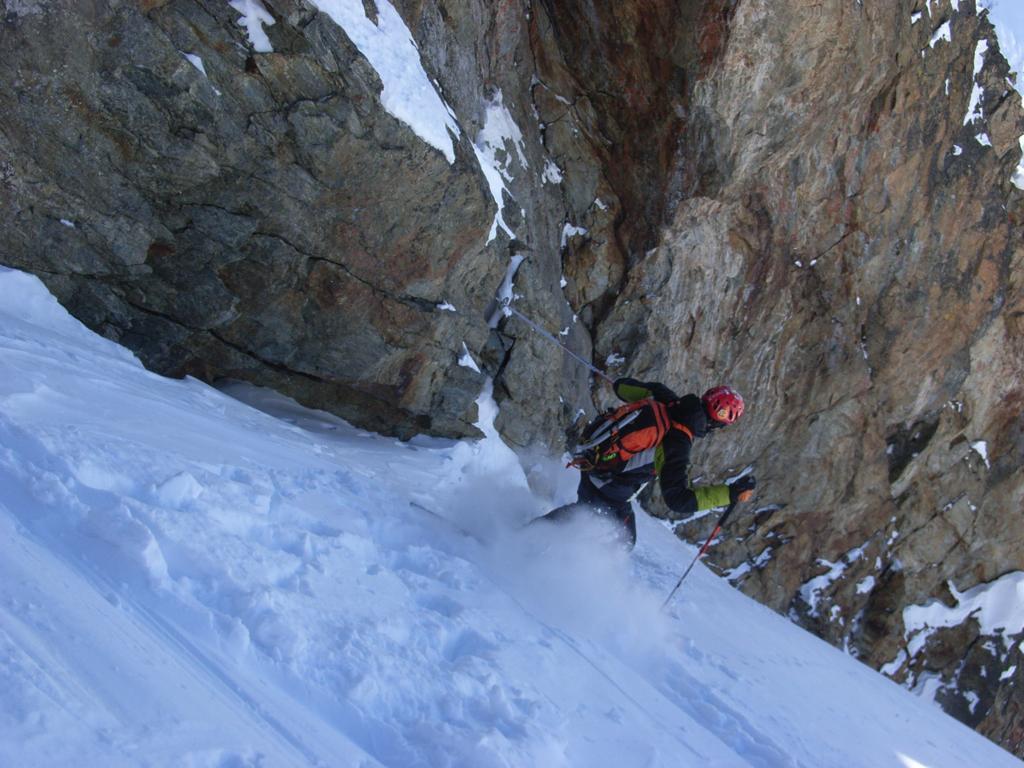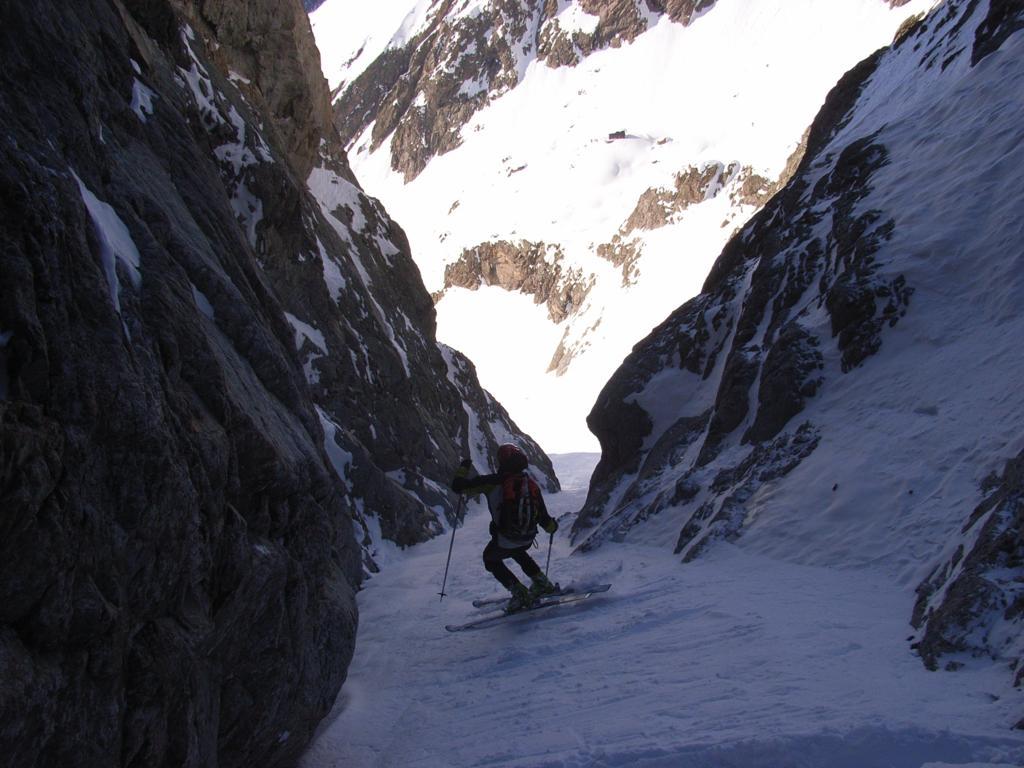Canale,a banana nella parte alta(400m). Poi nevaio sospeso, infine canale con strettoie + salto di ghiaccio (massimo 10m, meno se con buon innevamento) per i restanti 400m. Itinerario severo ed esposto, raramente in buone condizioni per la discesa integrale in sci.