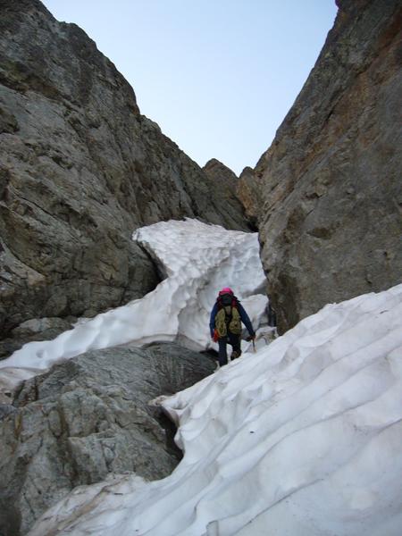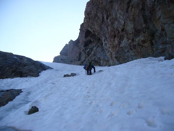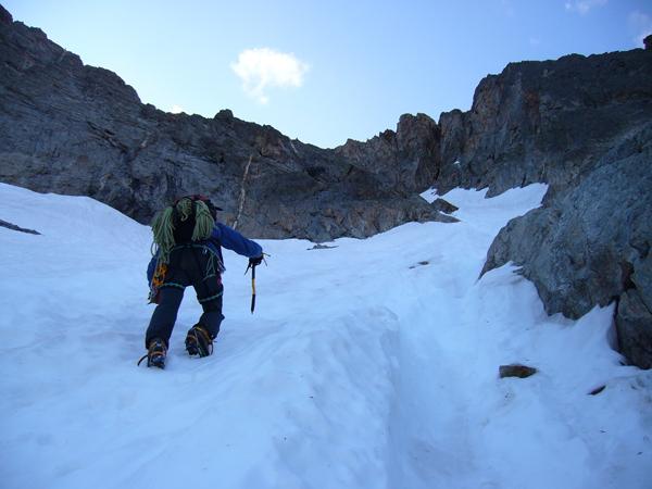 Nella parte inferiore il primo risalto ripido c’è ma non durerà molto è al limite, c’è un chiodo con cordino bianco a destra. La famosa cascata è bella grossa ovviamente è d’acqua per aggirare la quale abbiamo fatto due tiretti, max II. In questi due tratti sono presenti alcune soste a chiodi. Per arrivare a prendere il nevaio è stato necessario superare alcuni passaggi su roccia in quanto le linghette superiori erano sgombre dalla neve. Questa parte ha richiesto parecchio tempo. Acchiappato il nevaio in un’oretta eravamo in coppa senza particolari problemi.