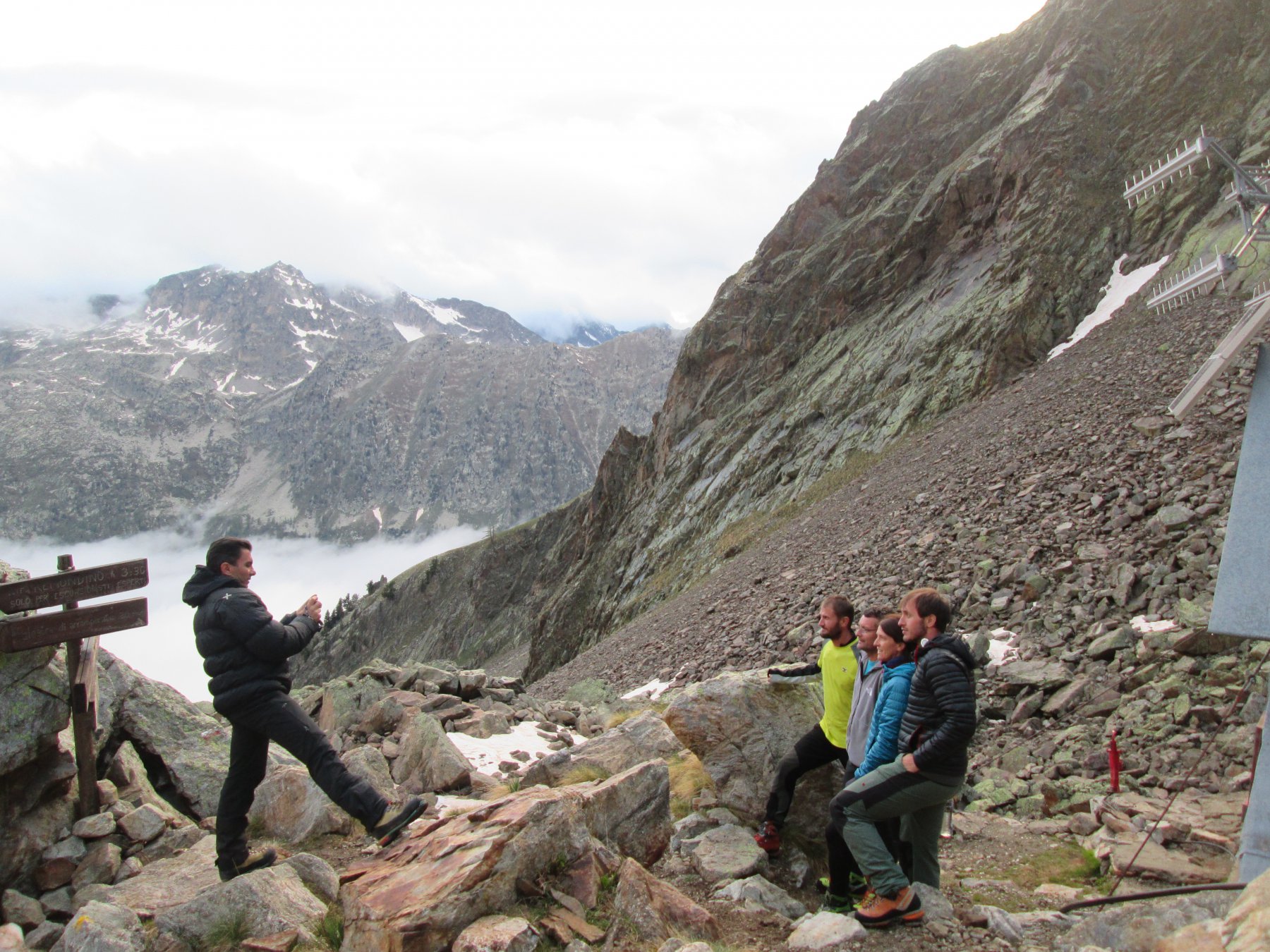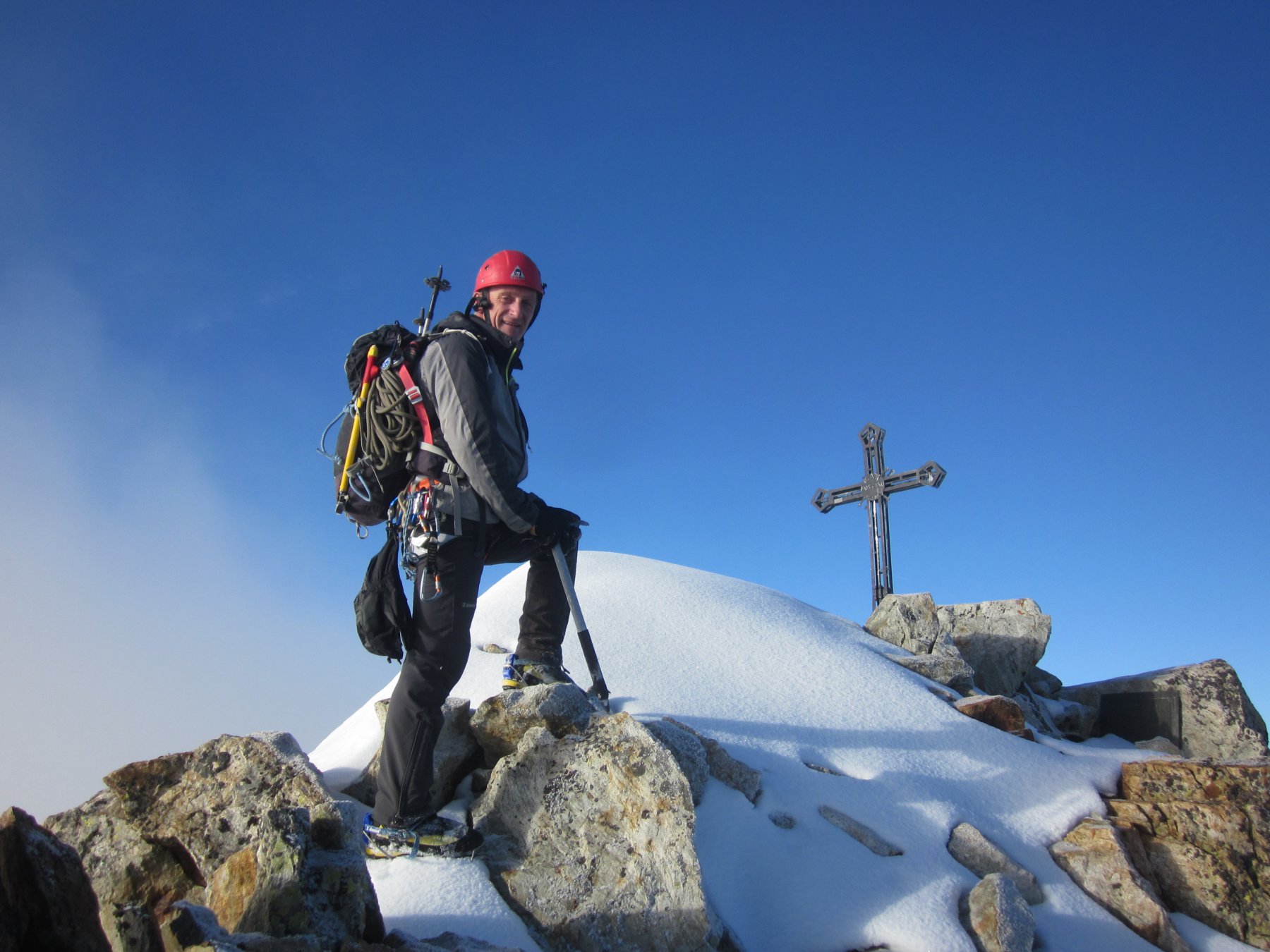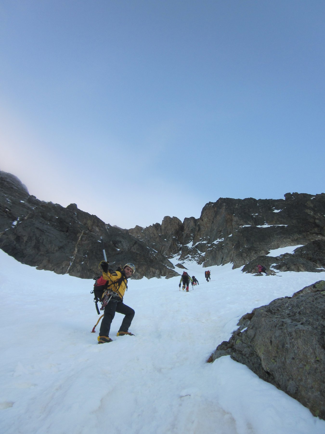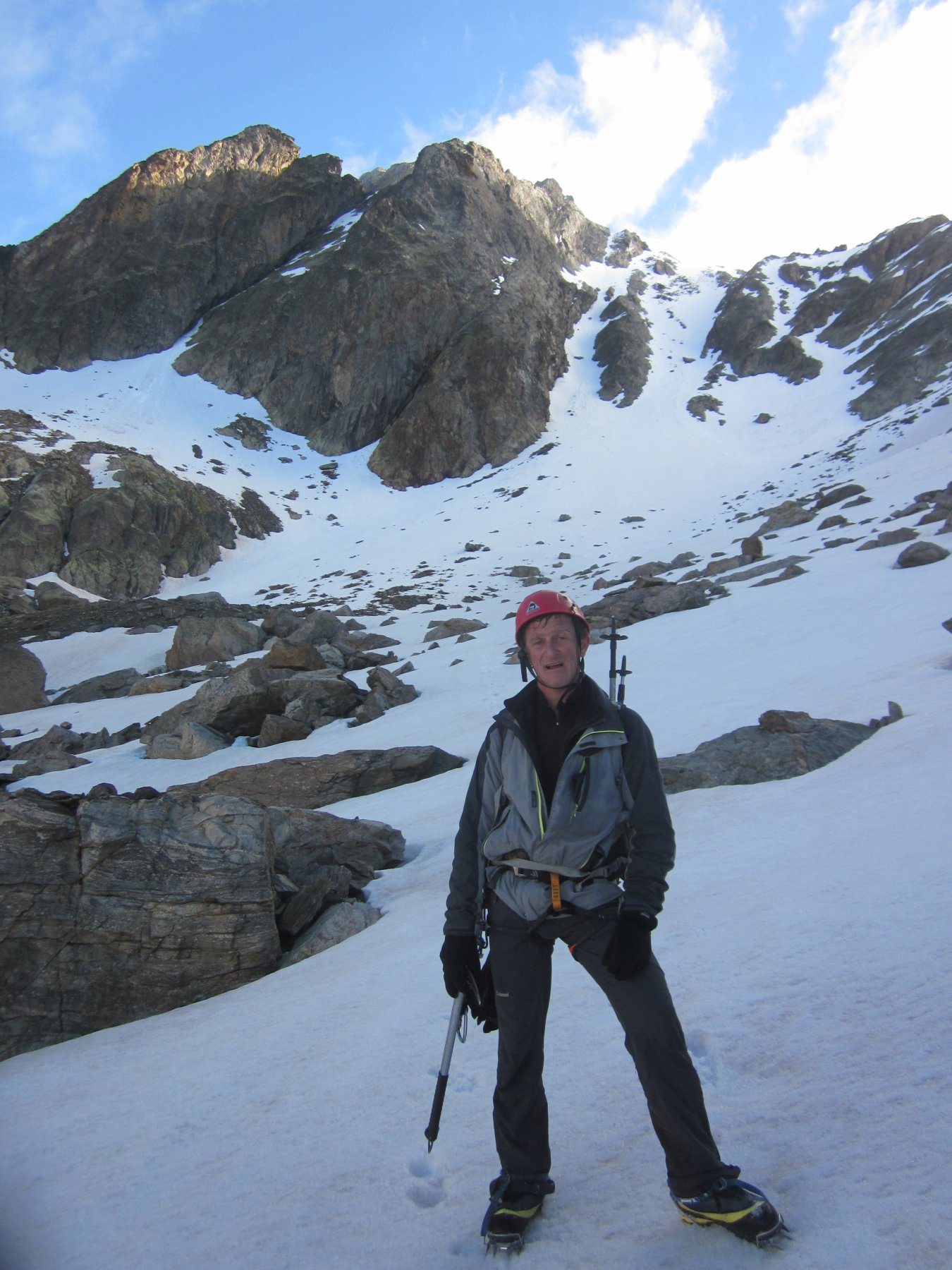 E anche il forcella e andato!,venerdì sera alle 20 siamo al bivacco del bozano , saliti con meteo nuvole e nebbie in dissolvimento , anche il sole al tramonto,i 4 amici bergamaschi saliti prima di noi nel pomeriggio (avevano gia chiuso la cucina ), quindi noi ci facciam 2 tortelli in brodo ,bistecchina e piselli , dolce e caffè, scambiandoci 4 chiacchere.(prima del buio il forcella si mostra nella sua veste).ottimo riposo alle 3.30 i 4 soci partono,noi riposiamo ancora un pò, e partiamo alle 4.30′ quasi si vede senza frontale , ovviamente fino a quando non li abbiam raggiunti siamo saliti su ottima traccia appena dopo la cascata, (dario a fatto una variante x diversificare un po)- poi preso io il possesso della patente di battitore fin in cima (neve buona faceva il gradino alla caviglia )2 picozze, corda nello zaino. più di cosi , in più il meteo bello e tutto attorno nuvole minacciose dopo il monviso – francia – pianura.al colle della forcella(ore 7, salutiamo i ragazzi , saltiamo sulla cresta che conduce alla cima sud, cima foto, e giù tratti in neve ma cengia quasi pulita, tratto dei detriti scesi sul primo canale prima del colle vero e proprio , primo pezzo faccia monte e poi giù sempre su buona neve che più si scende meglio tiene fin al remondino dove arriviam alla 9- pausa preso il primo raggio di sole , e nuovamente giù ,all’auto ore 11(o l’abbiam presa veloce x timore del meteo o veramente era in buone condizioni sia la montagna che noi)bellissima salita , un grazie al socio di queste course, e saluto i bergamaschi che secondo me son rimasti soddisfatti dalla regina delle marittime CIAO.