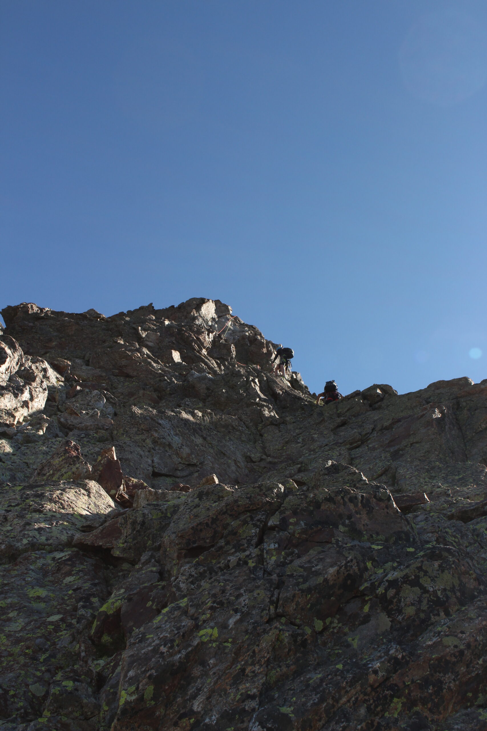 Oltre a noi oggi altre 6 cordate… e siamo arrivati all’attacco quasi tutti a tempo. Partiti per terzi, abbiamo fatto le placche dal colletto Freshfield slegati per proseguire poi in conserva media fino all’inizio della cresta sommitale. Roccia non sempre eccelsa sulla cresta, ma piuttosto affidabile stando attenti a cosa si tira. Unico punto “da paura” è l’ultima paretina prima di arrivare sugli sfasciumi della cresta sommitale dell’Argentera, roccia rossa veramente orrida.