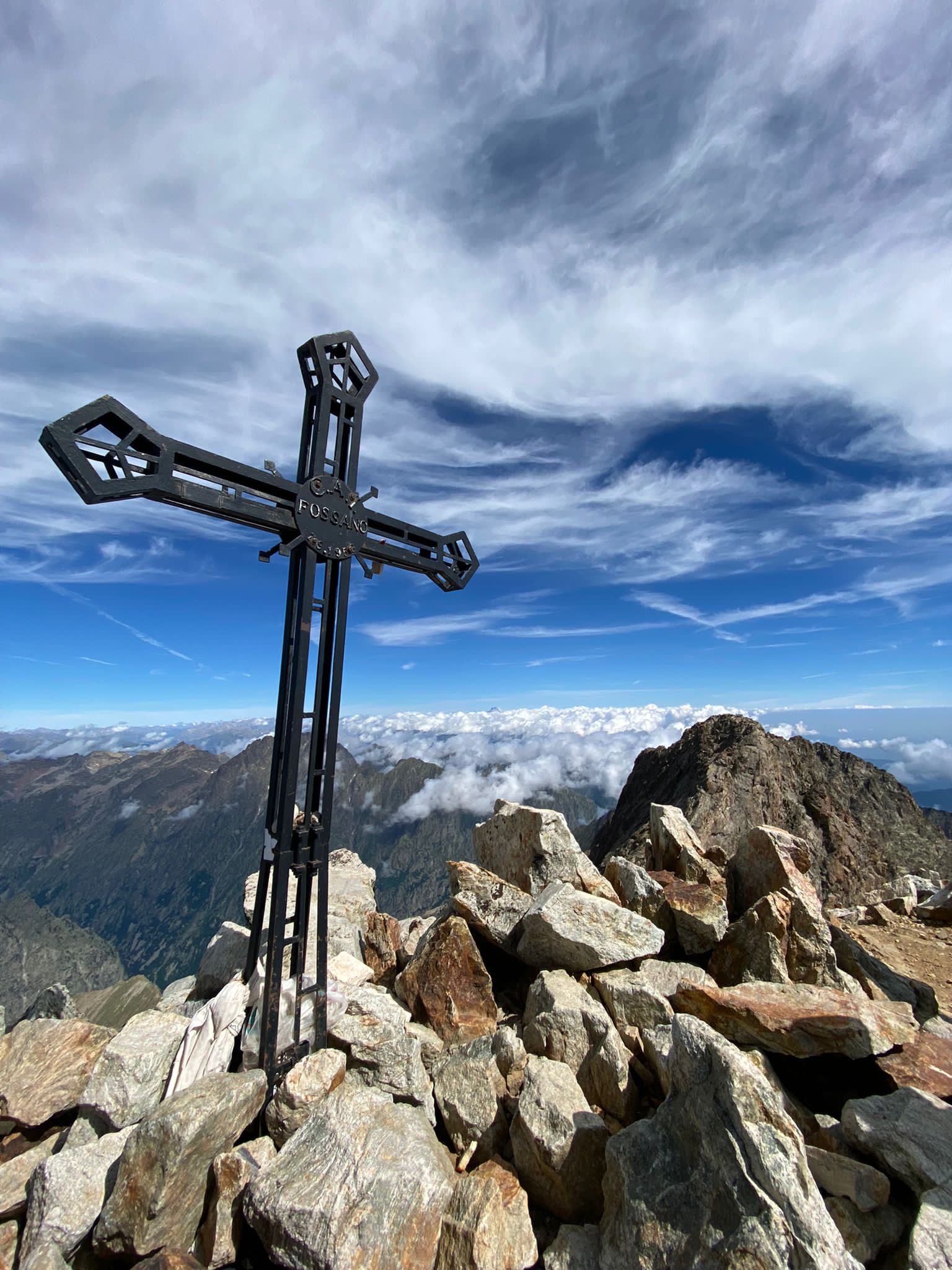 Fino alla cima Genova abbastanza facile, dopo l’esposizione aumenta notevolmente e si trova qualche passaggio più impegnativo ma si riesce sempre a proteggere bene e la roccia è molto bella! Tutta in conserva a volte protetta (corda 30m, cordini, qualche rinvio lungo, friend dallo 0.3 al 2 BD), in vetta alle 10.30.
