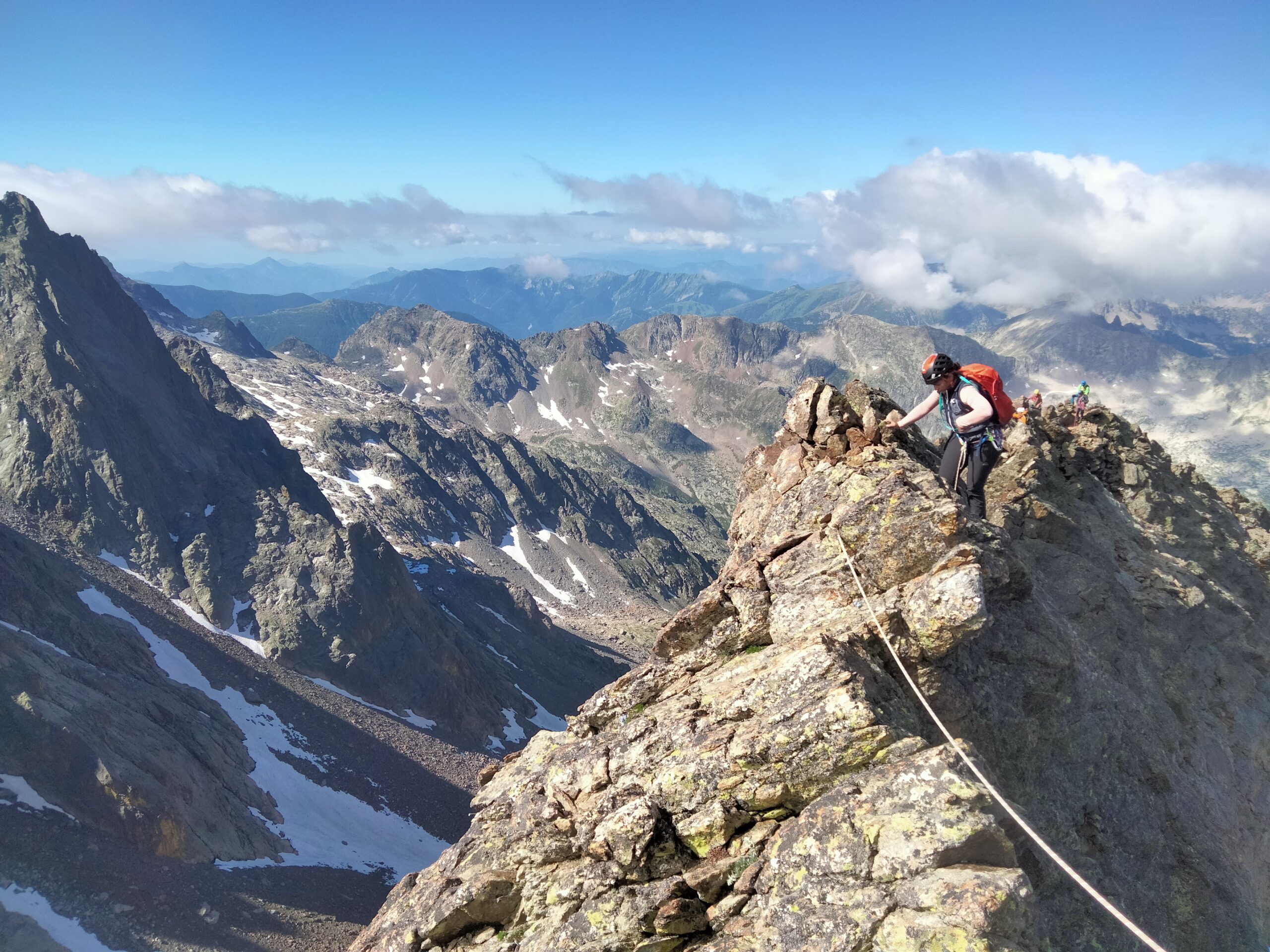 Saliti sabato pomeriggio ad un Remondino stracolmo e dormito fuori in tenda dopo una lauta cena. Salita al colletto di partenza evidente e anche abbastanza omettata. Cresta lunga e divertente, cambia spesso stile quindi in realtà non ci si annoia quasi mai. Sole dalla Purtscheller in poi, prima tutta in ombra. Molto bella la parte dopo la Genova, esposta e divertente. Come materiale (se non si vuole essere cautelativi per una ritirata), basta davvero una corda da 30m, 1 cordino e 1 rinvio, utile eventualmente anche qualche friend medio-piccolo ma ci si protegge benissimo con le lame in loco. Discesa come sempre lunghetta e dove si vede di tutto e di più.