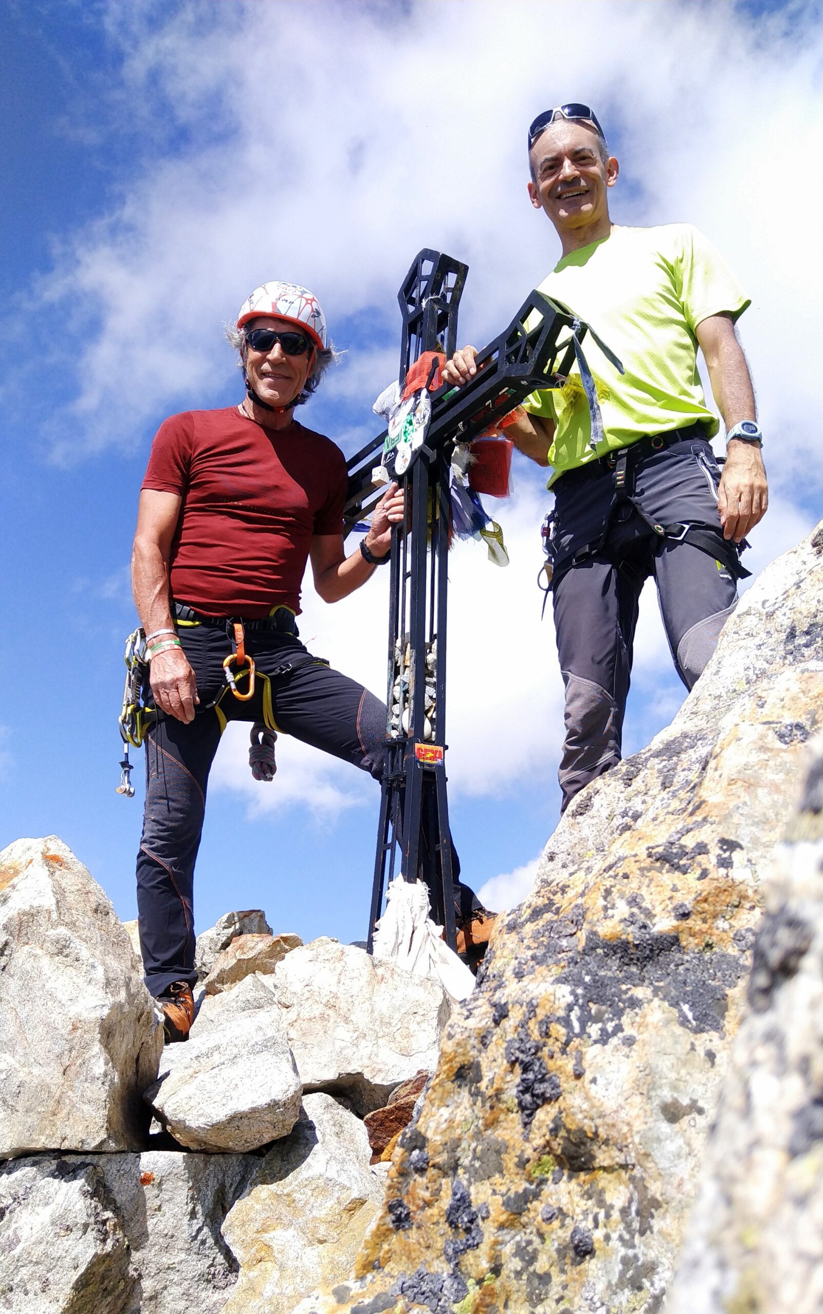 In vetta alle 15.30 (incredibilmente deserta, a parte uno stambecco domestico pochi metri più sotto) in una giornata spettacolare, senza una nuvola ma con una piacevolissima brezza rinfrescante.