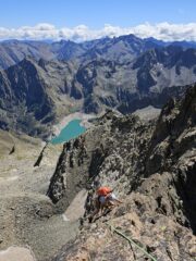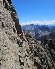 Proseguito seguendo fedelmente la relazione, molto ben fatta e precisa, con un’unica variazione dal blocco incastrato dopo Cima Genova, che abbiamo salito direttamente e poi disarrampicato (delicato, in loco comunque ci sono dei cordoni per un’eventuale calata).