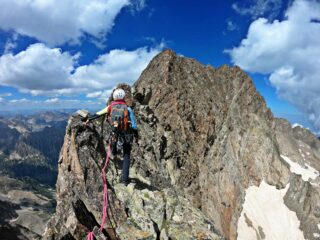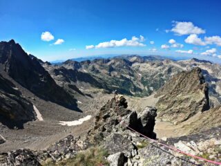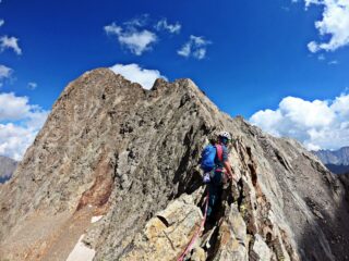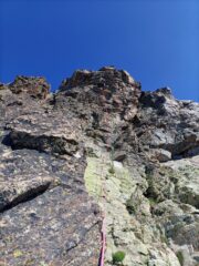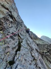 Primi 4 tiri più impegnativi ma anche i più belli, un bel V in ambiente con roccia super. Poi diventa più facile, abbiamo proseguito in conserva gli ultimi due tiri e poi proseguito sulla Sigismondi, che comunque rimane con qualche tratto esposto che richiede attenzione.