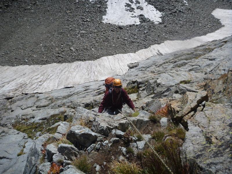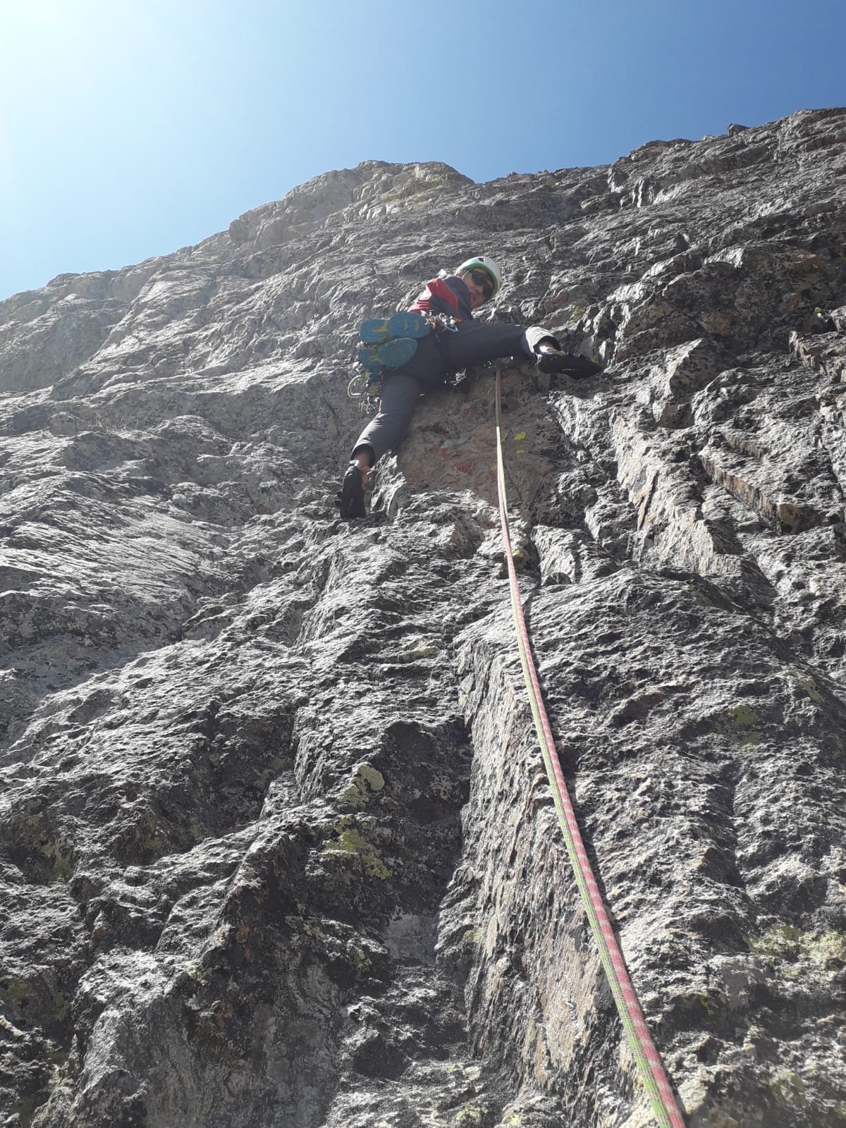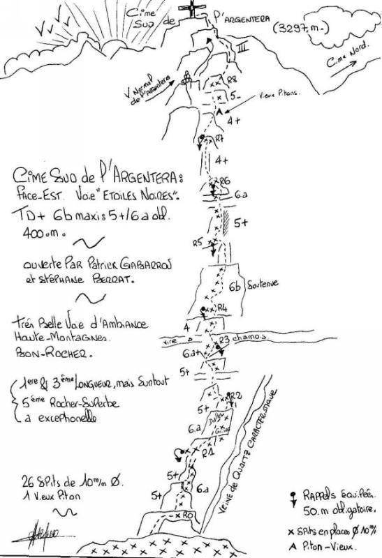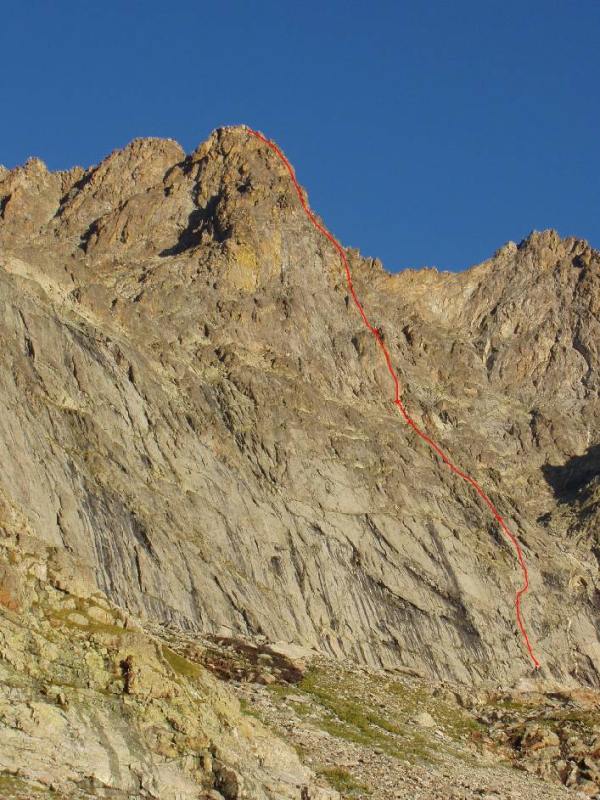 Attacco sopra un primo risalto di roccia, sopra il nevaio (spit con maillon) 20 mt. a sx della evidente vena di quarzo. Le soste sono tutte spittate ma attrezzate per le doppie solo fino alla n°7. Se si sale in vetta si scende a piedi dalla via normale (discesa comunque consigliata). I tiri più facili non sono spittati, comunque proteggibili con nut e friend.