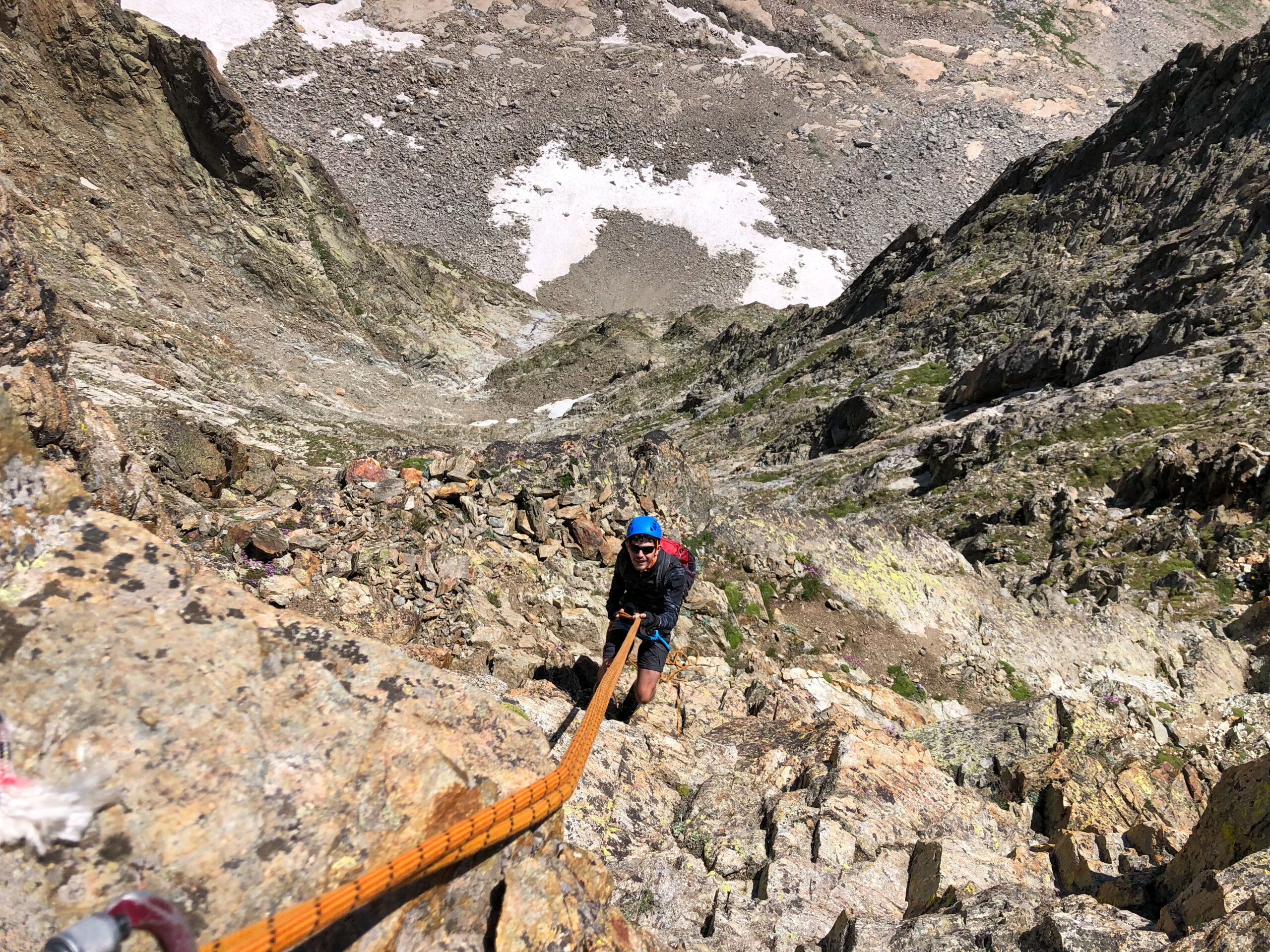 Gran tour in giornata con partenza e rientro a Terme di Valdieri. Saliti alla cima sud dal Remondino, traversata cima sud-cima nord e discesa verso il Morelli per il Passaggio del Porco. Alcuni traversi divertenti e diversi tratti di facile arrampicata. Nella traversata abbiamo fatto una doppia di 7-8 metri e subito dopo qualche passaggio in conserva. Itinerario asciutto con solo qualche nevaio residuo.