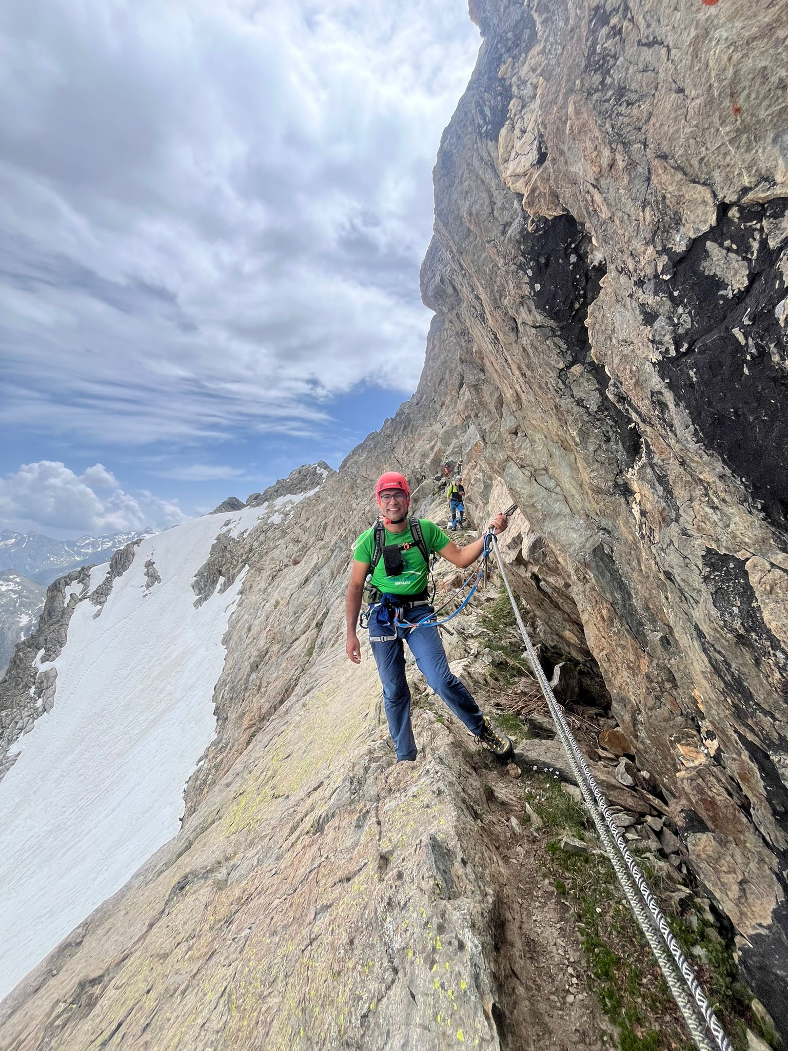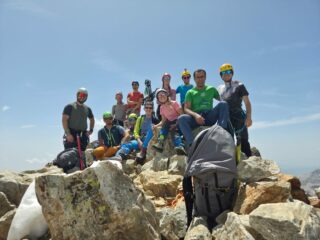 Canale dei Detriti praticamente pulito, ad eccezione di una lingua di neve evitabile. Dopo il colle c’è ancora neve sulla traccia ma si evita stando sulle roccette poco più in alto; cengia tutta pulita. Si trova neve all’ inizio del camino finale ma anche questa si può bypassare. Ramponi e picca portati inutilmente.