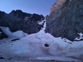 Che splendida traversata! Partiti da Genova nel primo pomeriggio, abbiamo raggiunto Terme per le 16.30 e siamo partiti alla volta del Bivacco Varrone in mezzo alle nuvole basse. Il sentiero/autostrada è eterno, non sale mai in modo deciso ma perlomeno non è faticoso, e dopo un’infinita serie di tornanti finalmente sbuca al Gias Lagarot, da dove dovrebbe già vedersi sia il Canale che il Bivacco (a noi non pervenuti vista la visibilità 0). Da lì in ogni caso basta seguire le evidenti indicazioni e segnavia per arrivare in breve al Bivacco Varrone (2/2.30h da Terme, per quanto ci si possa mettere molto meno bisogna calcolare lo zaino pesante ed il caldo opprimente lungo il percorso). Finalmente dal Bivacco le nubi si diradano e ci mostrano il magnifico panorama intorno a noi e il lunghissimo Canale che ci aspetta l’indomani. Il Bivacco è tenuto abbastanza bene, c’è un po’di rumenta lasciata vicino al tavolo da poco rispettosi visitatori precedenti, mentre gli 8 letti presenti (+ 2 a doppio materasso, in caso ci fossero più di 8 persone contemporaneamente) sono puliti e dotati di almeno 1 coperta pesante ciascuno; unico difetto, è estremamente umido e presenta il caratteristico odore corrispondente, inoltre i materassi sembrano quasi essere “bagnati”: in ogni caso, è solo l’impressione. Non è presente l’angolo cucina, ma sono presenti posate ed anche alcune confezioni di cibo liofilizzato e non, qualcuna scaduta e qualche altra no. Vista l’impegnativa giornata che ci attendeva l’indomani, abbiamo giusto aspettato il tramonto per vedere i suoi magnifici colori illuminare in modo spettacolare tutte le ardite vette attorno a noi, e siamo andati a dormire presto, puntando la sveglia alle 4. L’indomani mattina, invece che il cielo stellato ad attenderci era una notevole coltre di nubi, che per poco non mi fa desistere: se è così già alle 4 del mattino, figurarsi nel pomeriggio! Decidiamo comunque di andare perlomeno fino all’attacco del Canale per la decisione finale e, incredibilmente, una volta arrivati lì dopo 30 min. di marcia su pietraia, le nuvole si diradano per lasciar spazio ad una giornata splendida che ci accompagnerà fino a tardo pomeriggio. Dal Bivacco all’attacco del Canale dovrebbe essere presente una traccia, che però alla luce delle frontali noi non abbiamo trovato, non sapendo neanche dove guardare non essendoci mai stati. Una volta calzati i ramponi e legatici con la corda, cominciamo la salita su neve molto ben assestata ma senza una traccia da seguire: poco male, la direzione è abbastanza ovvia. Arrivati agli isolotti rocciosi a circa 1/3 del canale decidiamo di traversare subito nella parte sinistra del canale, dato che da sotto ci sembrava leggermente meno pendente e quindi meno faticosa: dopo 5 metri facili su roccia, sbuchiamo sull’altro ramo e continuiamo la salita. Quando i due rami si ricongiungono, la pendenza aumenta fino a 45/50° circa, ma da qui troviamo come una manna dal cielo una traccia molto ben marcata che sotto non c’era, e che seguiamo avidamente fino in cima al Colletto Coolidge. Che panorama pazzesco! In queste condizioni per fare il Canale ci vogliono 3/3.30h, ma non è che siamo troppo allenati quindi magari qualcuno più forte di noi può metterci anche meno. Da qui, pausa ristoratrice veloce e si parte per la traversata: come al solito, siamo riusciti a sbagliare subito e salire in cresta molto prima della Cima Nord (credevamo che la croce che si vede fin dal Colletto fosse quella della Sud e quindi siamo saliti subito pensando che la Nord fosse sopra di noi), ed abbiamo proseguito in cresta per facili rocce fino in Vetta alla Nord; in realtà, bisognerebbe stare sulla cengia che taglia la parete fino sotto la Cima e solo allora salire in Vetta. Foto di rito e firma sul libro e si riparte alla volta della Sud: arrivare fino alla forcella è relativamente semplice, qualche placca liscia ma nulla di particolarmente difficile, mentre il camino per tornare in cresta dal colletto non scherza molto: già per trovarlo bisogna stare molto attenti, considerare circa 15 metri sulla cengia che parte dalla forcella e da lì è il primo passaggio (verticale) che sembra percorribile con difficoltà di II/II+; usciti quasi in cresta ci si ritrova davanti ad una paretina verticale di 2 metri protetta da un chiodo che a parere del sottoscritto, dato l’ambiente severo e forse anche la stanchezza, è più di III: abbiamo fatto un micro tiro di corda con sosta su spuntone in cresta (più avanti sono presenti dei cordoni, ma sono troppo scomodi rispetto a dove si sbuca), ed una volta giunti qui per facili massi si giunge finalmente al Tetto delle Alpi Marittime (calcolare circa 1.15/1.30h dal Colletto, meno se si è sciolti su questo tipo di terreno). Ma la gita è solo a metà, e perdere la concentrazione ora può essere molto pericoloso: per rientrare, occorre scendere lungo la normale dell’Argentera, itinerario non banale che al momento presenta chiazze di neve in punti che obbligano a passaggi d’arrampicata in discesa su placche non proprio facilissime. Raggiunta la più facile cengia sottostante, si arriva presto al Canale dei Detriti, eterno ma perlomeno completamente sgombro da neve fino quasi alla fine (comunque possibile rimanere su sfasciumi deviando qua e là sul fondo). Davvero molta attenzione se ci fosse qualcuno sotto al Canale, lanciare giù massi anche di notevoli dimensioni è quasi la normalità su questo terreno. Giunti in fondo, per grosse pietraie si raggiunge il Rifugio Remondino, attualmente chiuso, dove è presente una provvidenziale fontana ed anche un nutrito gruppo di giovani stambecchi con cuccioli, che vivono proprio li: occhio a non infastidire troppo per evitare dolorosi incontri/scontri (circa 2/2.30 h dalla Vetta, noi ci abbiamo messo di più perché davvero stanchi e senza liquidi). Da qui basta scendere per il sentiero che perde velocemente dislivello fino ad arrivare a Pian della C
