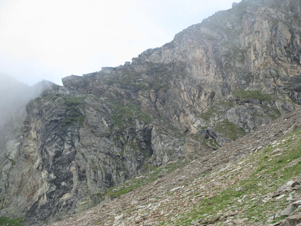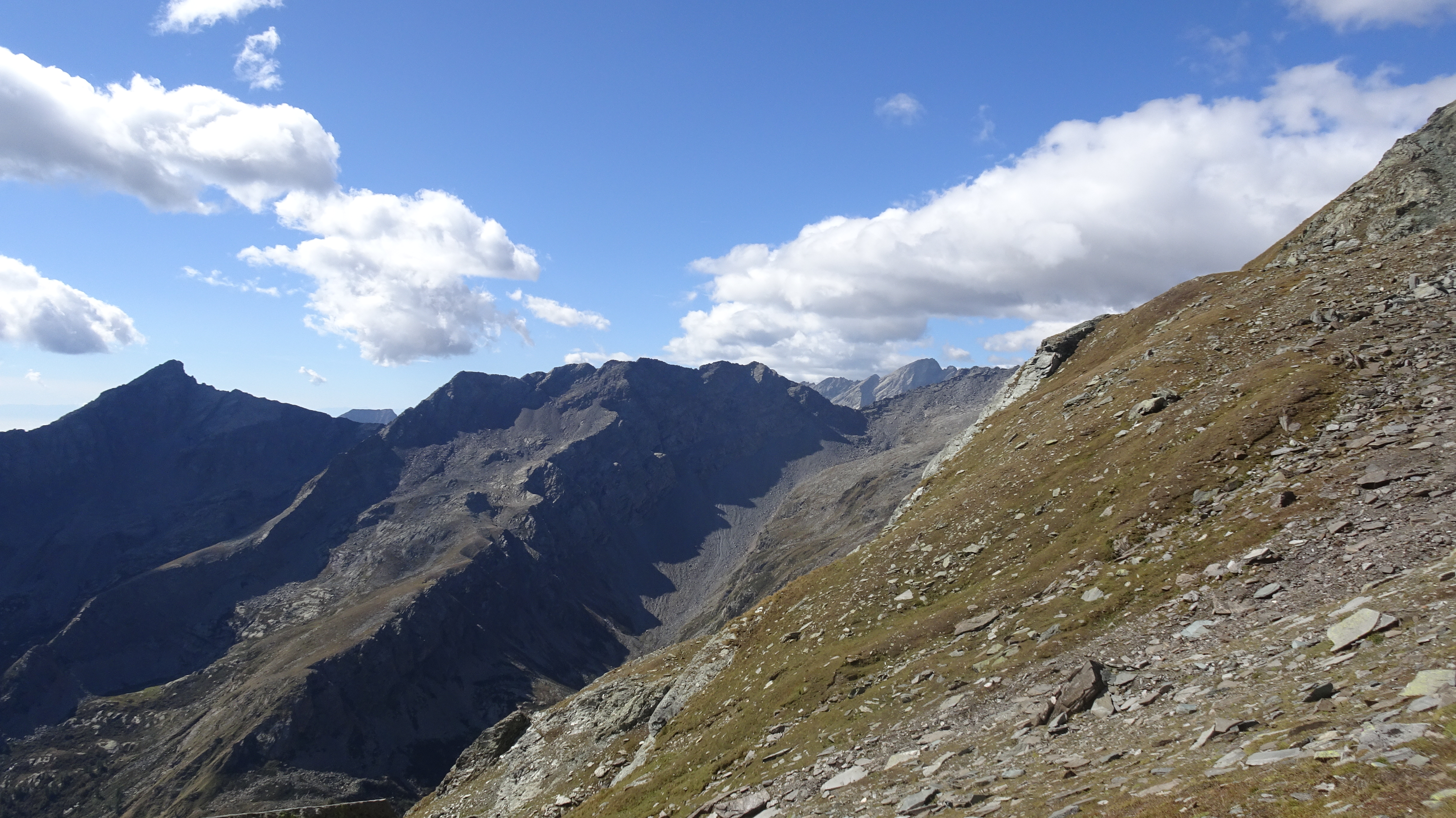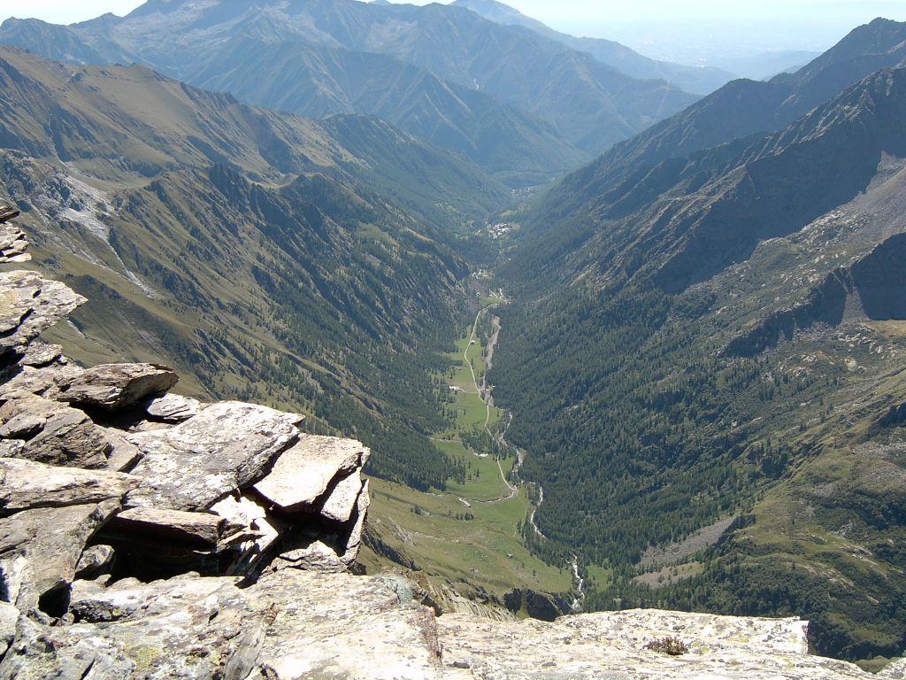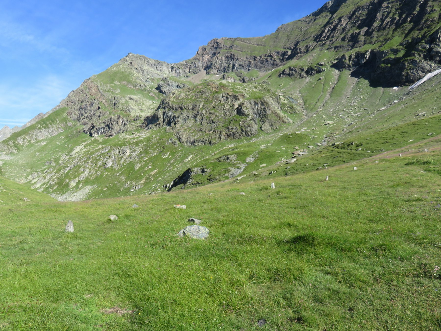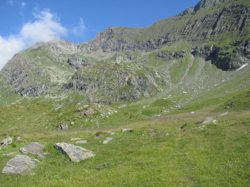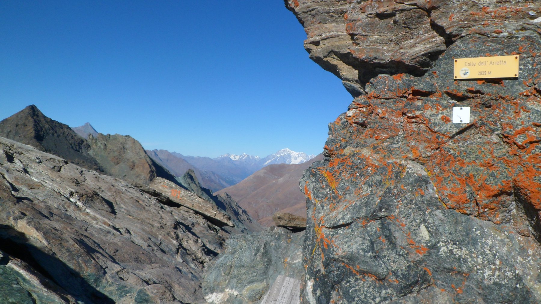 Dal parcheggio dopo Campiglia Soana, si segue la pista sterrata e in parte cementata, che dopo alcuni tratti piuttosto ripidi si addentra nel bellissimo Piano d’Azaria. Quasi subito a destra si incontra il cartello indicante il sentiero per San Besso sulla destra, lo si ignora (si scenderà da qui al ritorno) proseguendo lungo la sterrata ora pianeggiante, superando gli alpeggi Azaria e raggiungendo infine il termine della vallata nei pressi dell’Alpe Barmaion, visibile a destra leggermente più in alto della strada. Qui i cartelli indicano il Colle dell’Arietta, il sentiero senza raggiungere l’alpeggio (si mantiene sul lato opposto del combale) inizia a salire con buona pendenza a serpentine nel lariceto, inizialmente fitto poi via via più rado fino ad uscirne completamente. Si prosegue sempre a serpentine su buon sentiero ottimamente segnalato per prati molto panoramici, fino a giungere nei pressi delle Grange Arietta 2288 m; nel pianoro sottostante incontriamo le paline segnaletiche con il bivio per San Besso a destra, noi invece continuiamo a sinistra, passando accanto alle baite, in direzione del Colle dell’Arietta, già visibile. Superato un dosso erboso si entra nel bel Pian dei Morti o Pian della Polenta, qui il sentiero è meno evidente (erboso) ma ci sono segni di vernice ogni 10 metri, impossibile perdersi anche con fitta nebbia. Superato il piano la salita non darà più tregua fino al colle. Si sale un costone erboso dalla pendenza sostenuta attraversando di tanto in tanto qualche fascia detritica; raggiunta una selletta il terreno spiana momentaneamente e inizia, ormai a quota 2800 m, ad attraversare una fascia di pietrame e detriti, puntando all’imbocco del canalino che dà accesso al colle. Raggiunto il canale, attrezzato con alcune catene che risultano superflue con terreno asciutto (il sentiero è ampio seppur ripido, non c’è esposizione, attenzione solo ad eventuali cadute di pietre smosse da camosci sulle pareti sovrastanti) ed in breve si arriva allo stretto intaglio del Colle dell’Arietta 2938 m, presente una campana.
