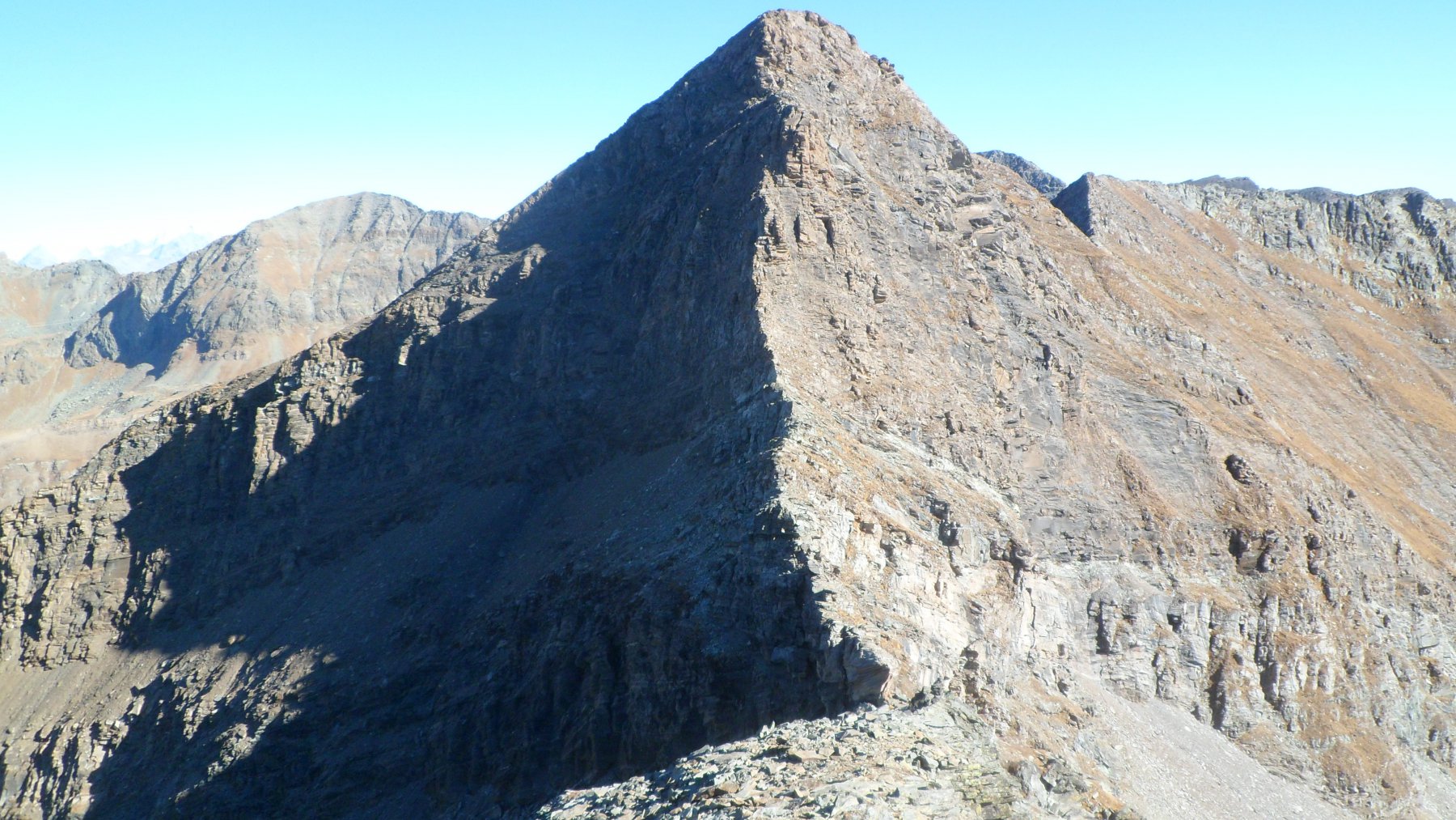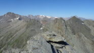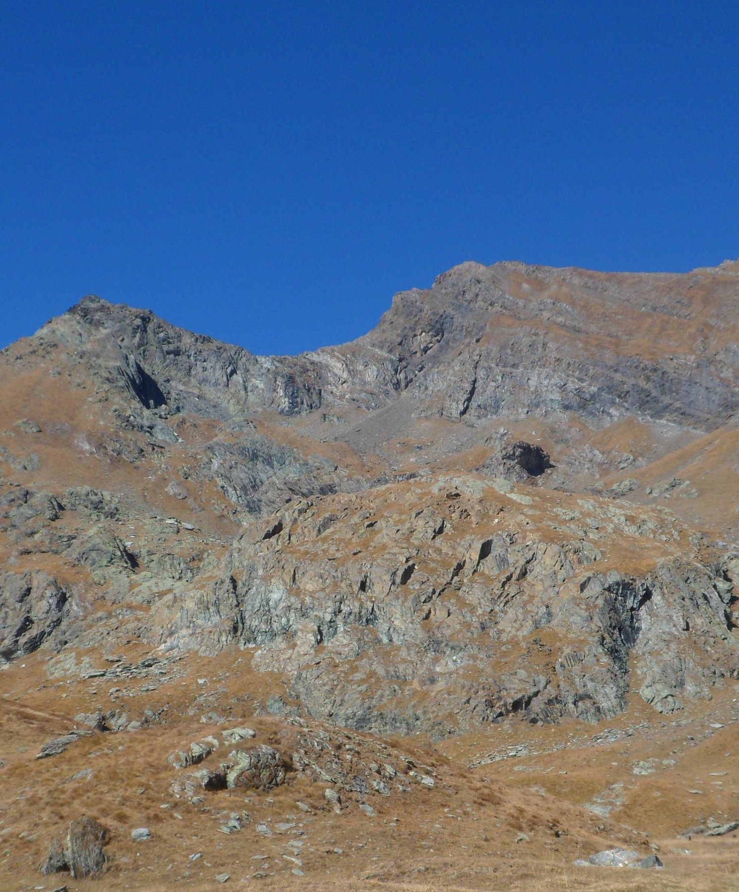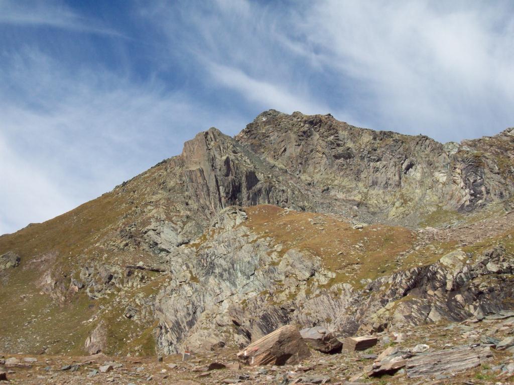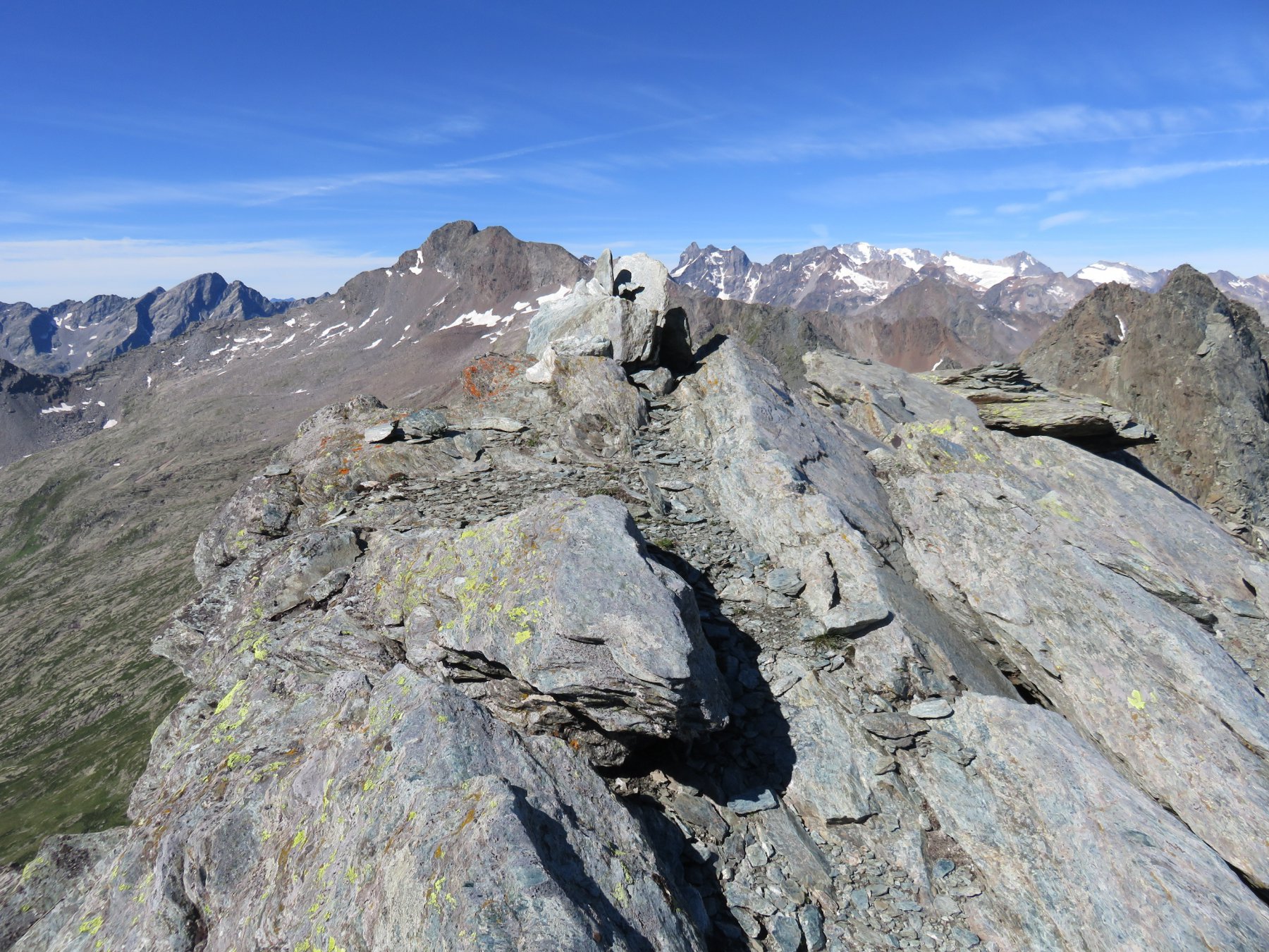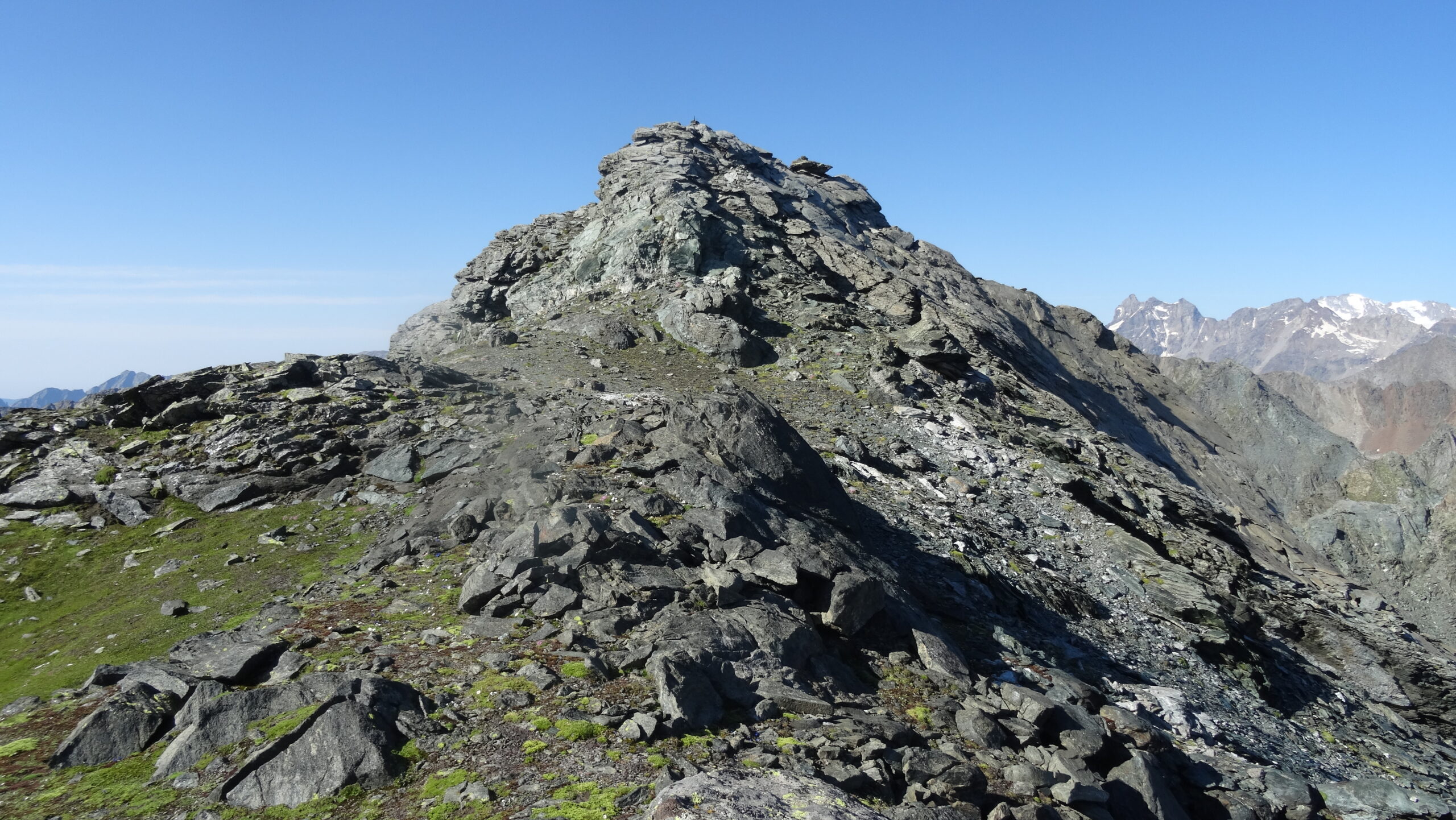 Ora non resta che abbandonare il sentiero che scende su Lillaz (visibile il Rifugio Sogno di Berdzè) per continuare a sinistra attraversando una fascia di pietrame esposta a nord, per aggirare il primo tratto di cresta roccioso piuttosto affilato. attraversata la breve pietraia ci si riporta subito in cresta, ora ampia e costituita da massi accatastati non sempre stabili. Poco dopo il terreno diventa meno accidentato fino ad un punto in cui la cresta diventa nuovamente rocciosa, ma si aggira l’ostacolo sia su terriccio ed erba dal versante sud, sia per tracce nel pietrame sul versante nord; in entrambi i casi si ritorna rapidamente in cresta nei pressi di un bel ripiano a pochi passi dalla cima. Qui per cresta superando alcuni semplici gradini rocciosi, si arriva in vetta 3001 m