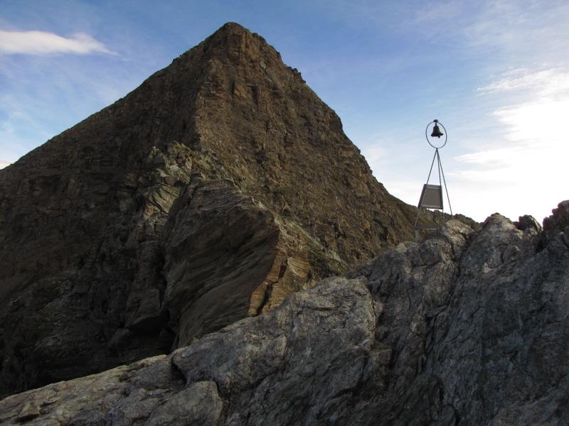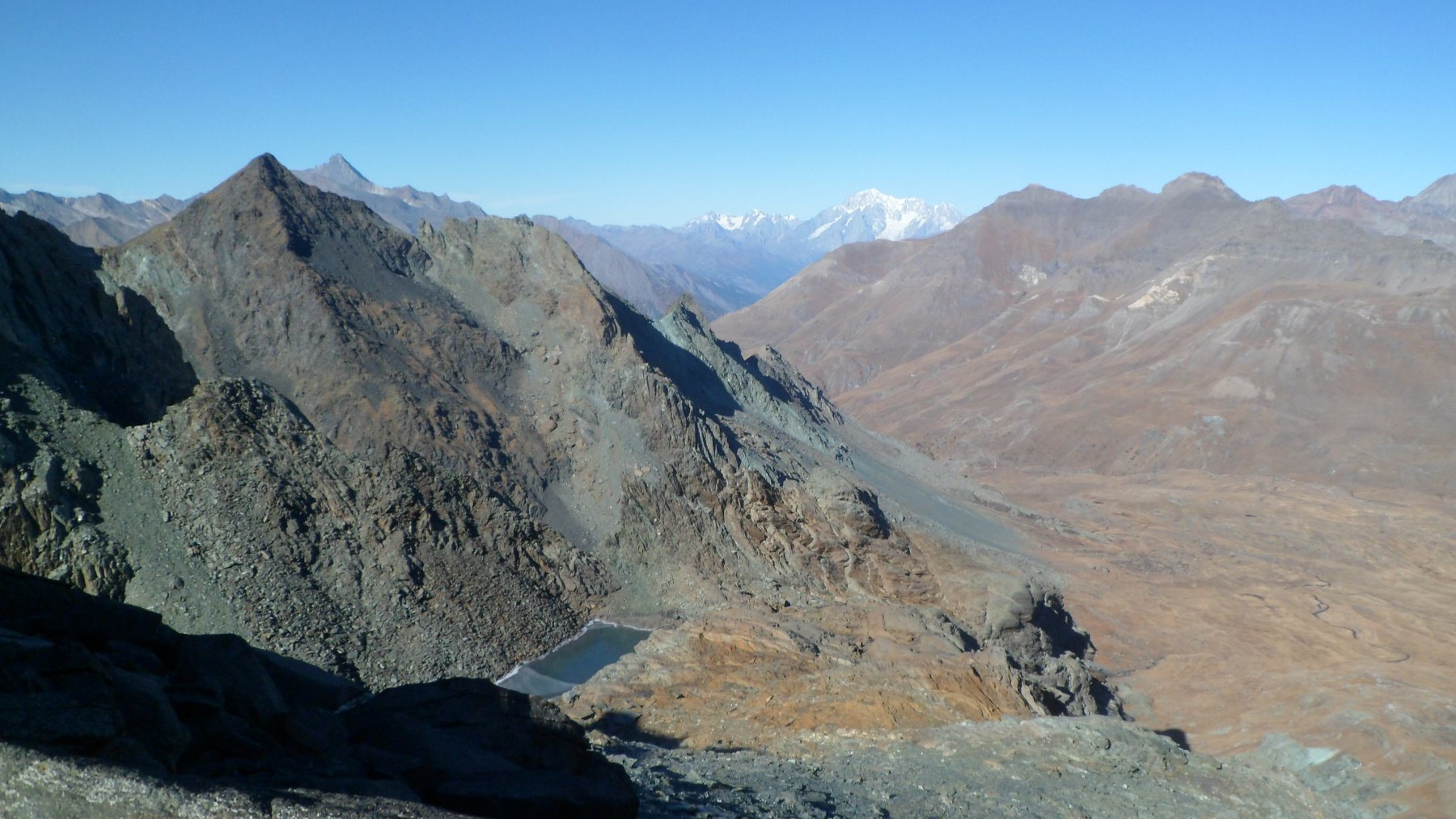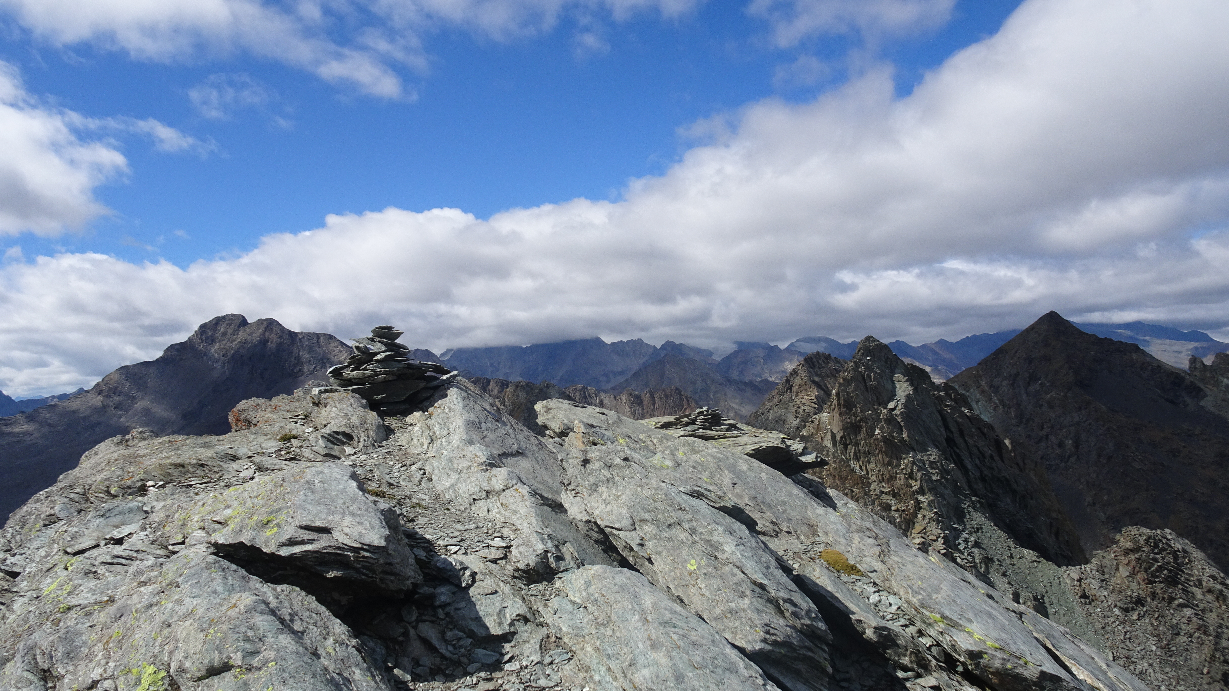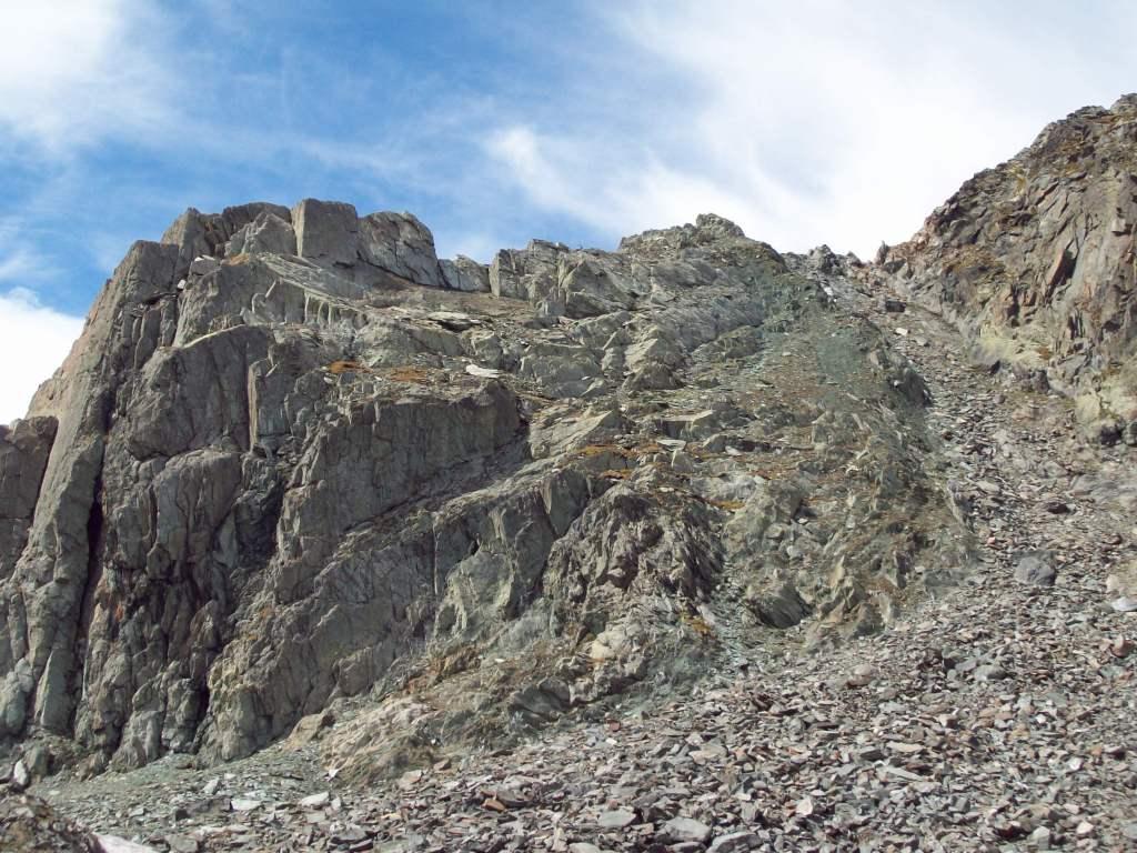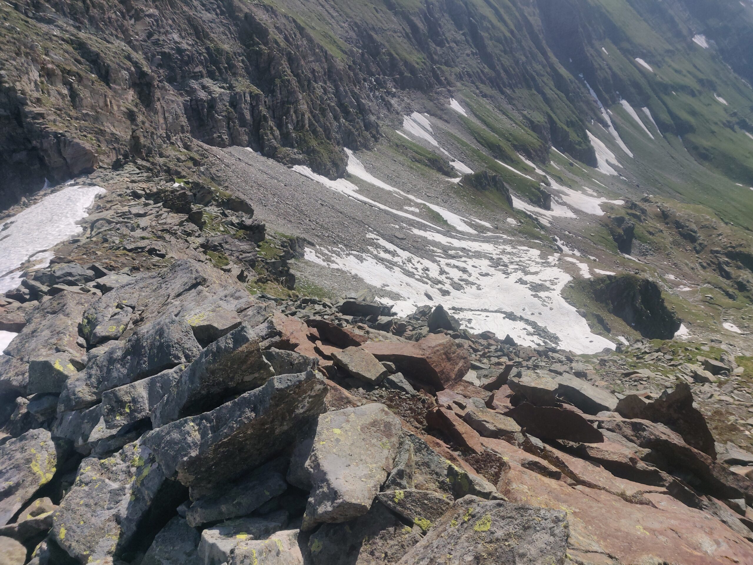 Ora non resta che abbandonare il sentiero che scende su Lillaz (visibile il Rifugio Sogno di Berdzè) per continuare a sinistra attraversando una fascia di pietrame esposta a nord, per aggirare il primo tratto di cresta roccioso piuttosto affilato. attraversata la breve pietraia ci si riporta subito in cresta, ora ampia e costituita da massi accatastati non sempre stabili. Poco dopo il terreno diventa meno accidentato fino ad un punto in cui la cresta diventa nuovamente rocciosa, ma si aggira l’ostacolo sia su terriccio ed erba dal versante sud, sia per tracce nel pietrame sul versante nord; in entrambi i casi si ritorna rapidamente in cresta nei pressi di un bel ripiano a pochi passi dalla cima. Qui per cresta superando alcuni semplici gradini rocciosi, si arriva in vetta 3001 m