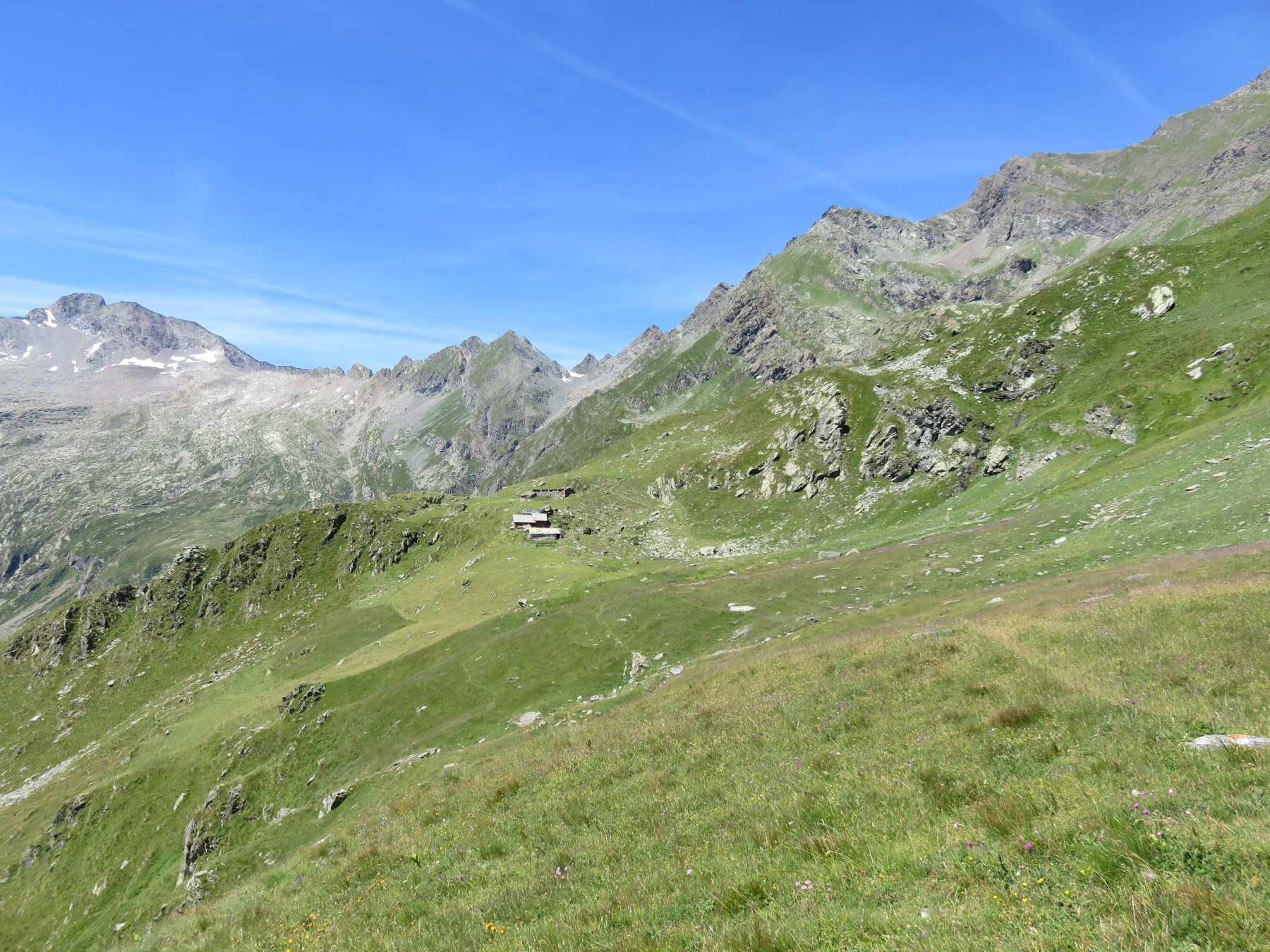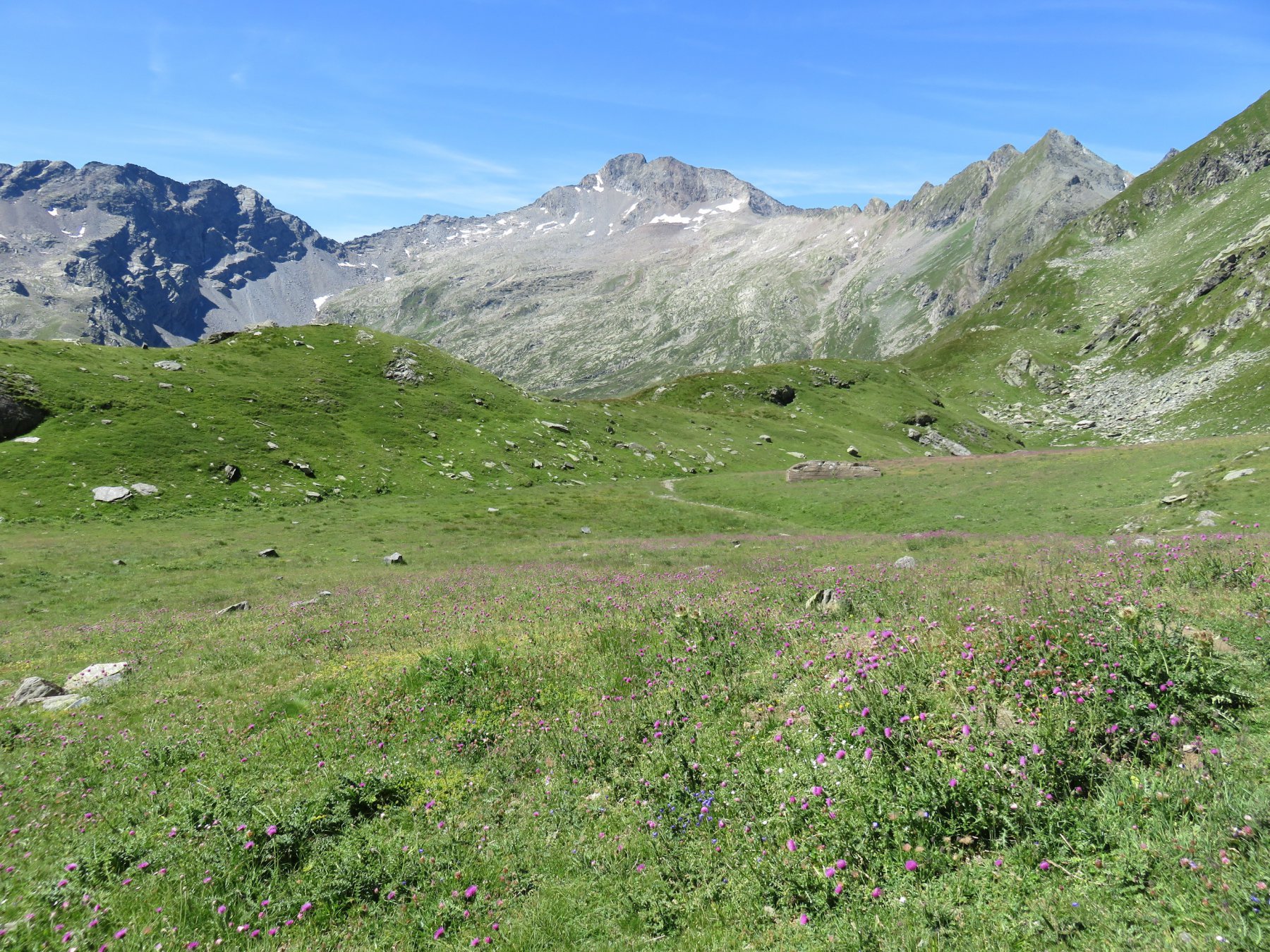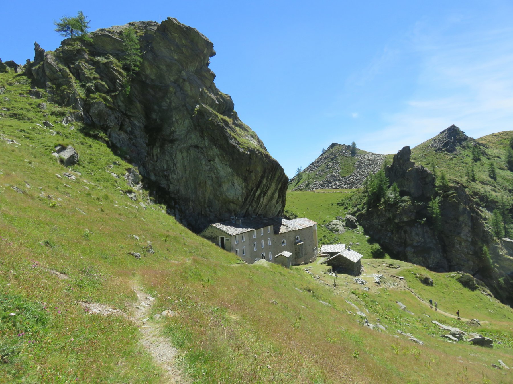 Questo sentiero compie un lungo mezza costa tagliando tutto il versante sud-ovest della Punta dell’Asgelas, c’è qualche breve discesa alternata a delle risalite non ripide, ma che globalmente aggiungono circa 100 m di dislivello alla gita. Dopo aver attraversato una serie di canaloni un’ultima risalita consente di arrivare al colletto Balma-Arietta 2335 m, dal quale si inizia a scendere dolcemente nel valloncello che, dopo aver toccato l’Alpe della Balma 2147 m, attraversa un altopiano erboso per poi arrivare finalmente al Santuario di San Besso 2019 m. Da qui si scende a CAmpiglia Soana per il bel sentiero nel valloncello sottostante, e poi con numerose svolte tra prati e larici, fino ad incontrare la stradina all’inizio del Piano d’Azaria, già percorsa all’andata.