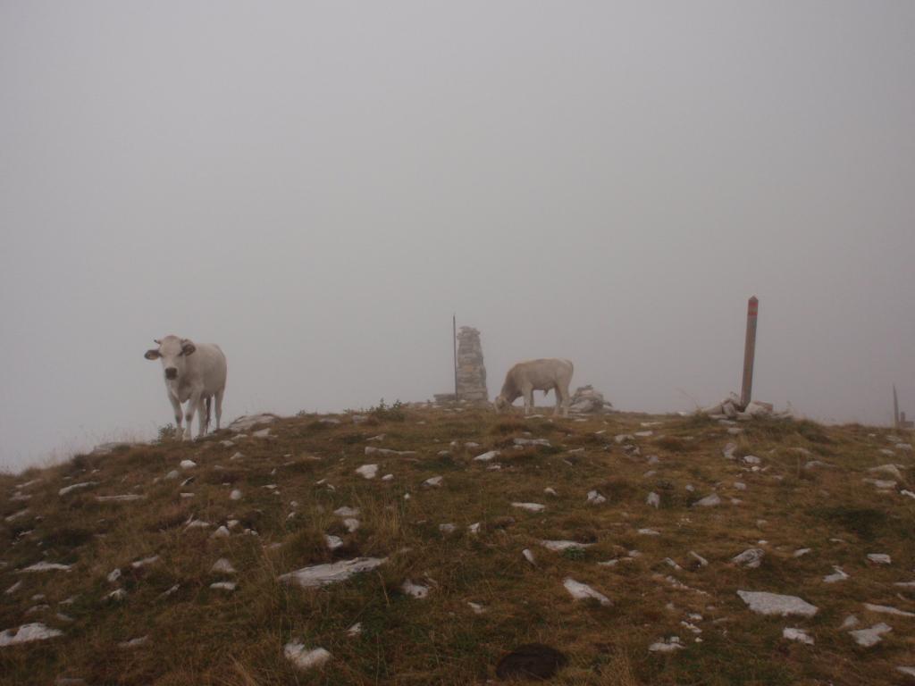 Gita pomeridiana, approfittando di una tregua meteo che pero’ è durata poco,giusto il tempo di arrivare sulla cima e poi di nuovo pioggia e nebbia.Partito dal Colle Caprauna alle 14, con un passo quasi da corsa in montagna,salito prima al Monte della Guardia,alle 16 ero gia’ in auto.Oggi nessuno in giro,d’altronde con un simile tempo..Sulla cima mi hanno tenuto compagnia alcune mucche e vitelli,volevo passare al nuovo Rifugio Pian Dell’Arma ma la pioggia mi ha fatto desistere,sarà per un’altra volta