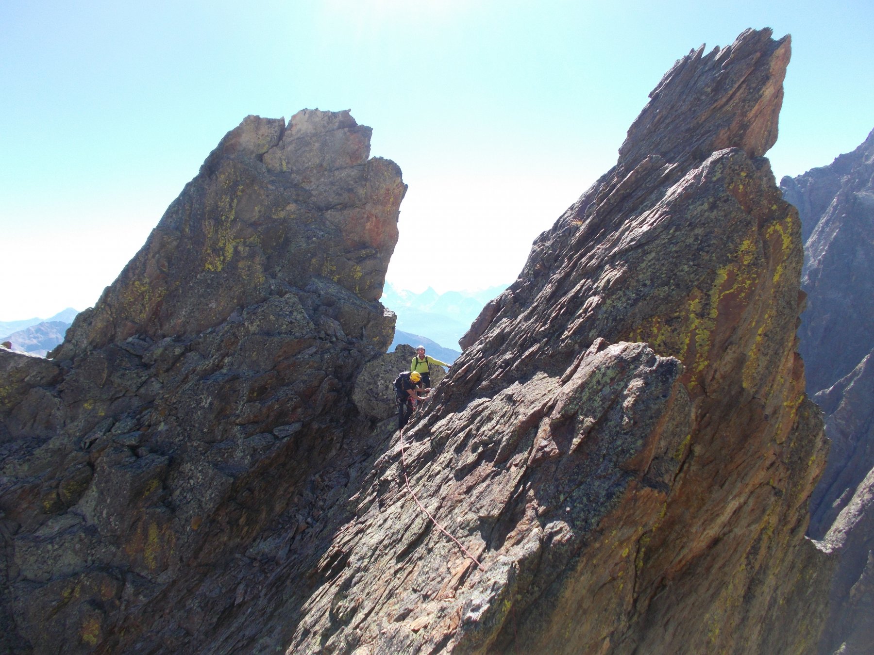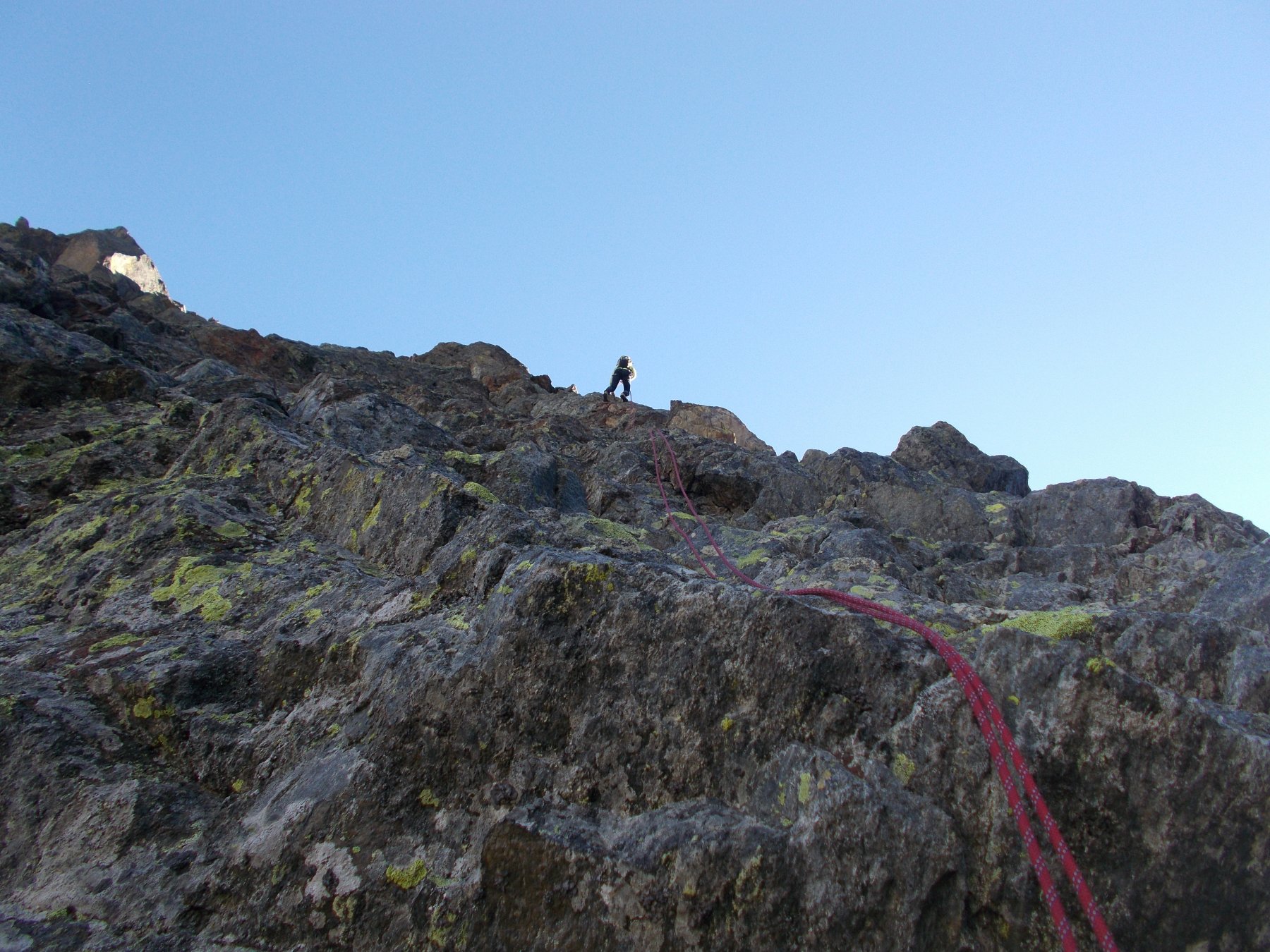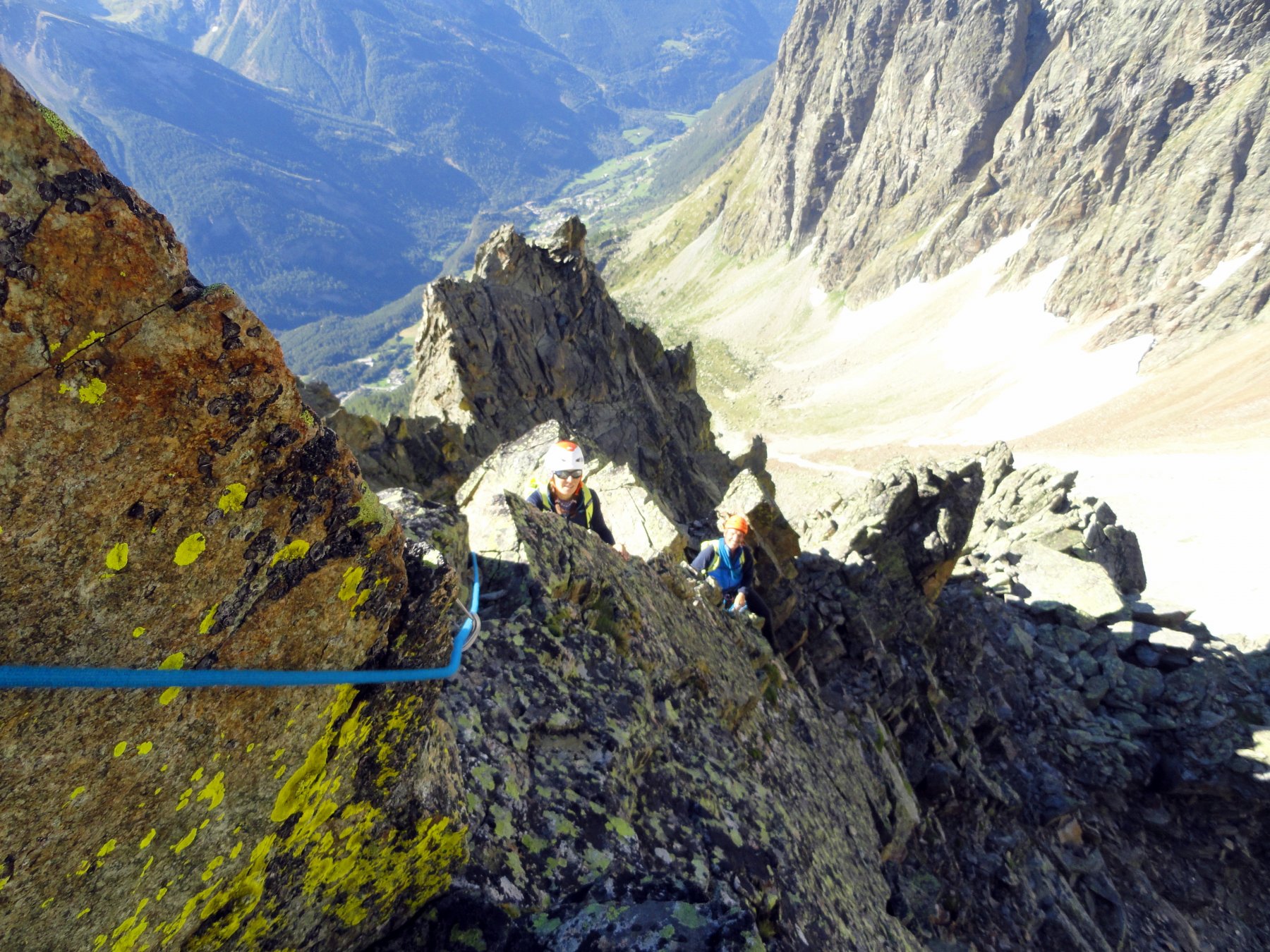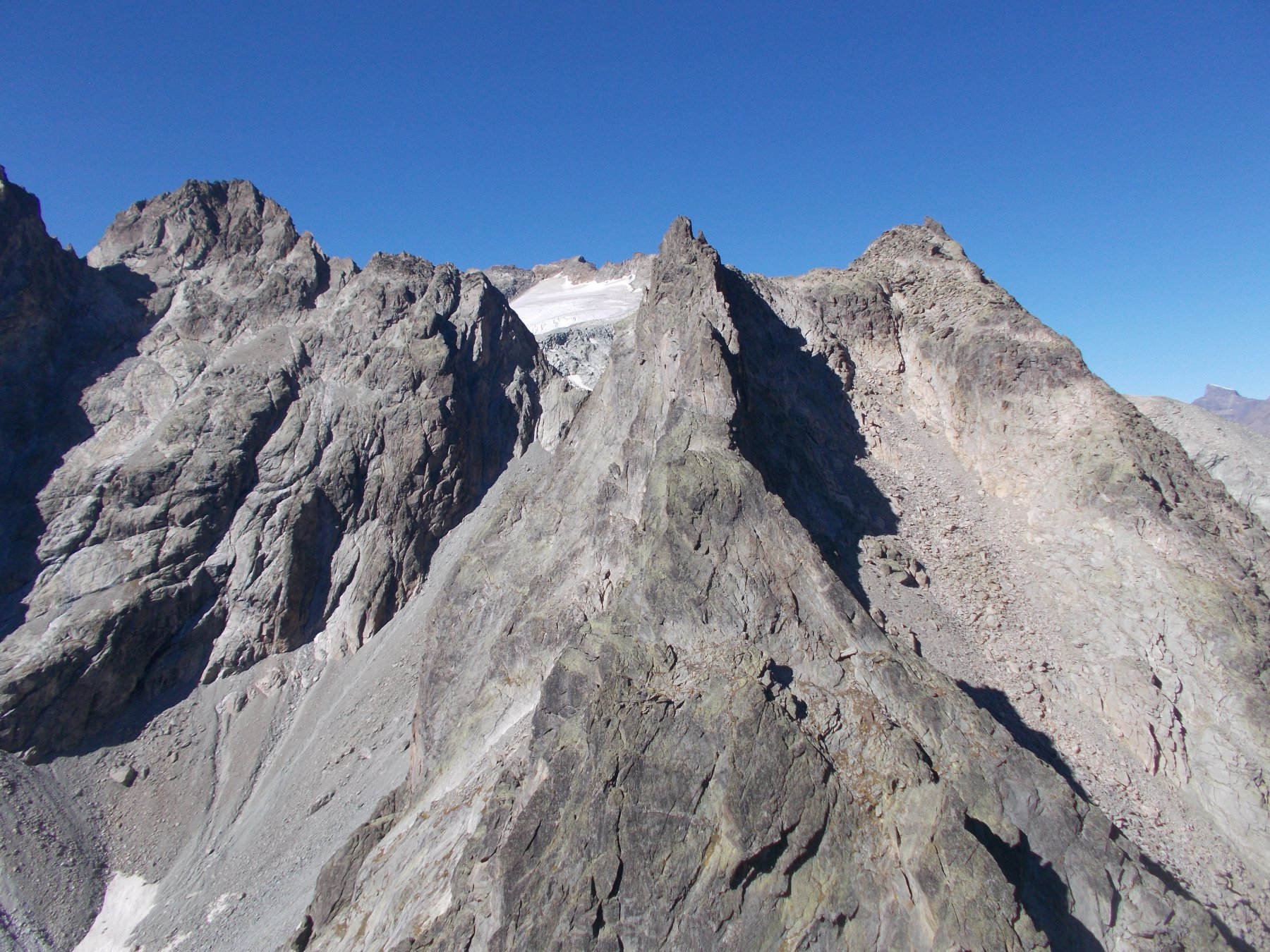 Dalla sua cima una calata porta all’intaglio precedente la Punta Norat 2895 m, che si può scalare (e poi scendere con una breve doppia) o aggirare comodamente sul versante Ovest con una cengia, per proseguire sul filo (III) e guadagnare la Punta D. Charrey 2897 m. Guadagnare l’intaglio successivo con una calata di 15m circa e salire sulla regolare cresta di roccia solida (II) fino al Pic de la Vierge 2940 m, da cui brevemente e facilmente (I-II, 2 fix) alla sommità della Vierge.