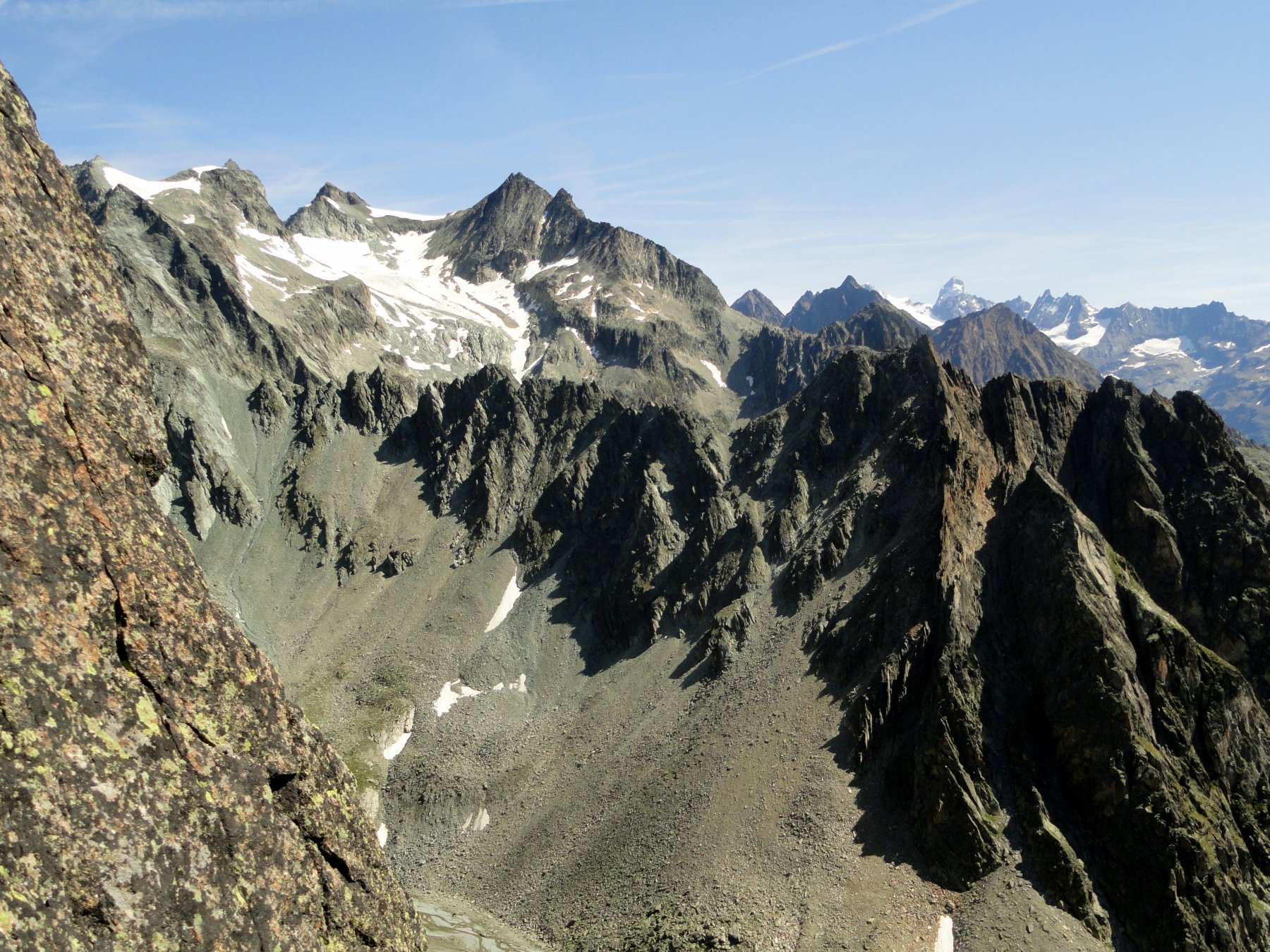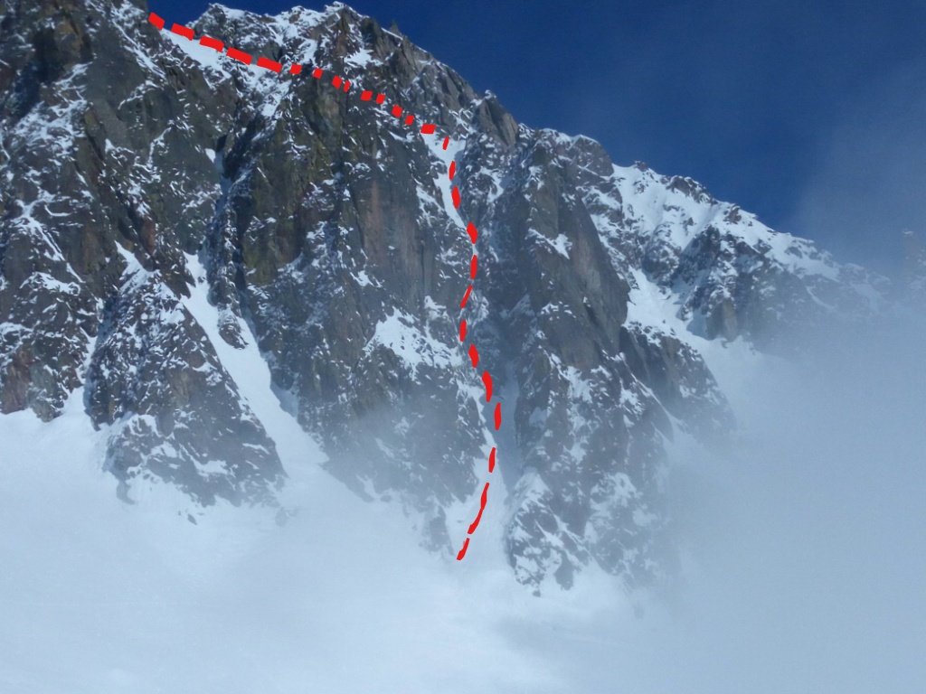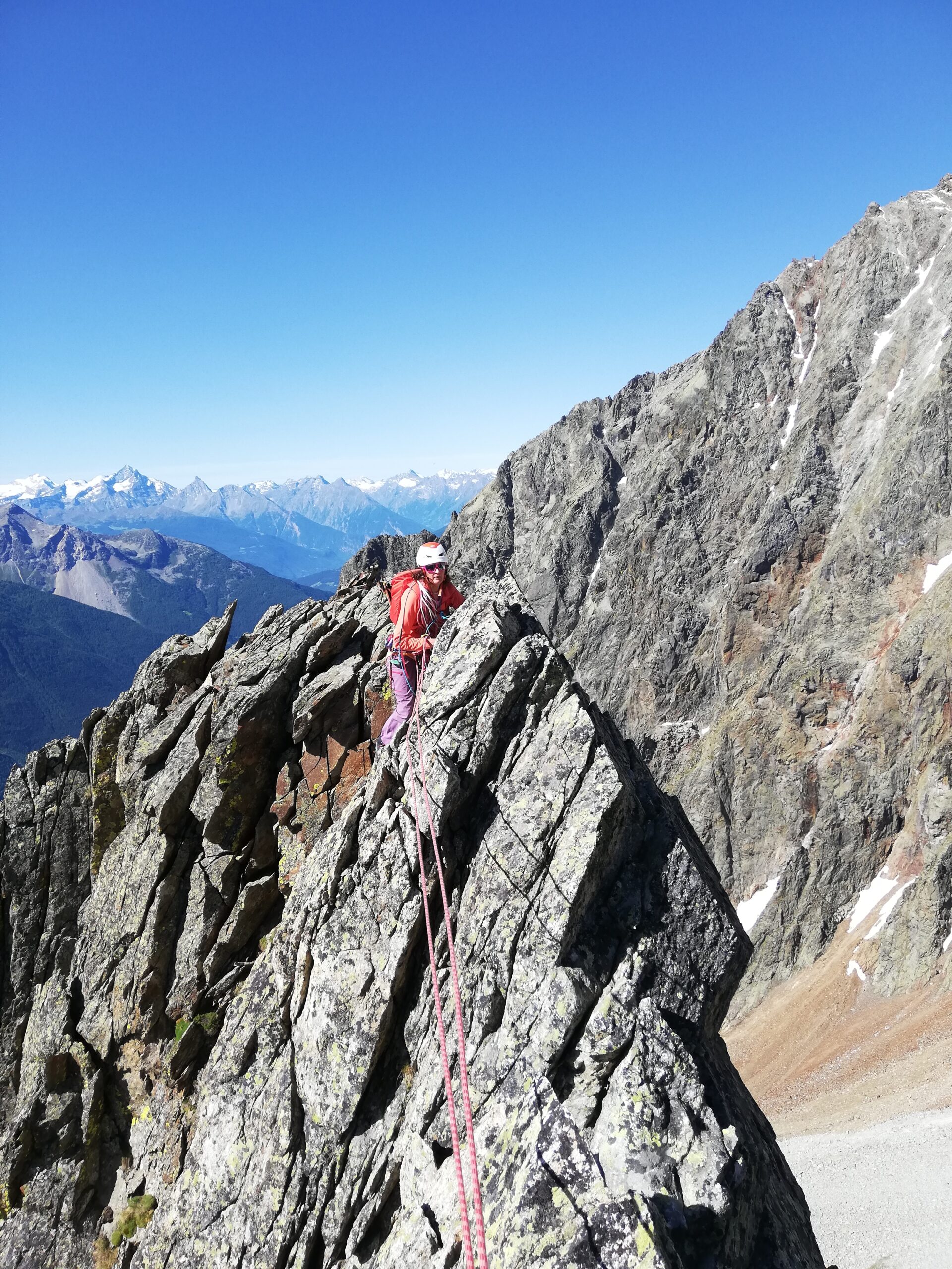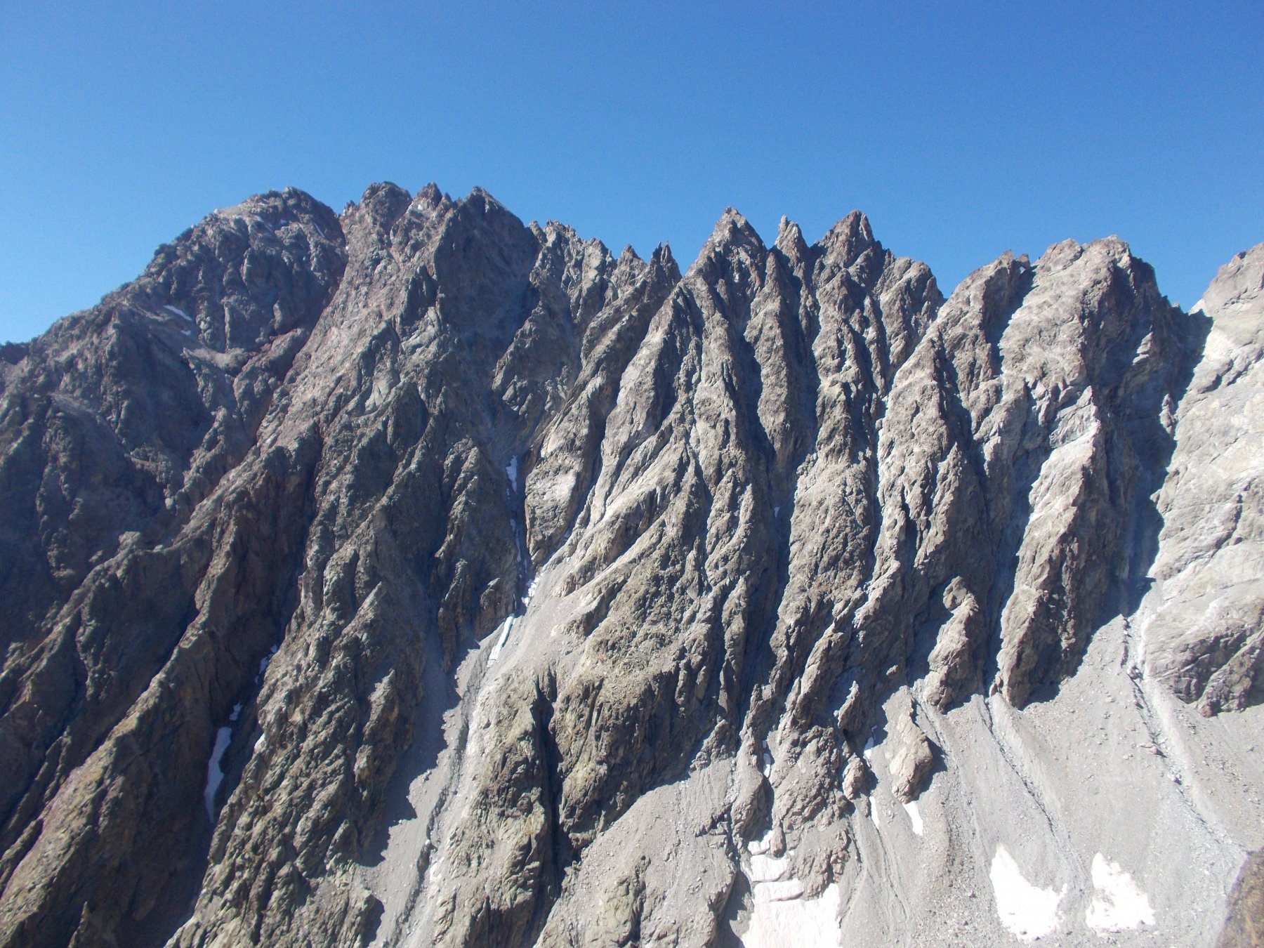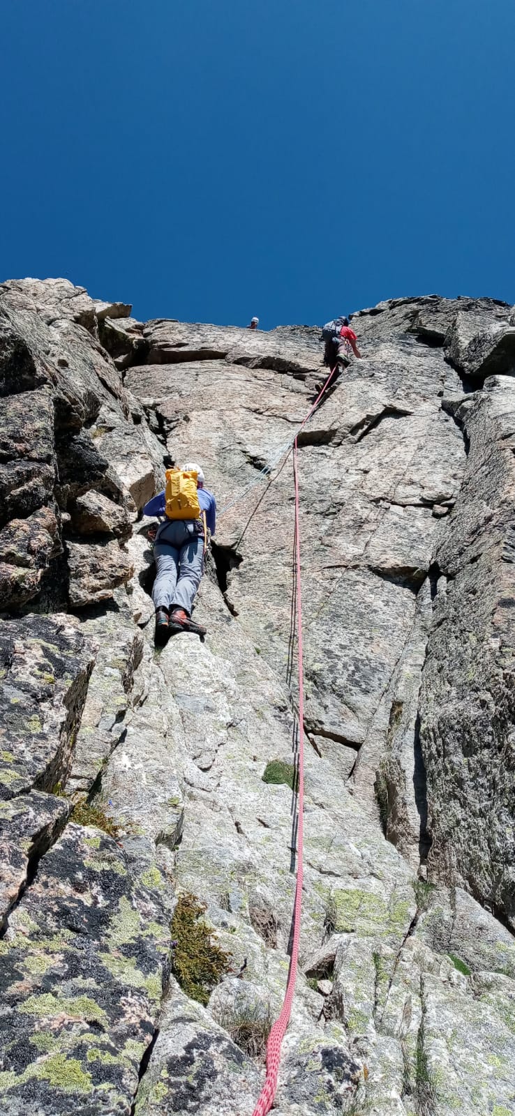 Dalla sua cima una calata porta all’intaglio precedente la Punta Norat 2895 m, che si può scalare (e poi scendere con una breve doppia) o aggirare comodamente sul versante Ovest con una cengia, per proseguire sul filo (III) e guadagnare la Punta D. Charrey 2897 m. Guadagnare l’intaglio successivo con una calata di 15m circa e salire sulla regolare cresta di roccia solida (II) fino al Pic de la Vierge 2940 m, da cui brevemente e facilmente (I-II, 2 fix) alla sommità della Vierge.