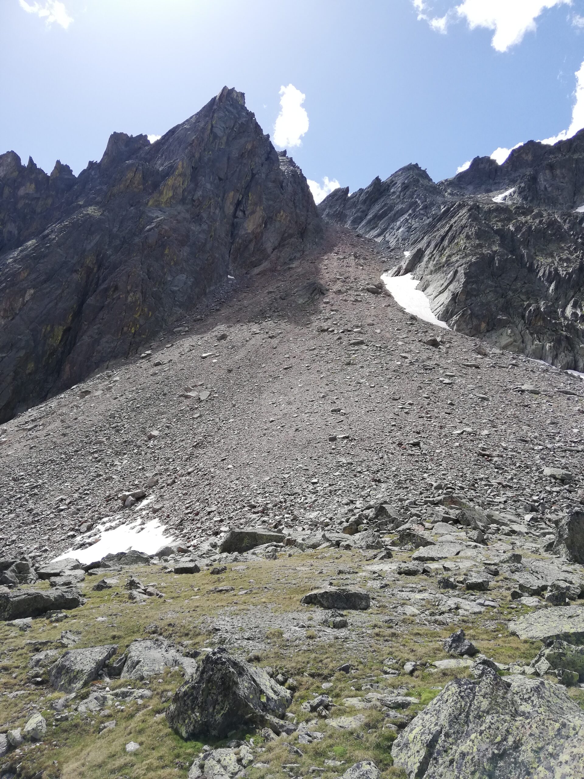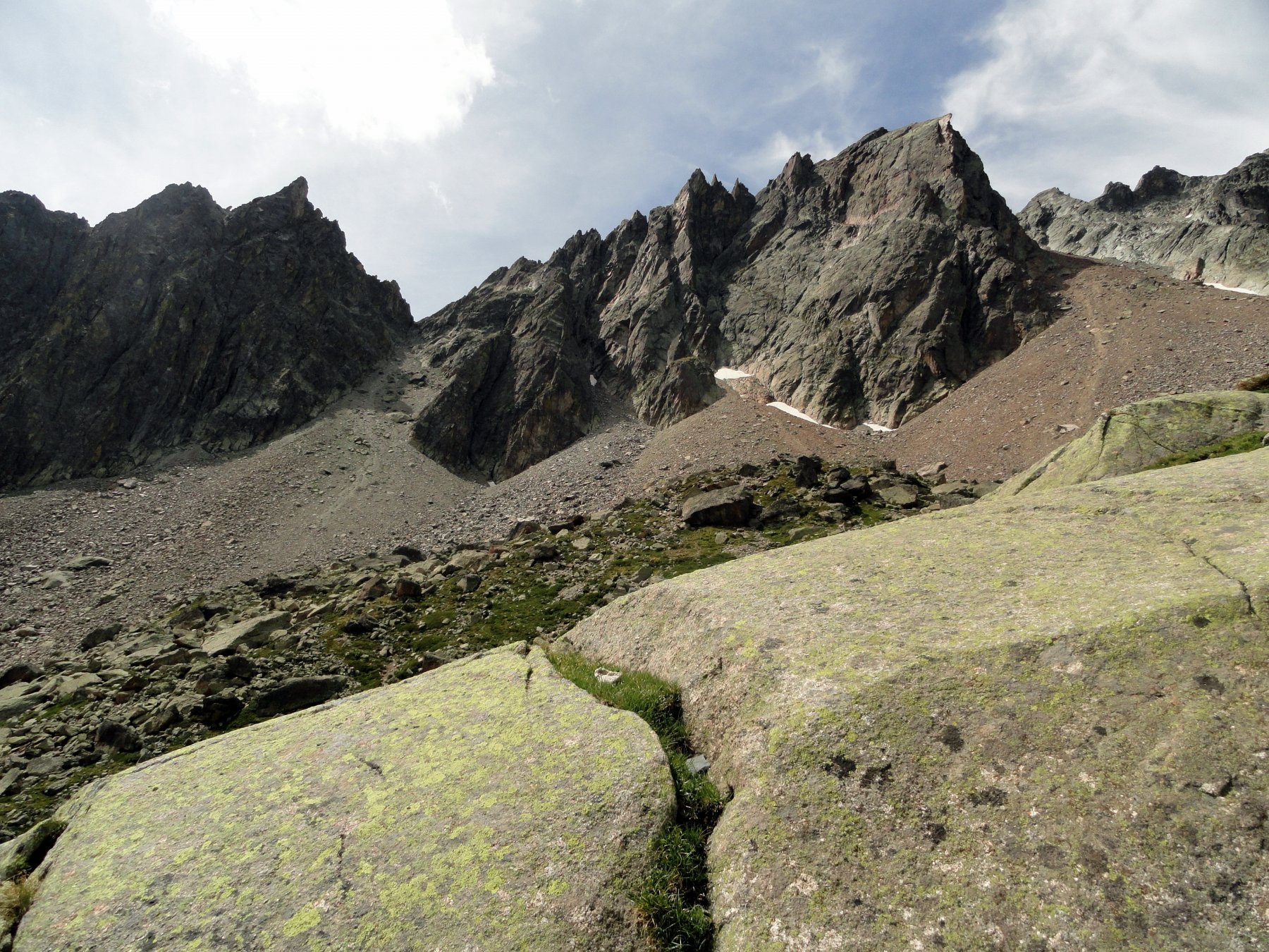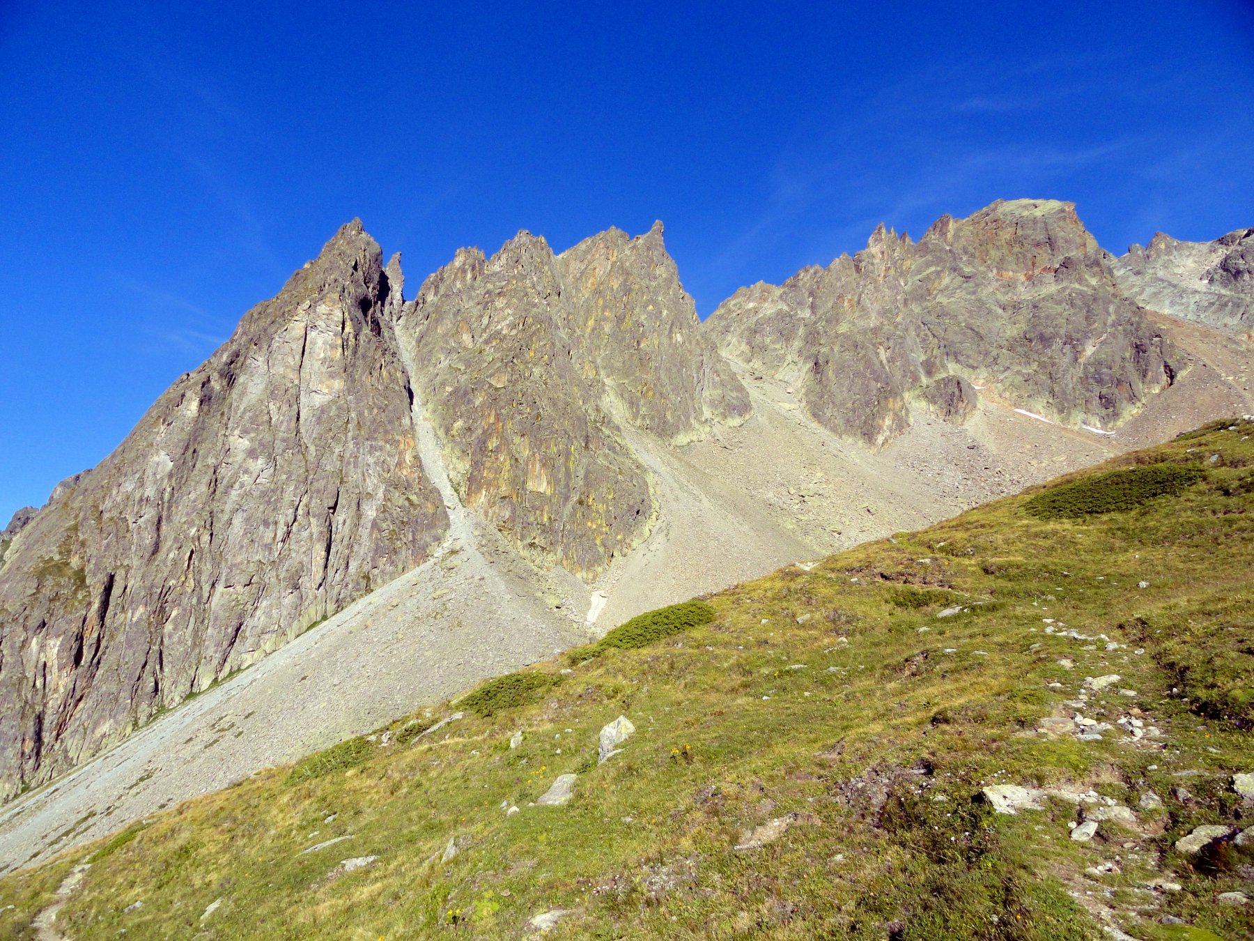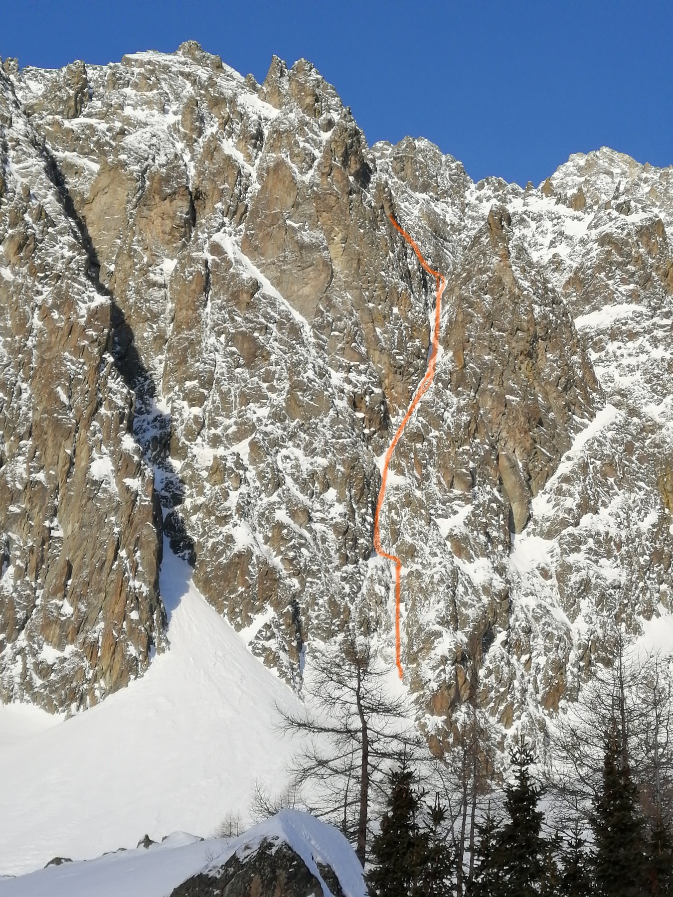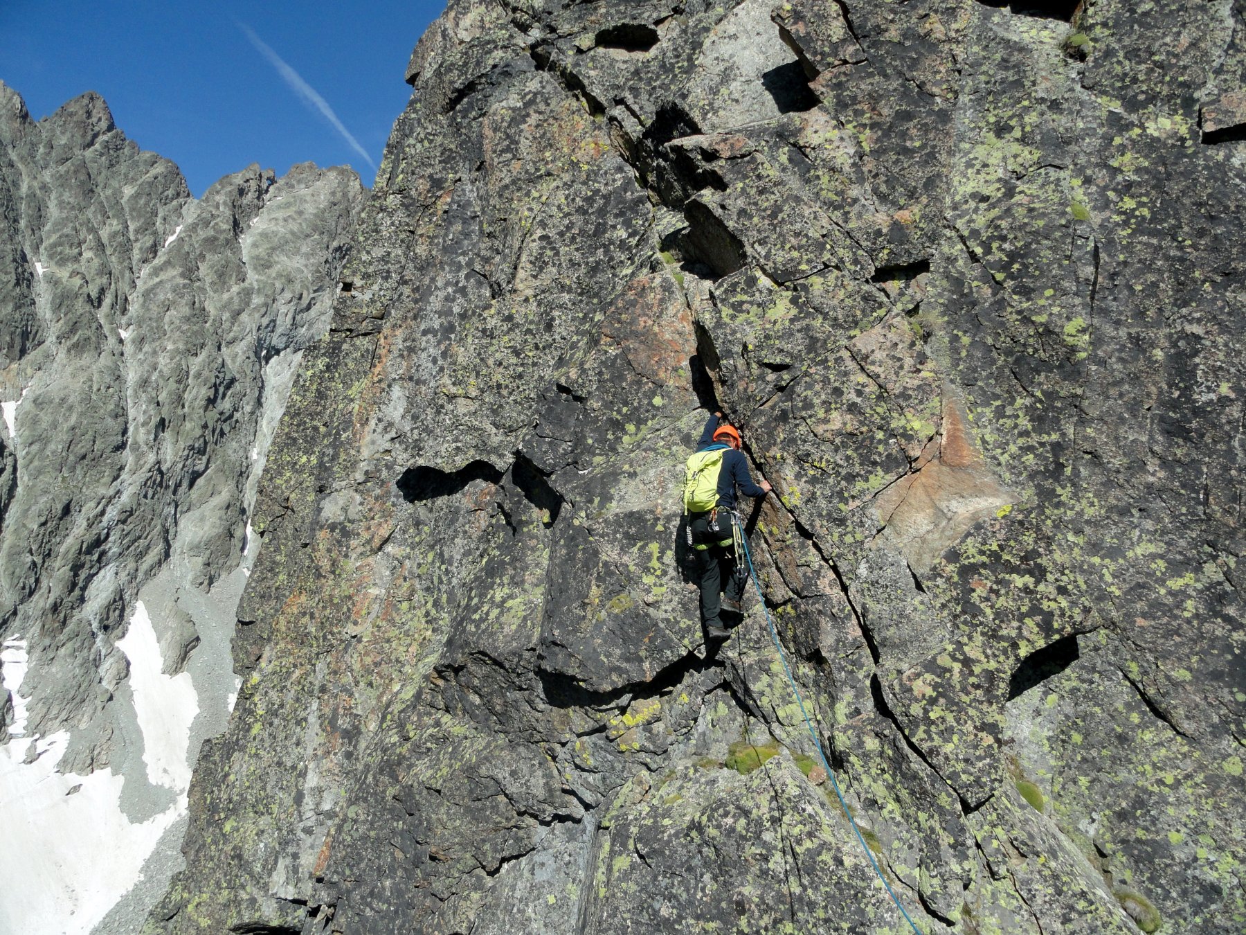 Si arriva alla base della Punta J. Charrey 2924 m, la prima delle tre che costituiscono il Trident de l’Aroletta; la si scala centralmente lungo due lunghezze di corda attrezzate e con due soste a fix. La prima lungo un sistema di lame e fessure (III-IV, un passo di IV+, 2ch., 25m) e la seconda lungo un camino-diedro (III+/IV-, poi facile, 2 fix, 15-20m).