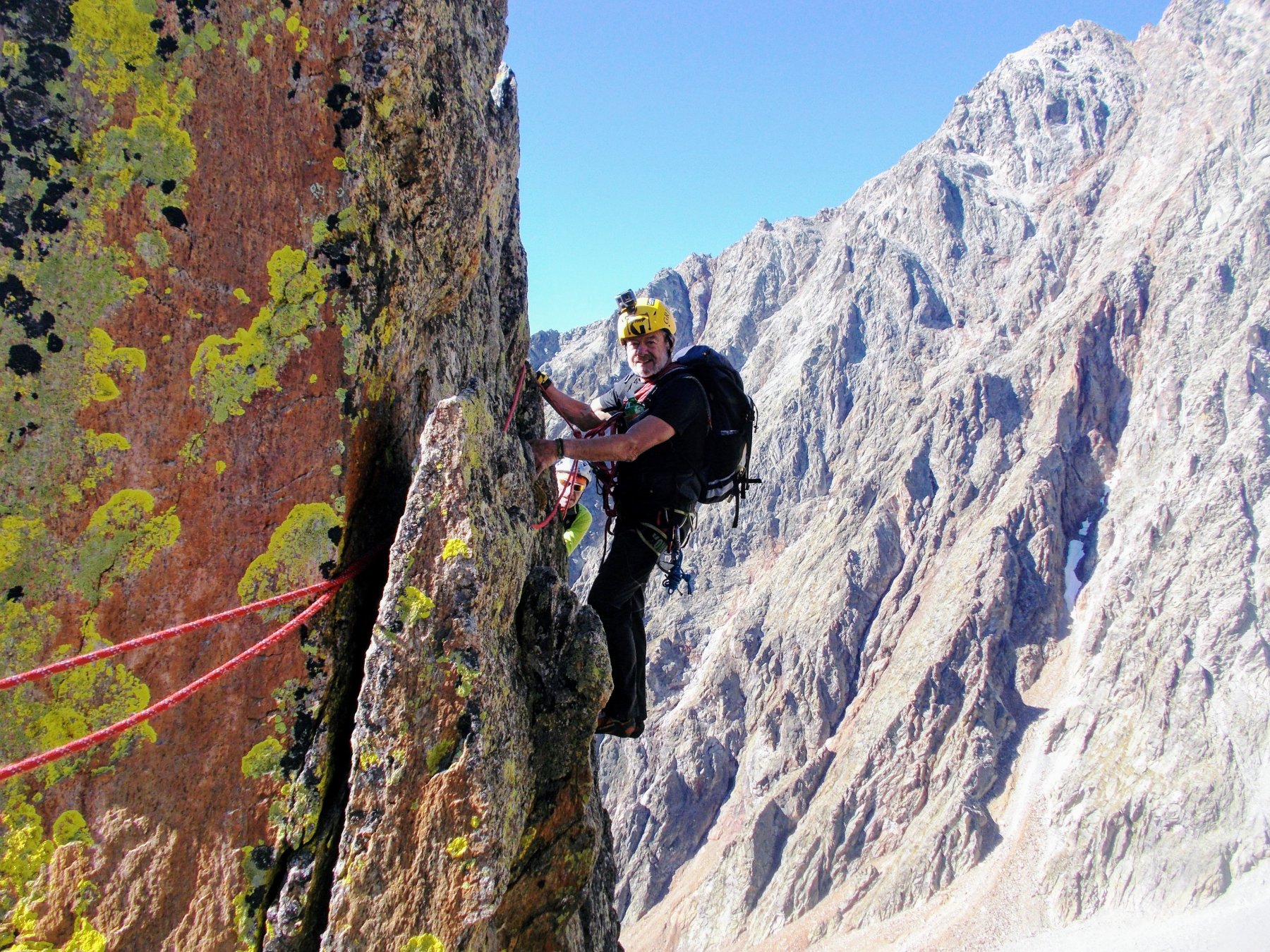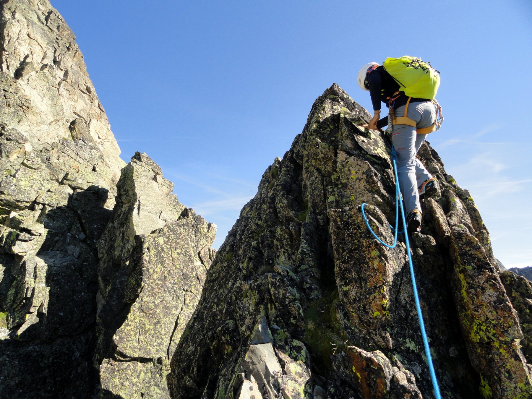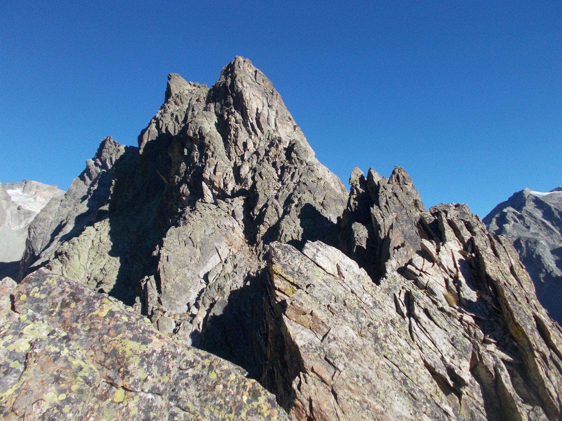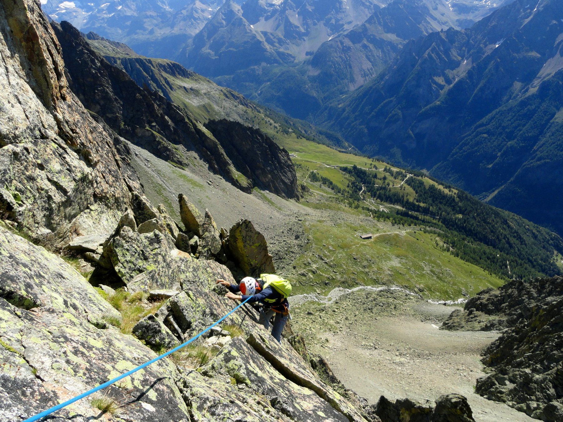 Discesa: dall’ometto di vetta si scende verso E per 40m lineari fino ad un intaglio della placconata. Reperire, rivolto verso nord un fix con anello per proteggere il gradino. Oppure scender ancora qualche metro lungo le placche e prendere sulla sx una cengia detritica che riporta verso la cresta nord. Scendere qualche metro lungo il filo fino a trovare la prima di tre soste di calata (fix+catena) che permettono di scendere lungo il filo fino al Col de l’Arolletta. Dal colletto si scende di una ventina di metri e quindi nei pressi di una strozzatura si può effettuare un’ultima calata, oppure disarrampicare sulle placche friabili in sx orografica (III-). Seguendo il ripido canalone si scende prima al bivacco Spataro e poi al rifugio.