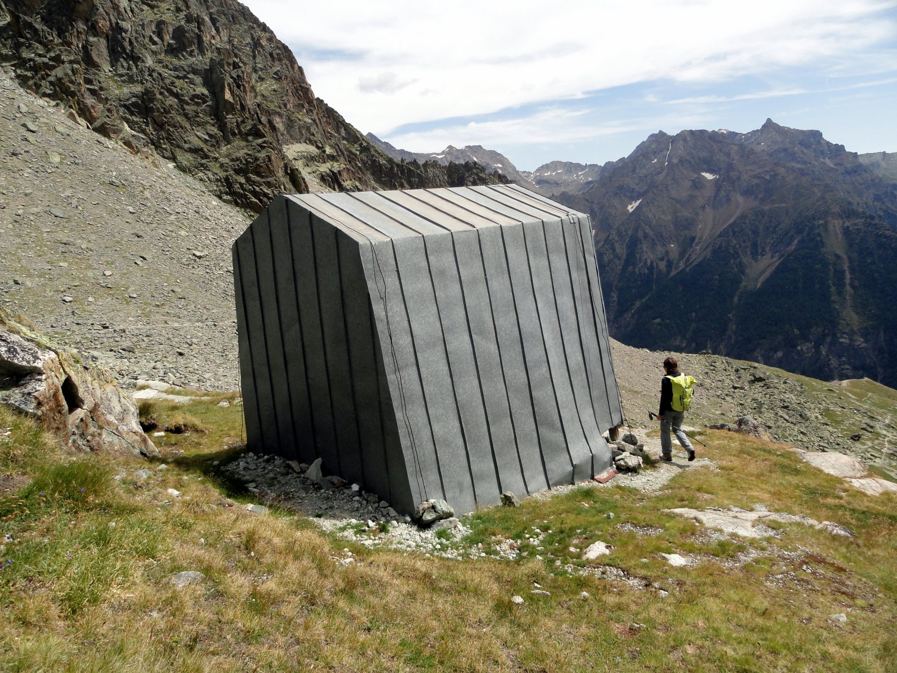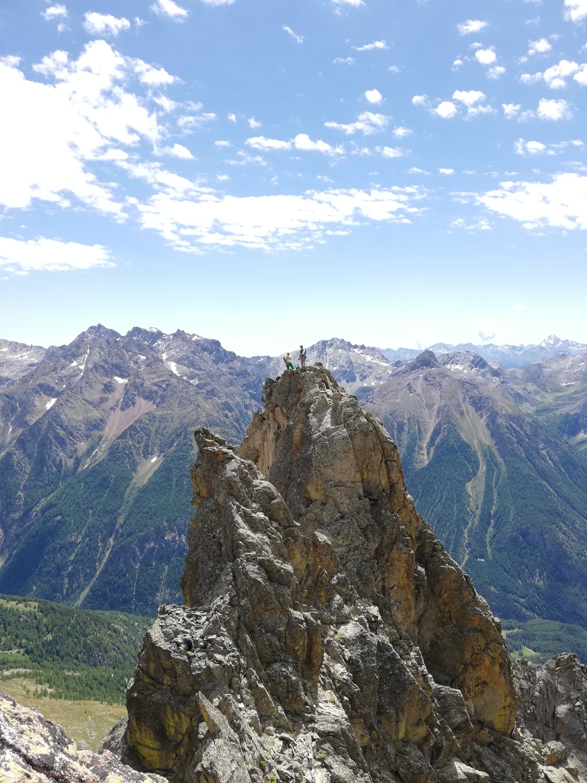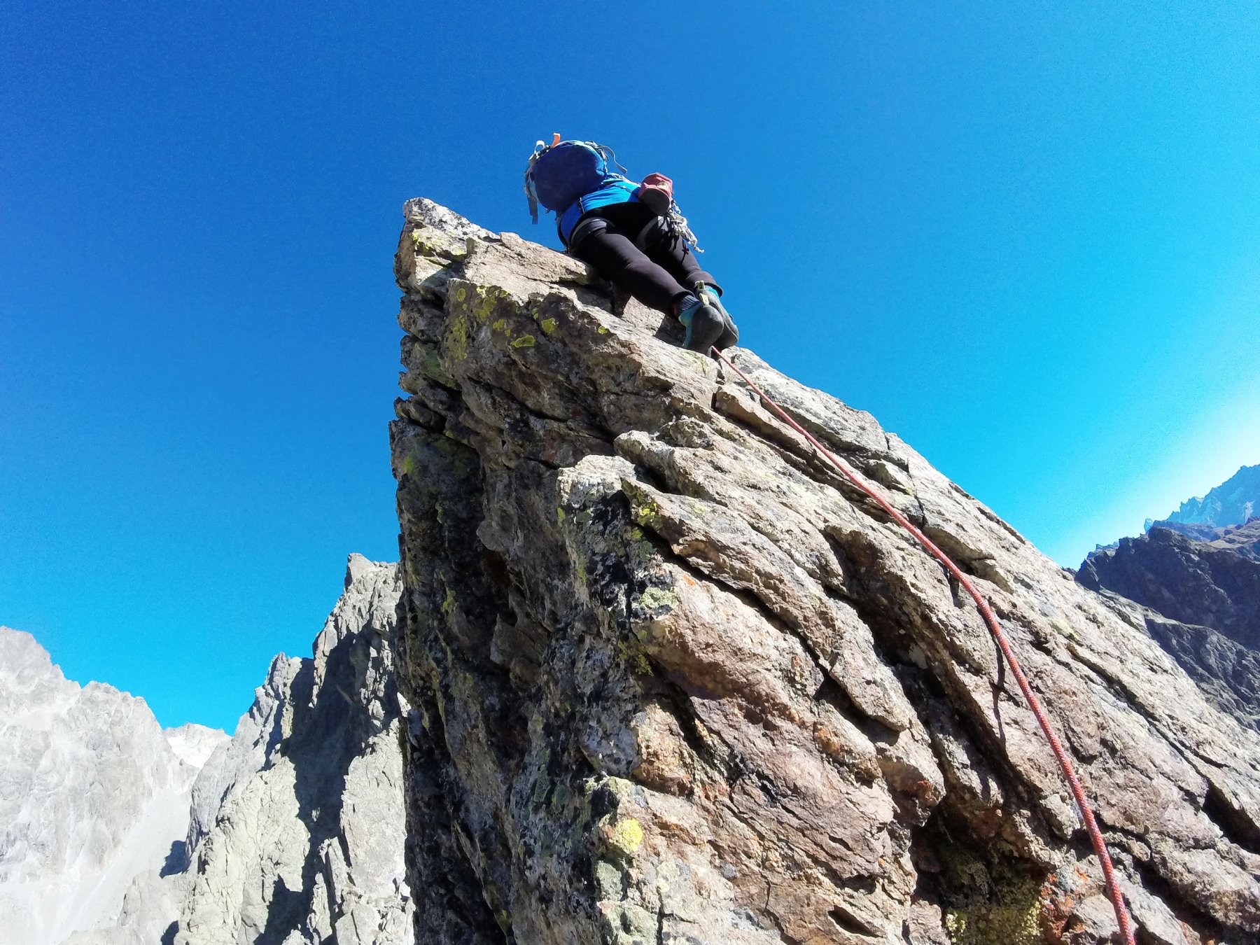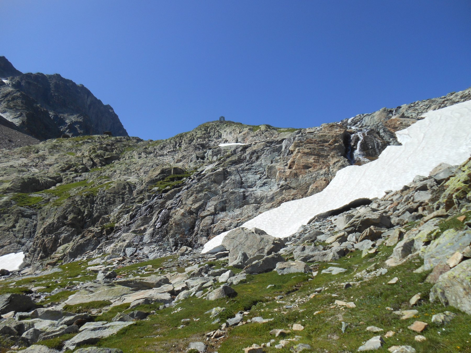 Discesa: dall’ometto di vetta si scende verso E per 40m lineari fino ad un intaglio della placconata. Reperire, rivolto verso nord un fix con anello per proteggere il gradino. Oppure scender ancora qualche metro lungo le placche e prendere sulla sx una cengia detritica che riporta verso la cresta nord. Scendere qualche metro lungo il filo fino a trovare la prima di tre soste di calata (fix+catena) che permettono di scendere lungo il filo fino al Col de l’Arolletta. Dal colletto si scende di una ventina di metri e quindi nei pressi di una strozzatura si può effettuare un’ultima calata, oppure disarrampicare sulle placche friabili in sx orografica (III-). Seguendo il ripido canalone si scende prima al bivacco Spataro e poi al rifugio.