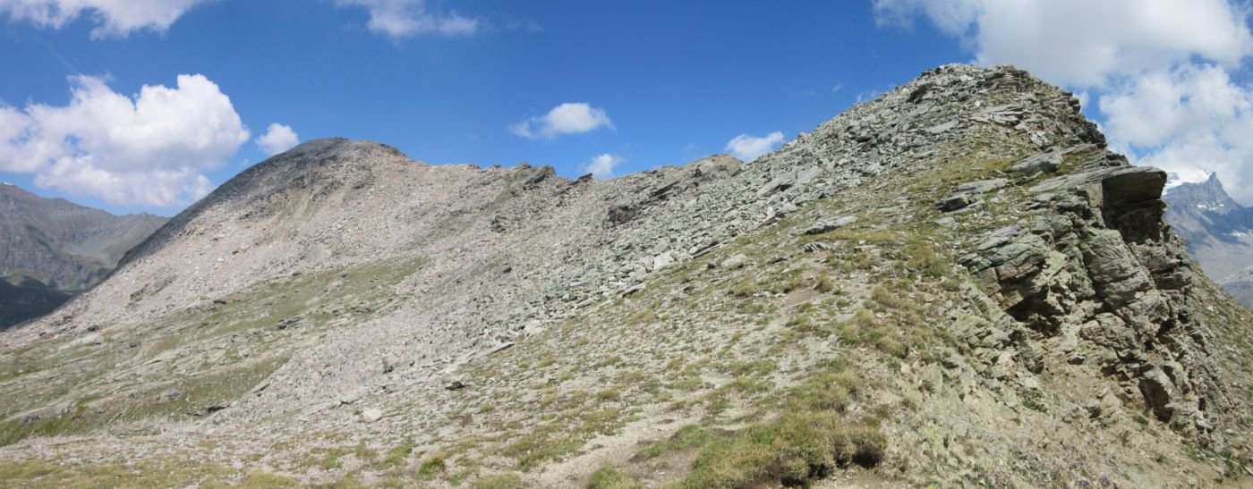 Abbandonare il sentiero e salire a sinistra per dossi erbosi e ripidi sfasciumi (qualche ometto) fino a raggiungere la cresta sud della Rolley. Seguire la cresta facilmente per blocchi, detriti e tracce di sentiero con percorso evidente. Un ultimo tratto più ripido si supera per blocchi sul filo (preferibile anche in discesa) o a destra per ripido pendio di terriccio rossastro, sbucando sull’ampia calotta detritica sommitale. Grosso ometto in vetta.