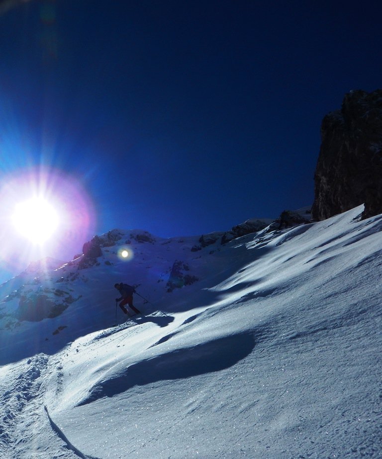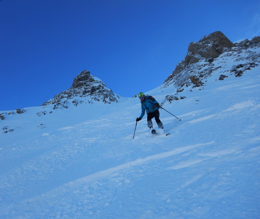 Salito all’Arpet dal Visaisa e passo Baracconi in ambiente di grande bellezza, con le creste dipinte di bianco dalle recenti spruzzate (ottimo l’ innevamento nel Vallonasso Visaisa sino al lago). Atteso in cima (evento raro) i tre moschettieri saliti dall’ Arcana e disceso insieme il canale nord con accesso dal breve pendio sospeso subito ad est della cima. Mediamente una spanna di bellissima farina su fondo duro, meglio del previsto il passaggio della piccola barra rocciosa nel terzo finale del canale, poi lariceto con neve giusta ma sempre su buon fondo compatto, seppur un pò irregolare.