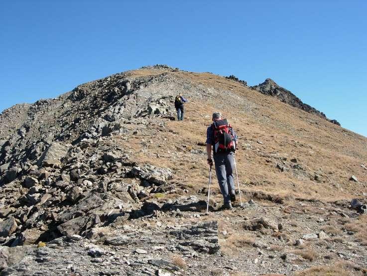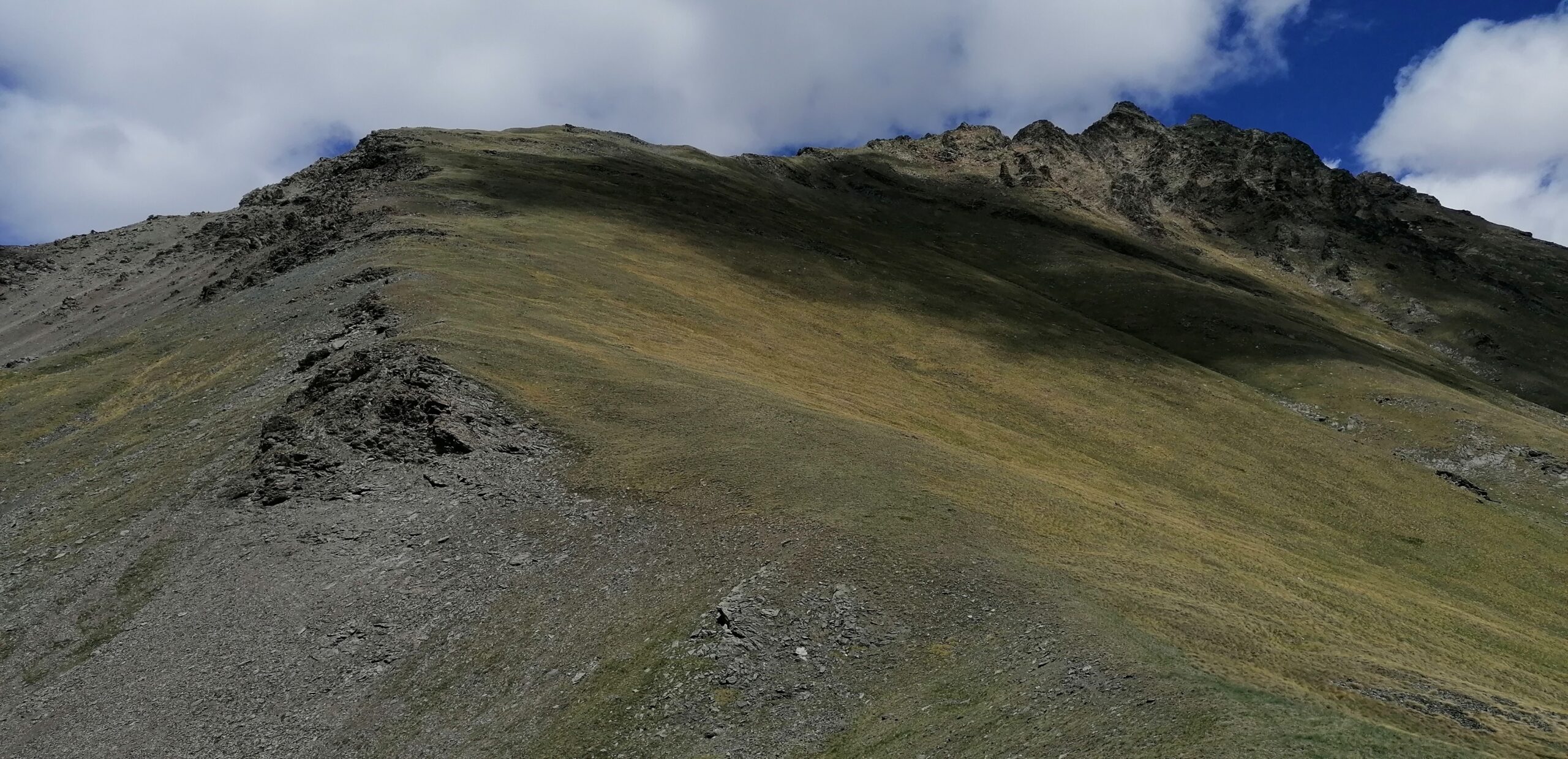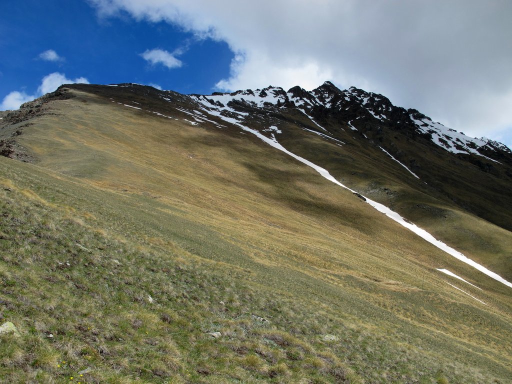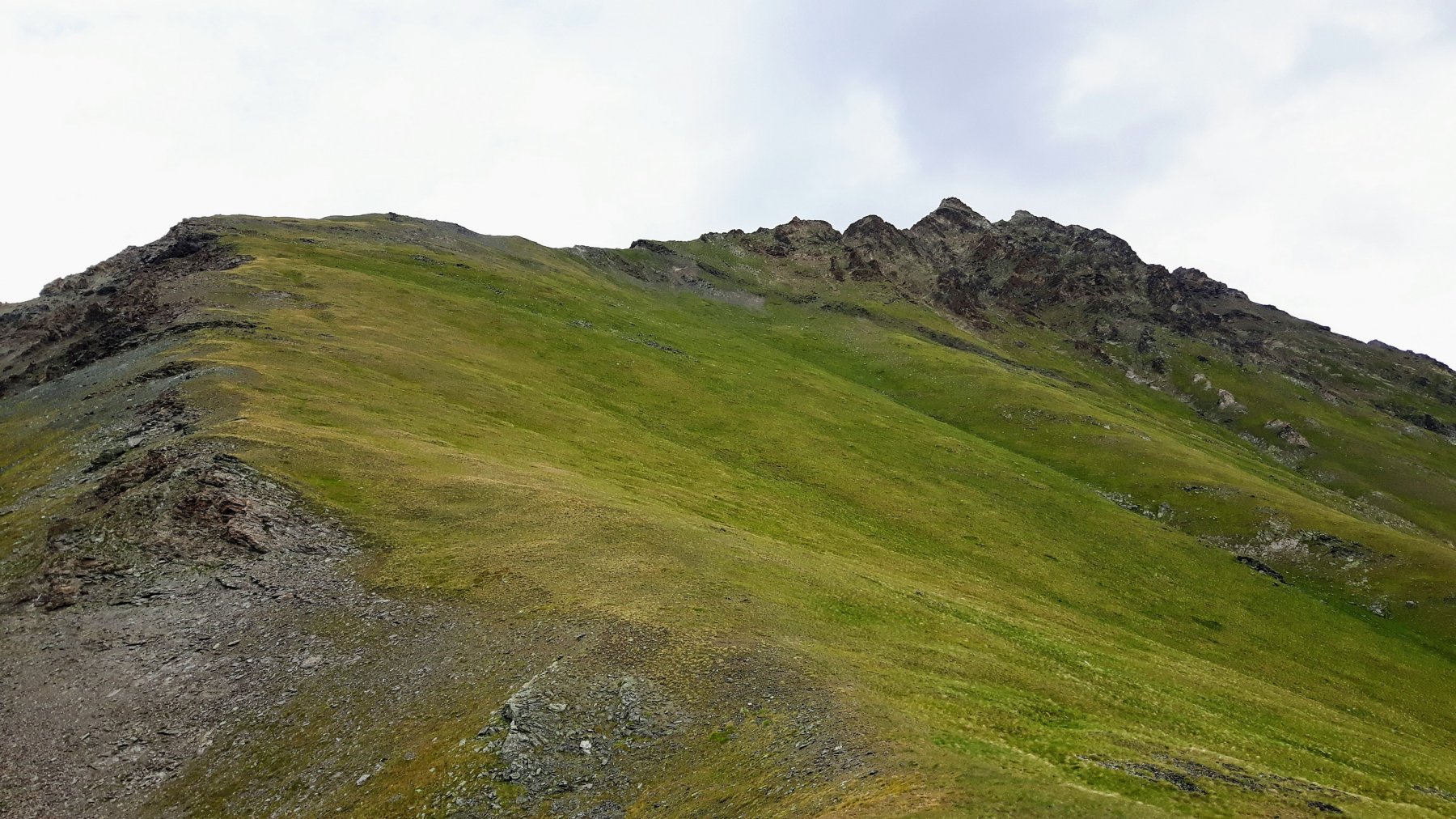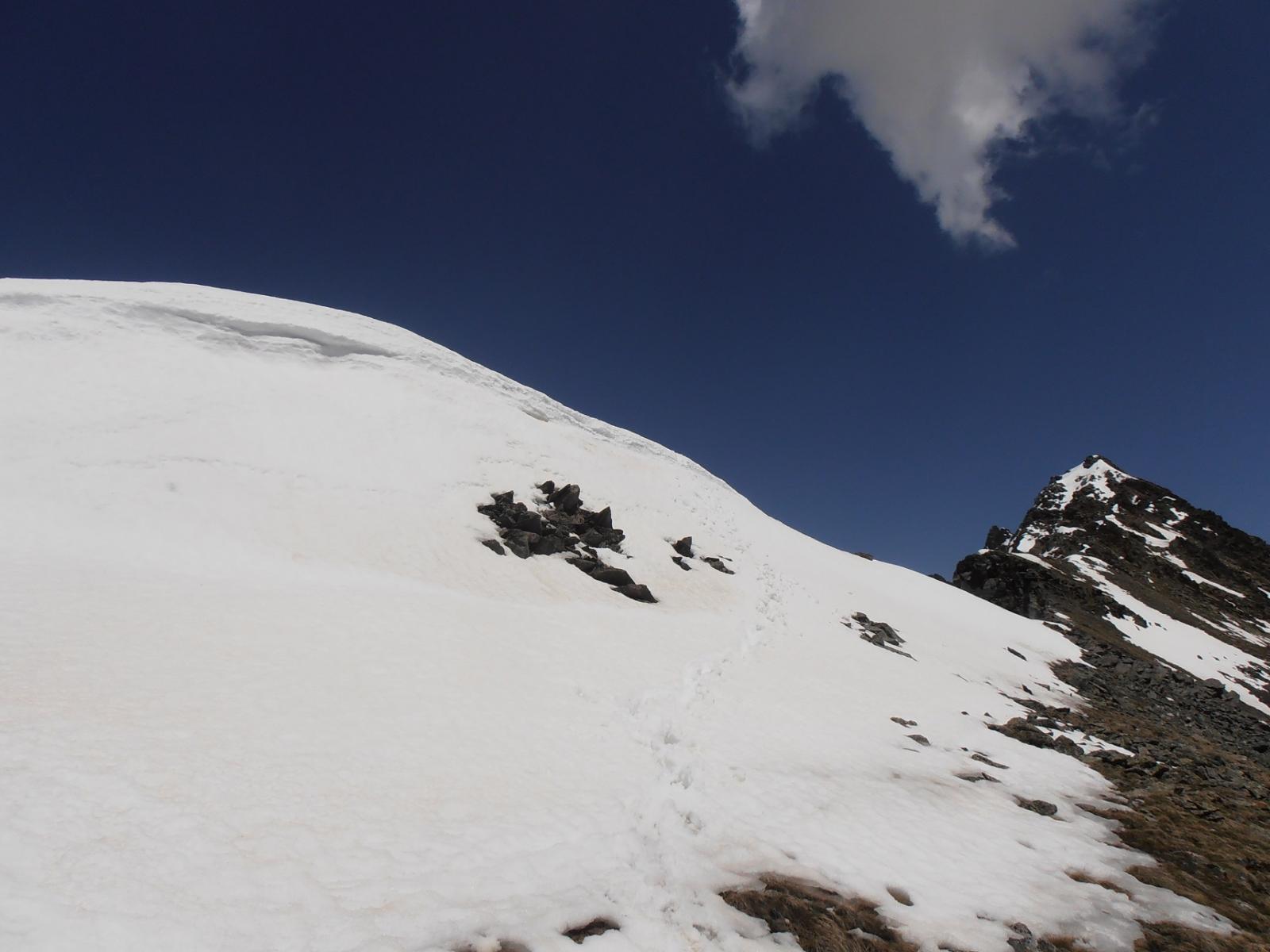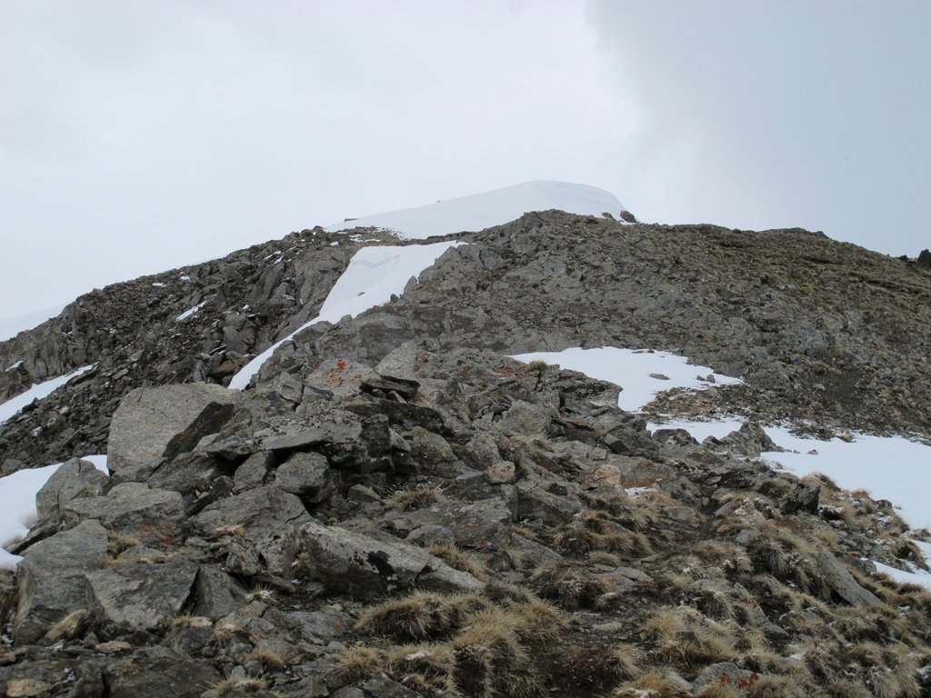 Dalla Tsaplana è molto evidente il restante percorso per la cima, ovvero non resta che risalire con percorso a piacere il ripido pendio di erba e detriti in direzione nord. Non esistono tracce (se non a tratti molto vaghe), comunque non ci sono passaggi obbligati, conviene però mantenersi più verso la dorsale di destra (ometti). Una volta che la pendenza si abbatte, si è in vetta (ometto), gran panorama.