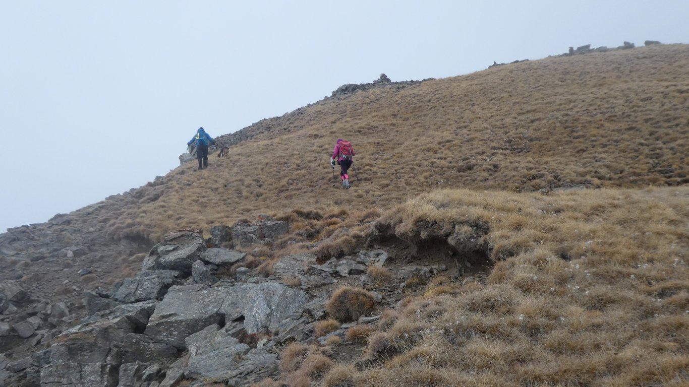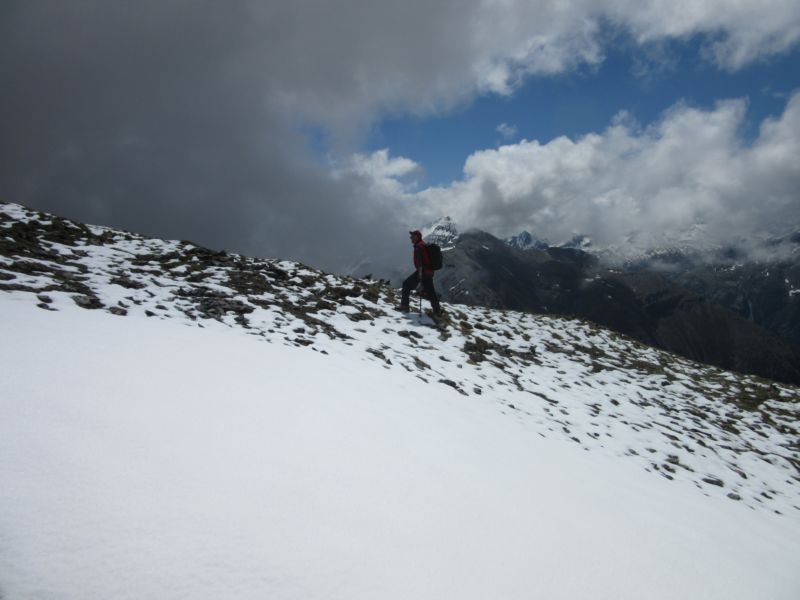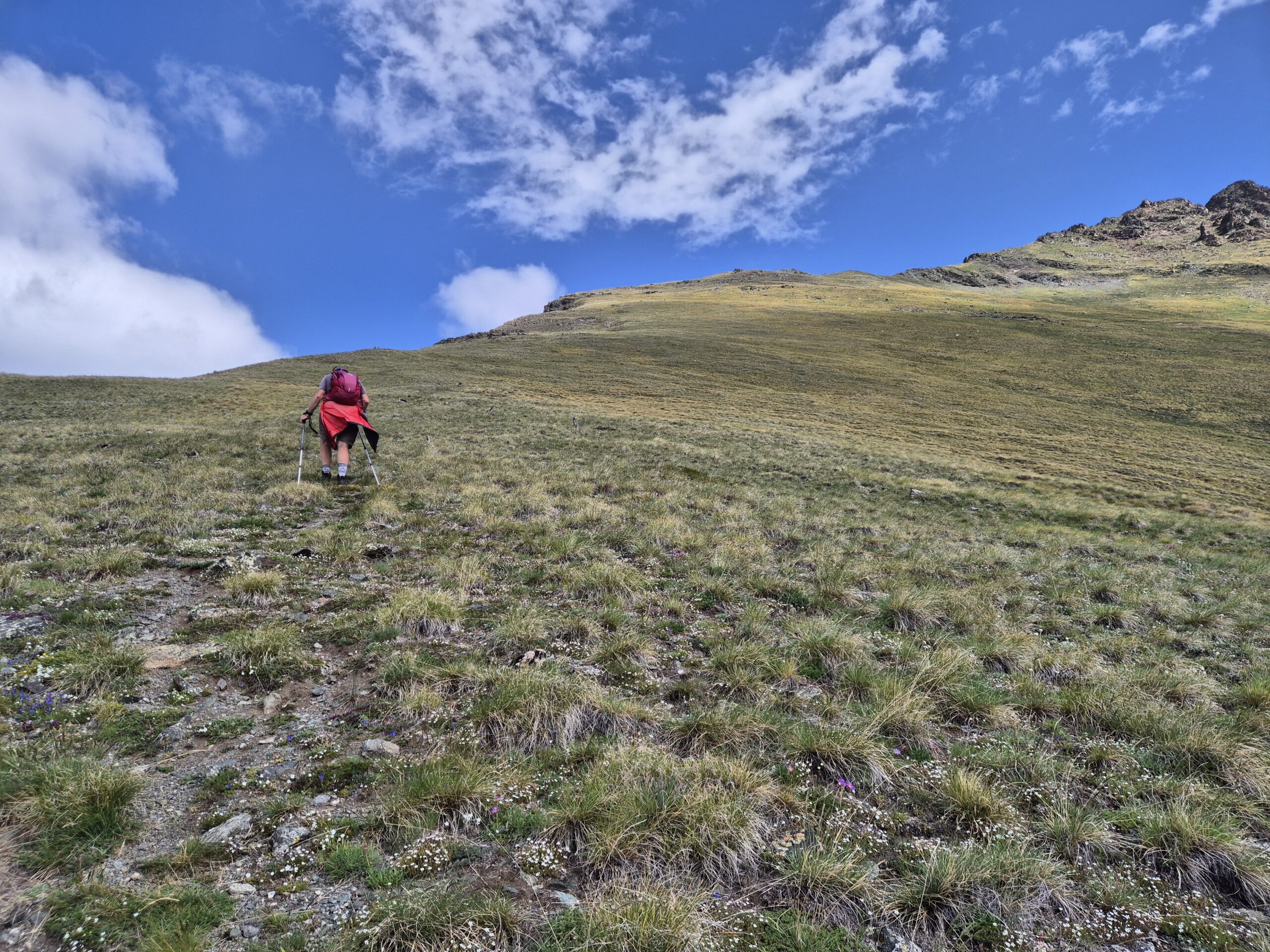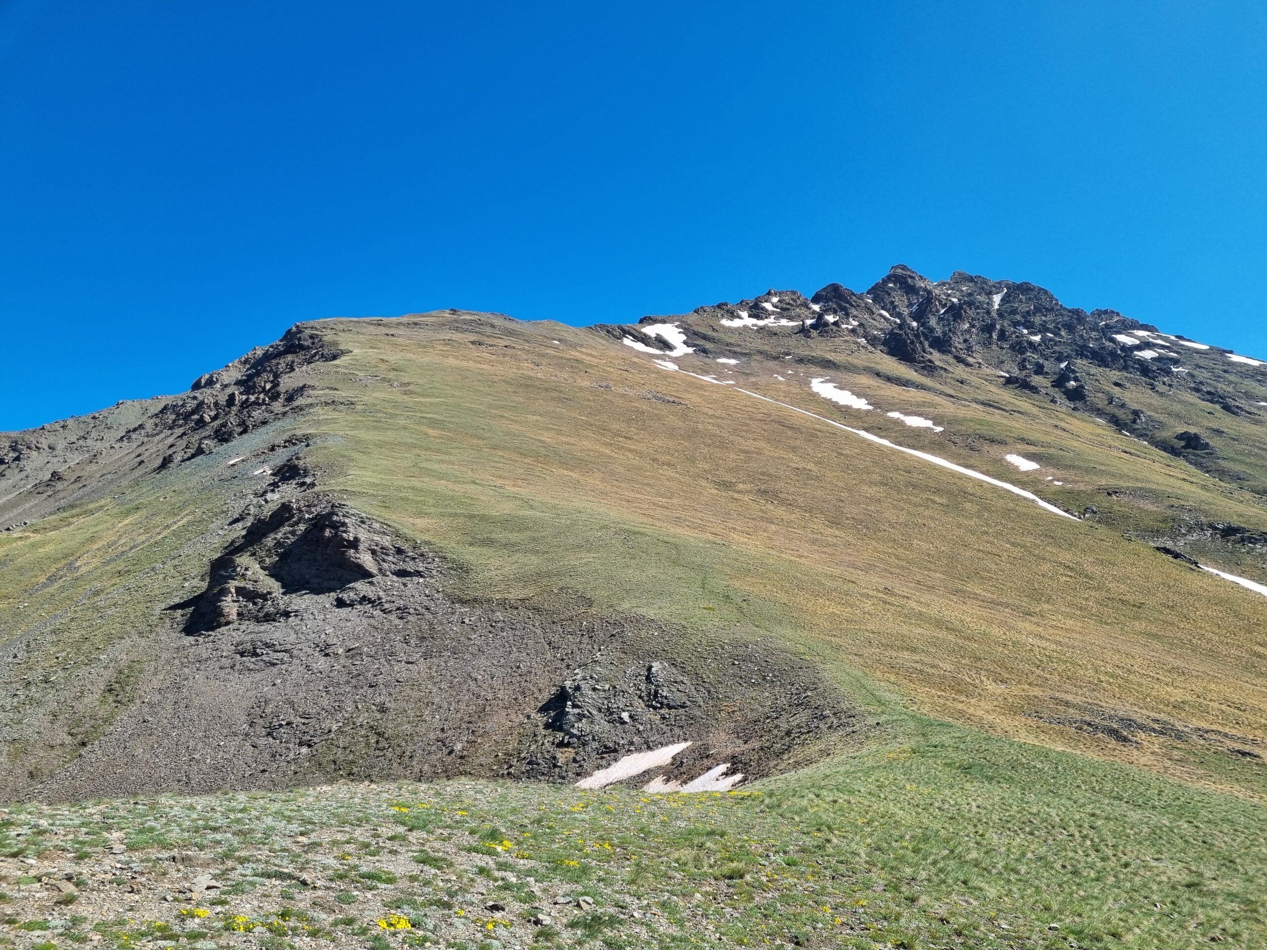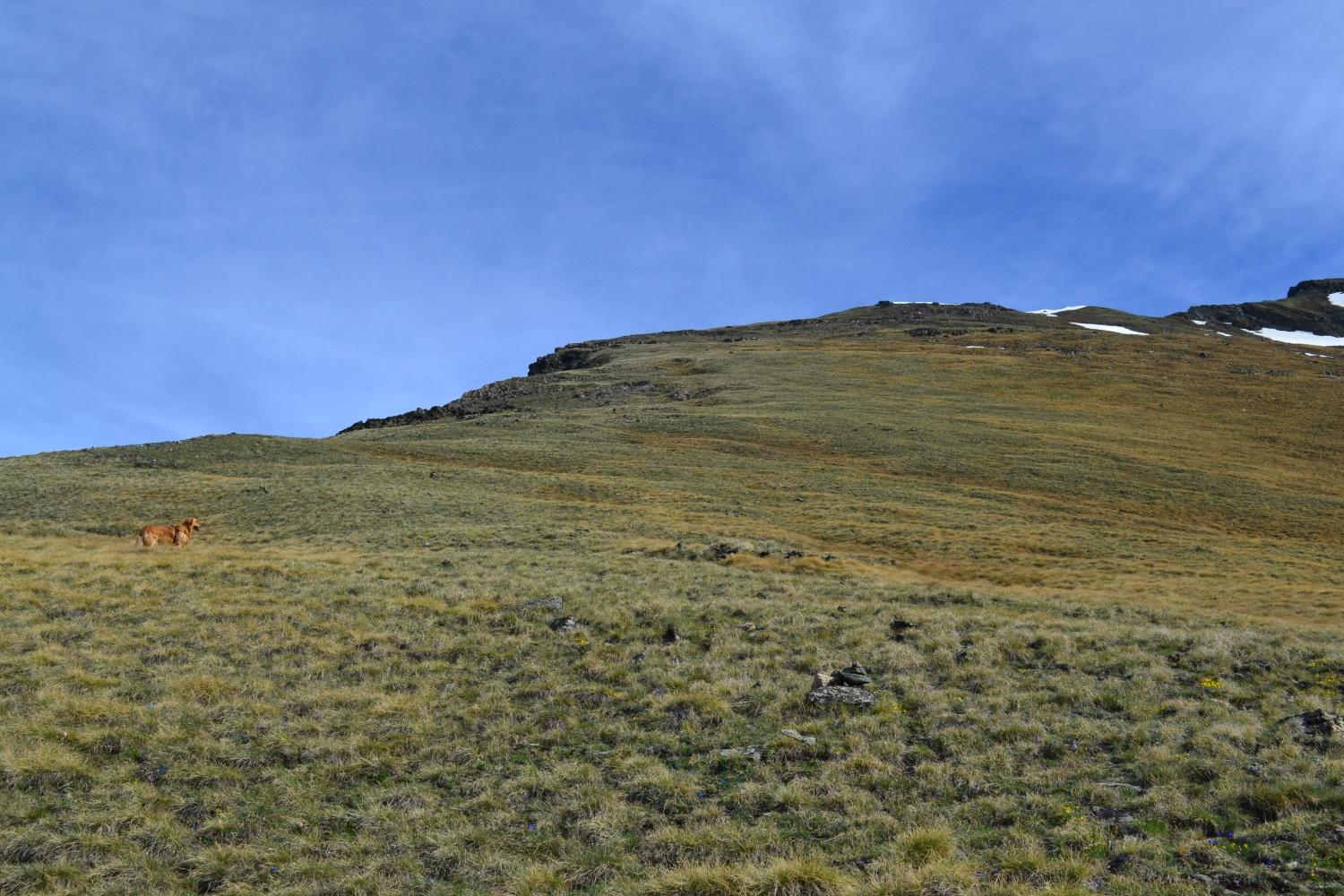 Dalla Tsaplana è molto evidente il restante percorso per la cima, ovvero non resta che risalire con percorso a piacere il ripido pendio di erba e detriti in direzione nord. Non esistono tracce (se non a tratti molto vaghe), comunque non ci sono passaggi obbligati, conviene però mantenersi più verso la dorsale di destra (ometti). Una volta che la pendenza si abbatte, si è in vetta (ometto), gran panorama.