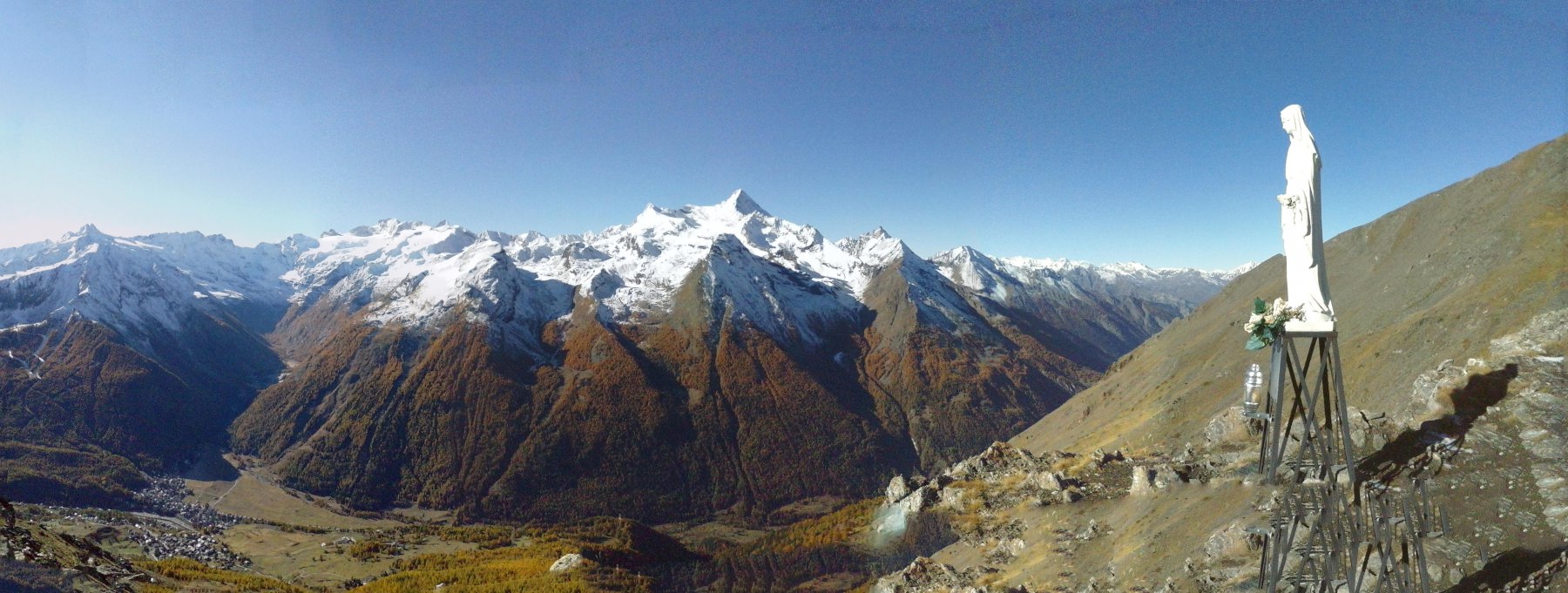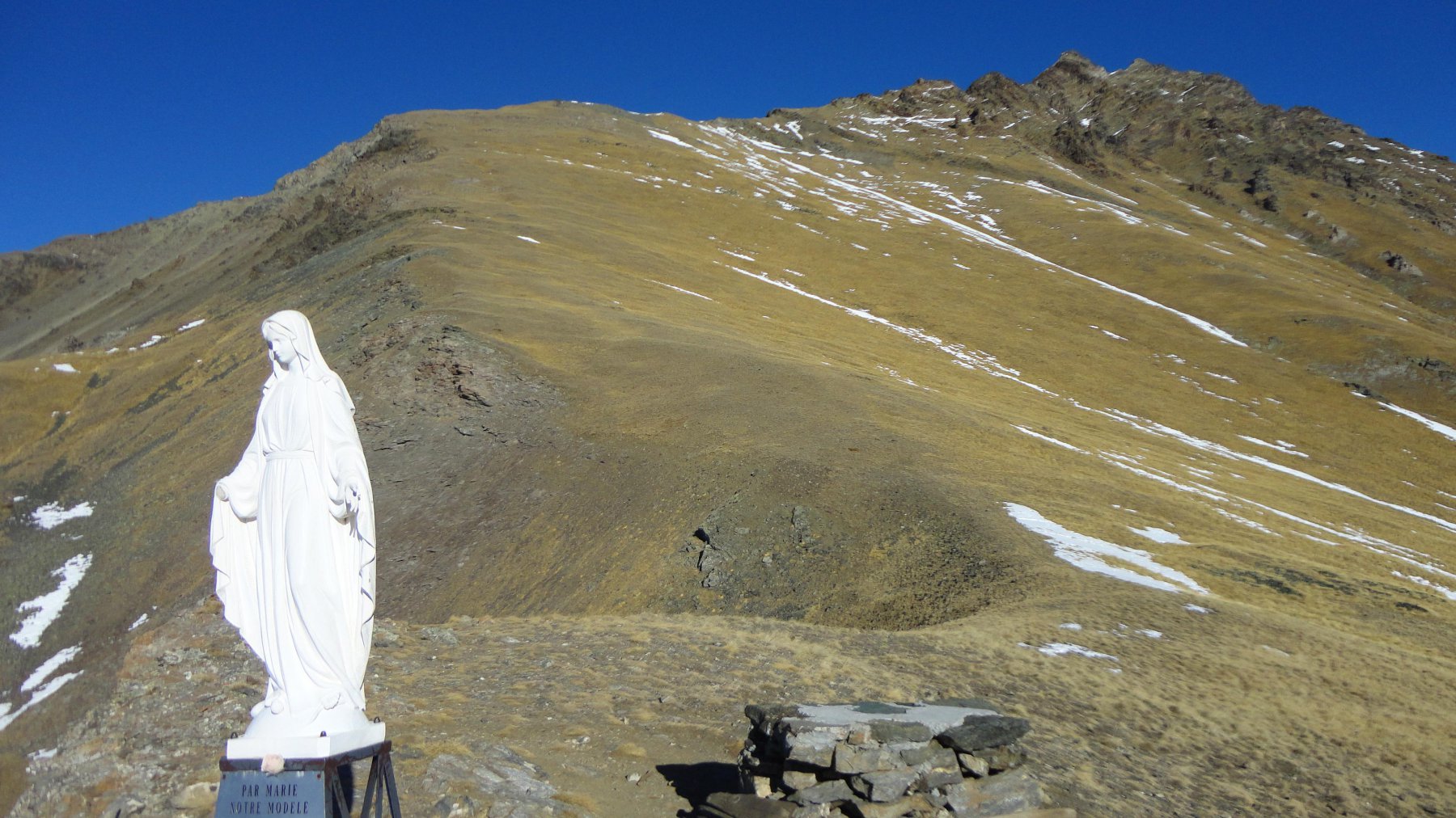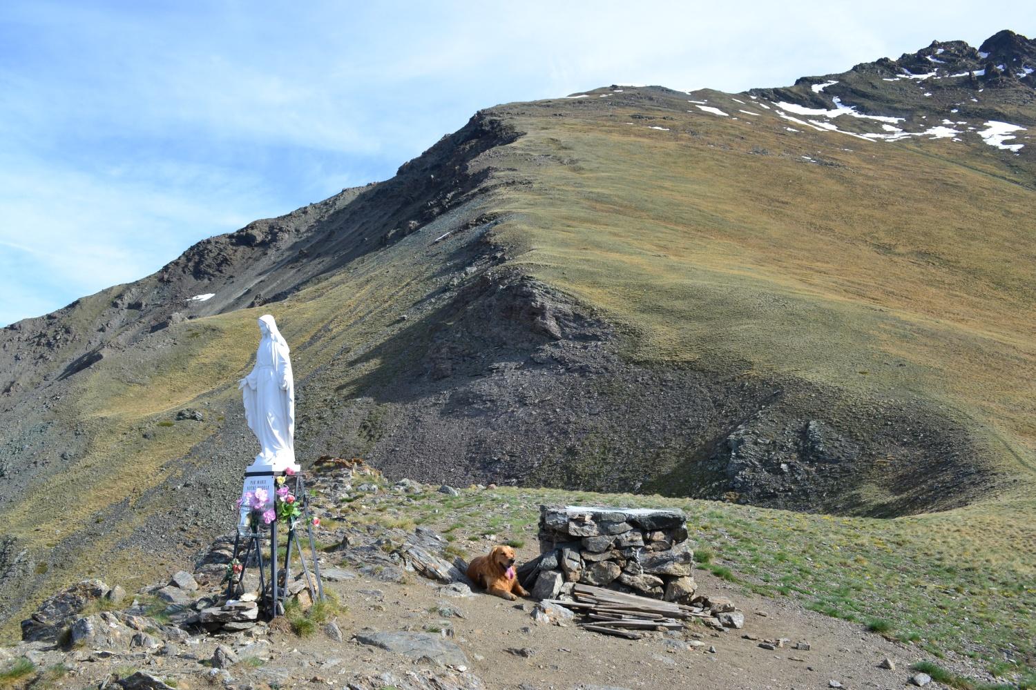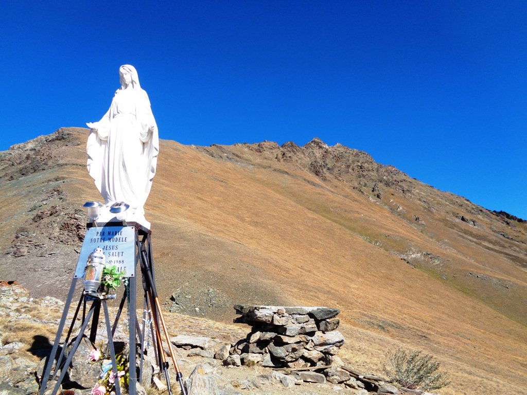 Oltre a questa piccola conca erbosa, il sentiero inizia a salire più ripido, per portarsi sotto la Tsaplana e i suoi paravalanghe, che si raggiunge con un’ultimo strappo. In cima 2677 m è presente una statua della Madonna.