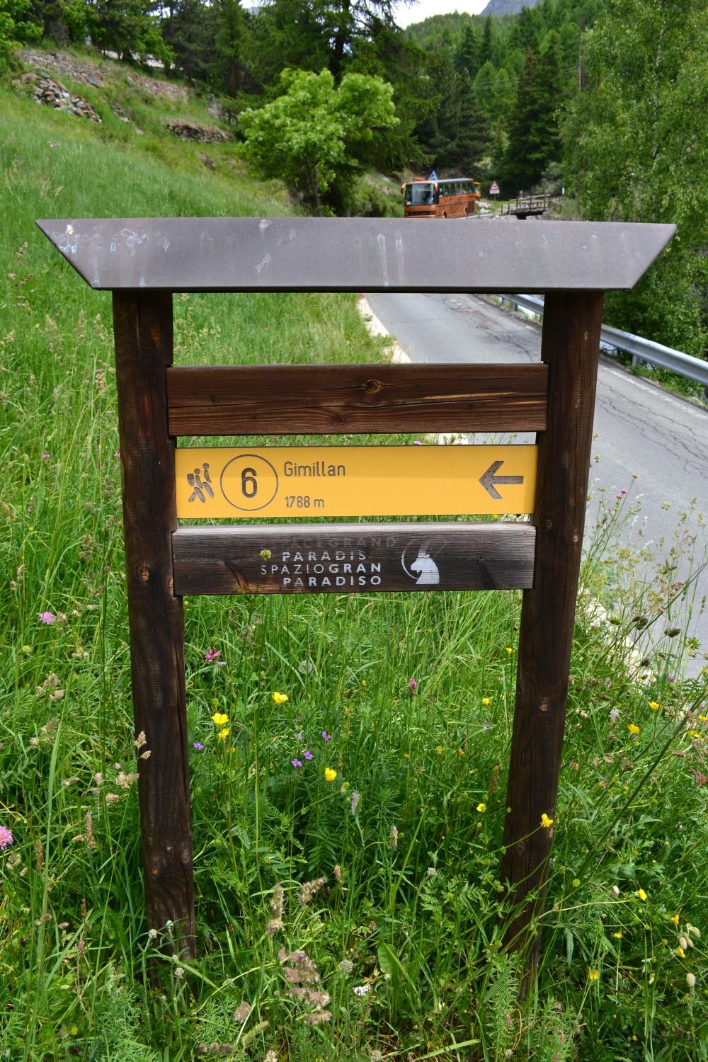 Si attraversa la via principale di Gimillan in direzione nord, (consigliabile per ammirare il bel borgo caratteristico) fino a giungere nei pressi di un’area giochi con parcheggio (paline indicatrici). Si prosegue ancora lungo la stradina asfaltata che sale ripida fino ad una cappelletta bianca.