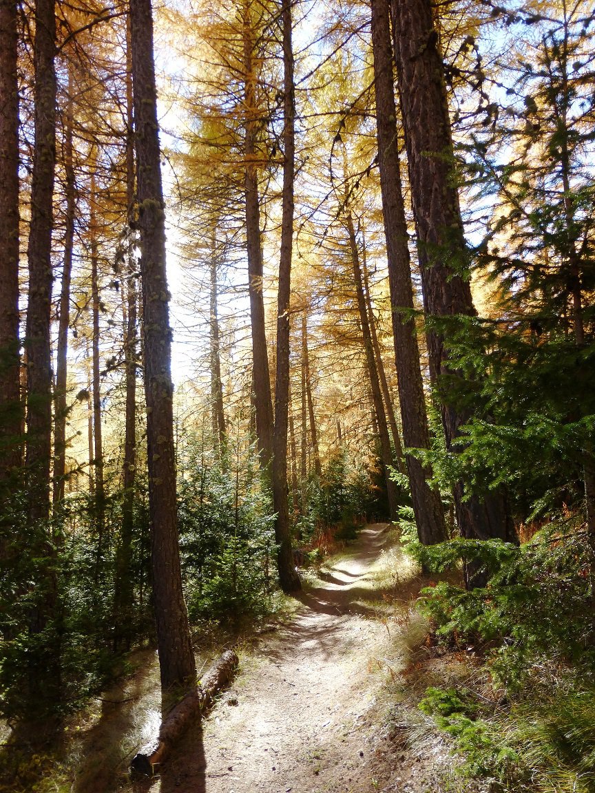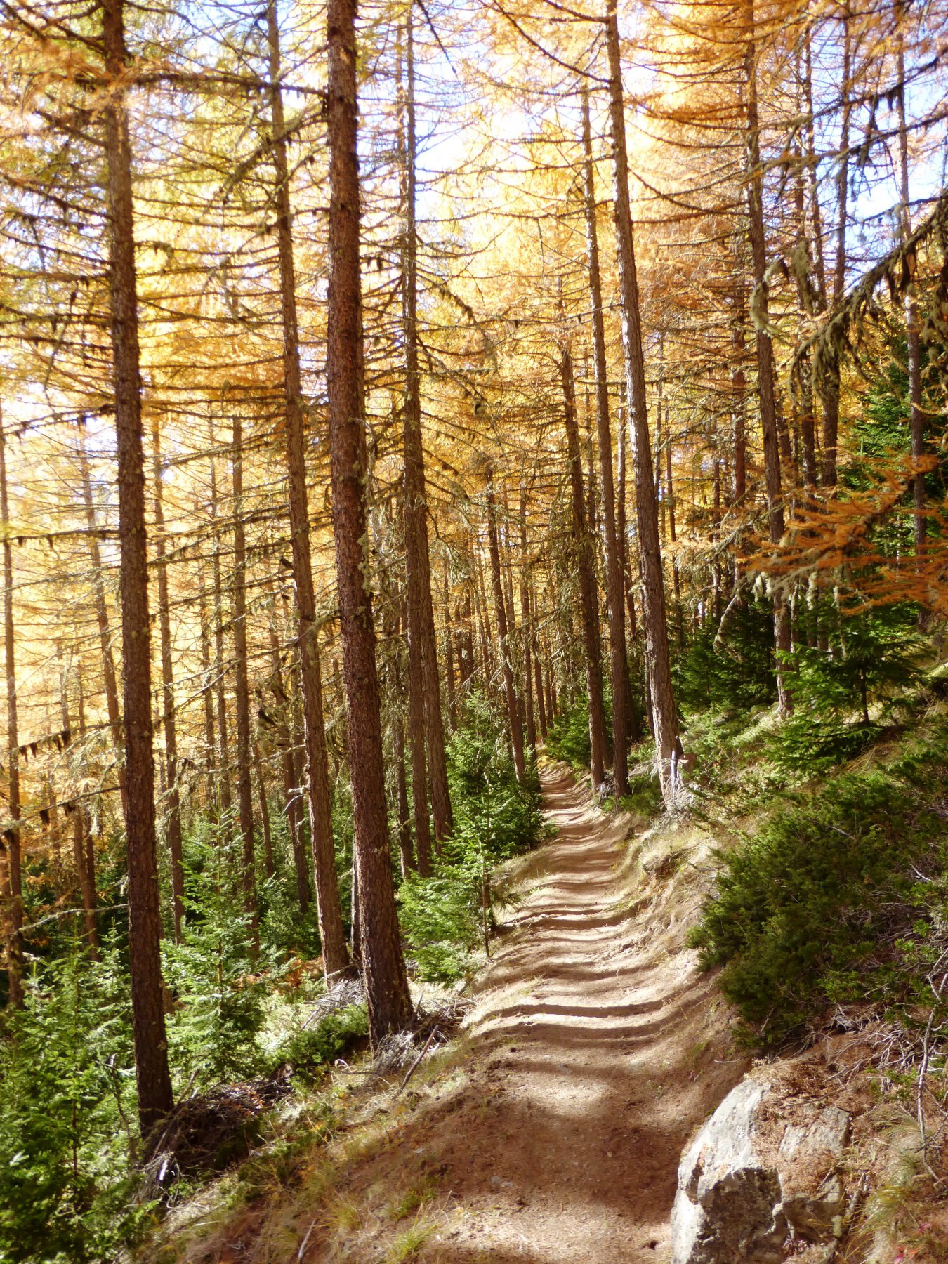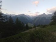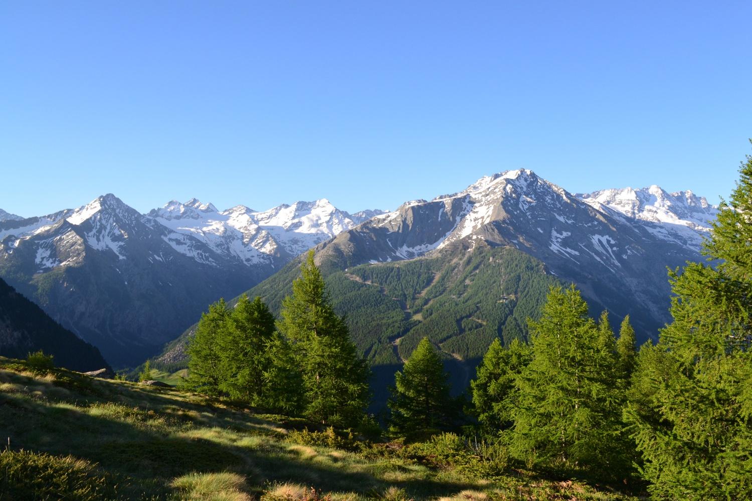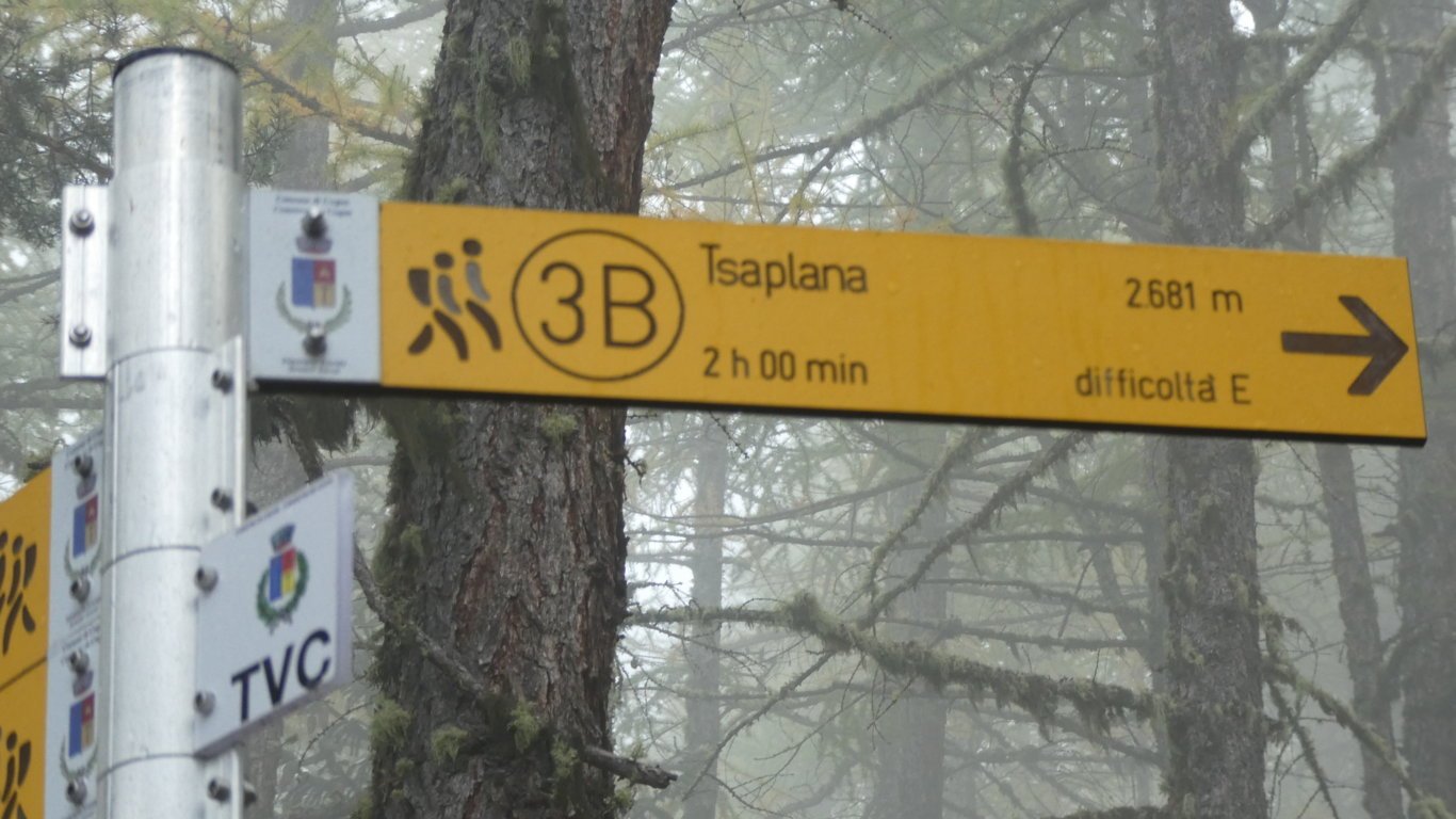 Qui si abbandona la strada per proseguire dritti lungo l’argine del torrente (il sentiero è evidente anche se un po’ inerbito, e poco dopo si raggiunge Pian della Teppa, dove alle ultime case termina una strada sterrata. Si entra ora nel bel bosco di larici, con dolce salita, fino a giungere ad un bivio; si prosegue a destra (indicazioni per Tsaplana) e sempre con moderata pendenza si sale con ampie svolte, per poi attraversare il canalone del torrente. Poco prima di uscire dal bosco si incontra il bivio con il sentiero 4b (che può essere usato per il rientro), si procede a sinistra, uscendo su una panoramica radura, alla base del costone erboso che scende direttamente da Tsaplana.