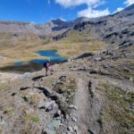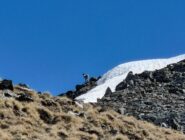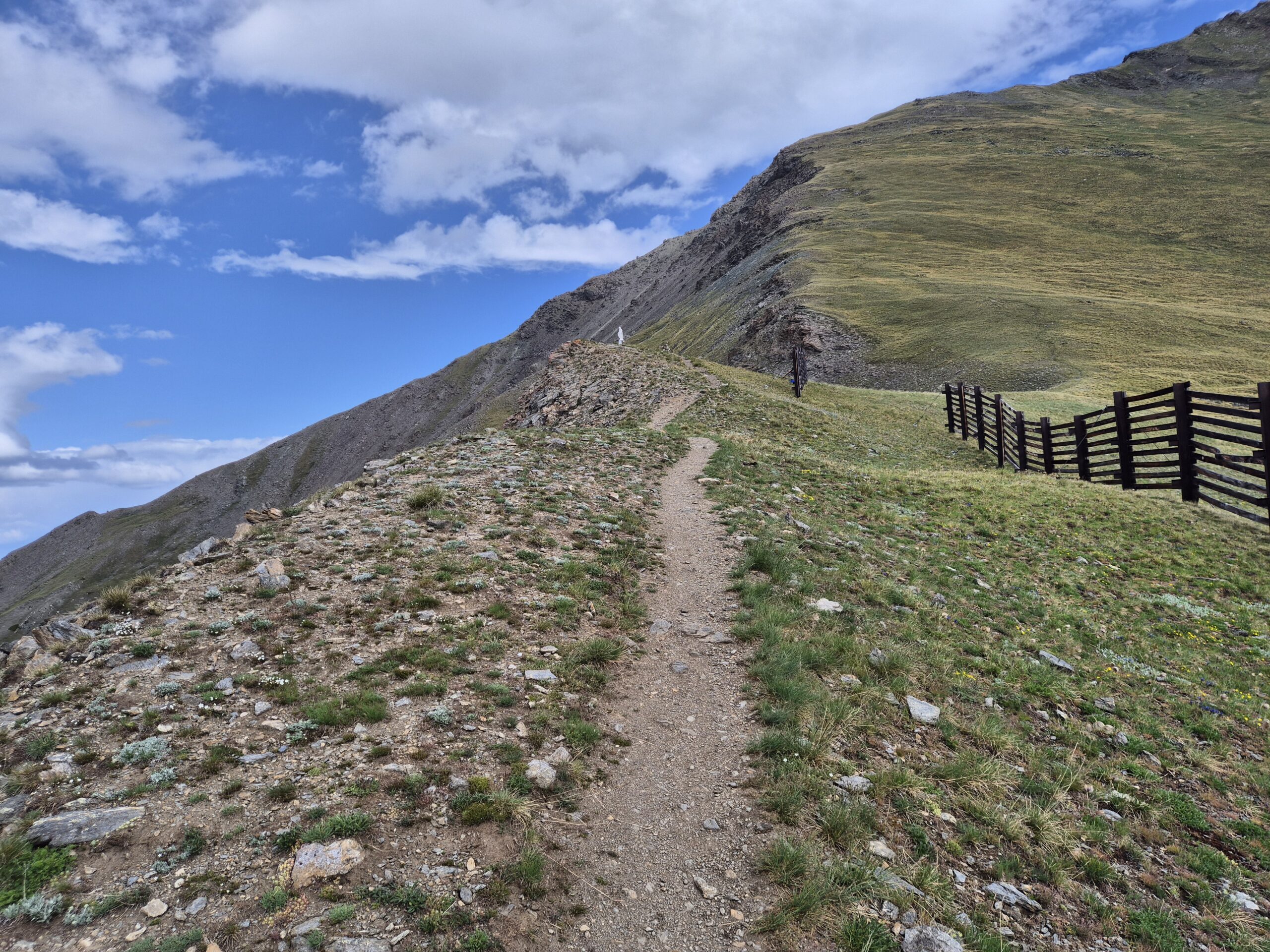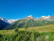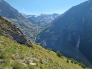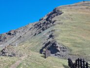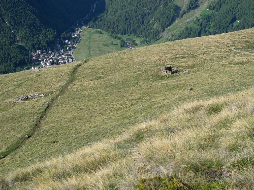 Il sentiero ottimamente mantenuto continua con ampissime svolte (talvolta esagerate), spostandosi progressivamente a destra verso il vallone Grauson. Volendo sono possibili parecchie scorciatoie, anche se non esistono tracce ma si può navigare a a vista. A 2400 m circa si incontra un rudere usato dai pastori, e poco sopra un’altra area anticamente adibita al pascolo.