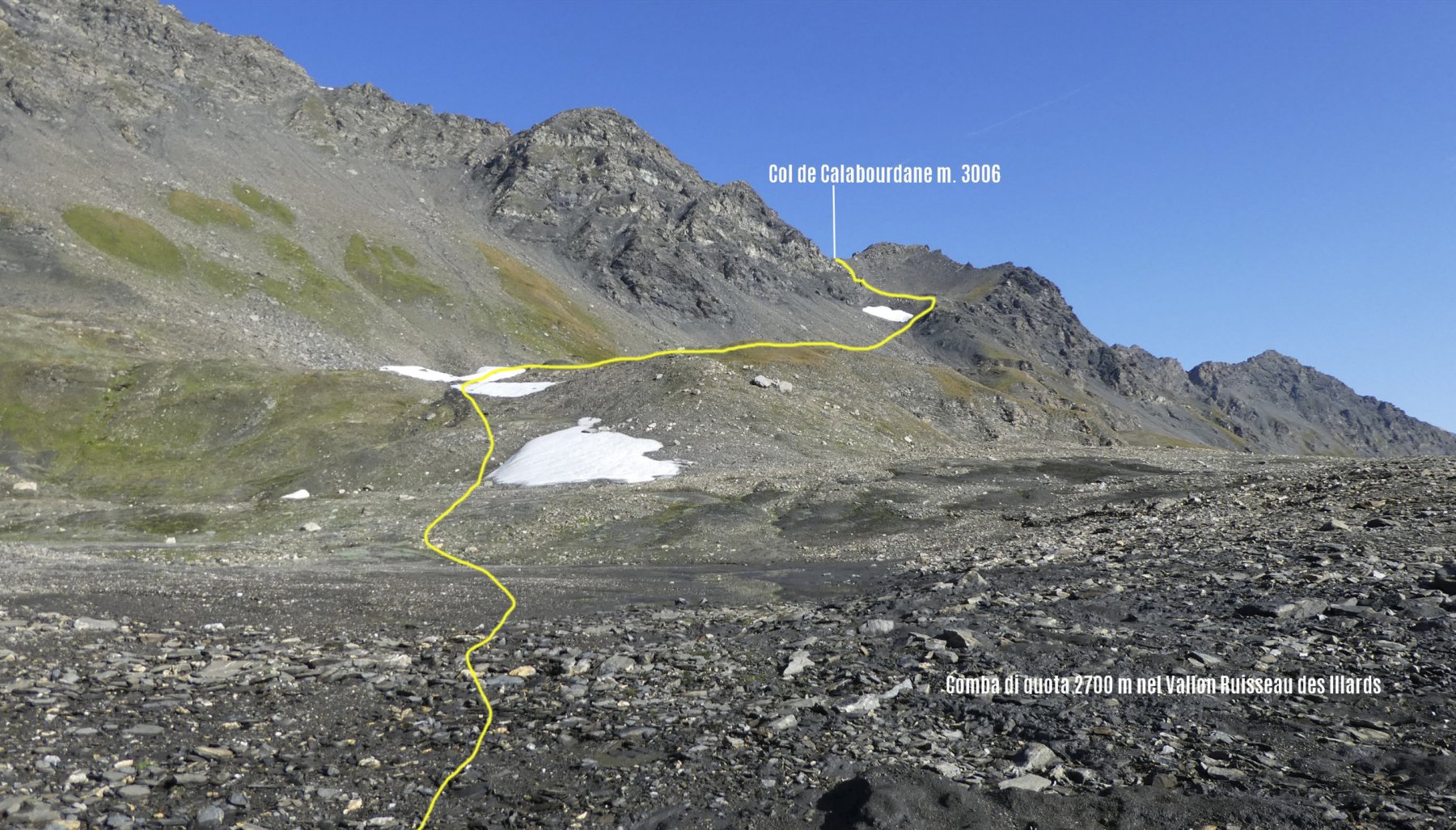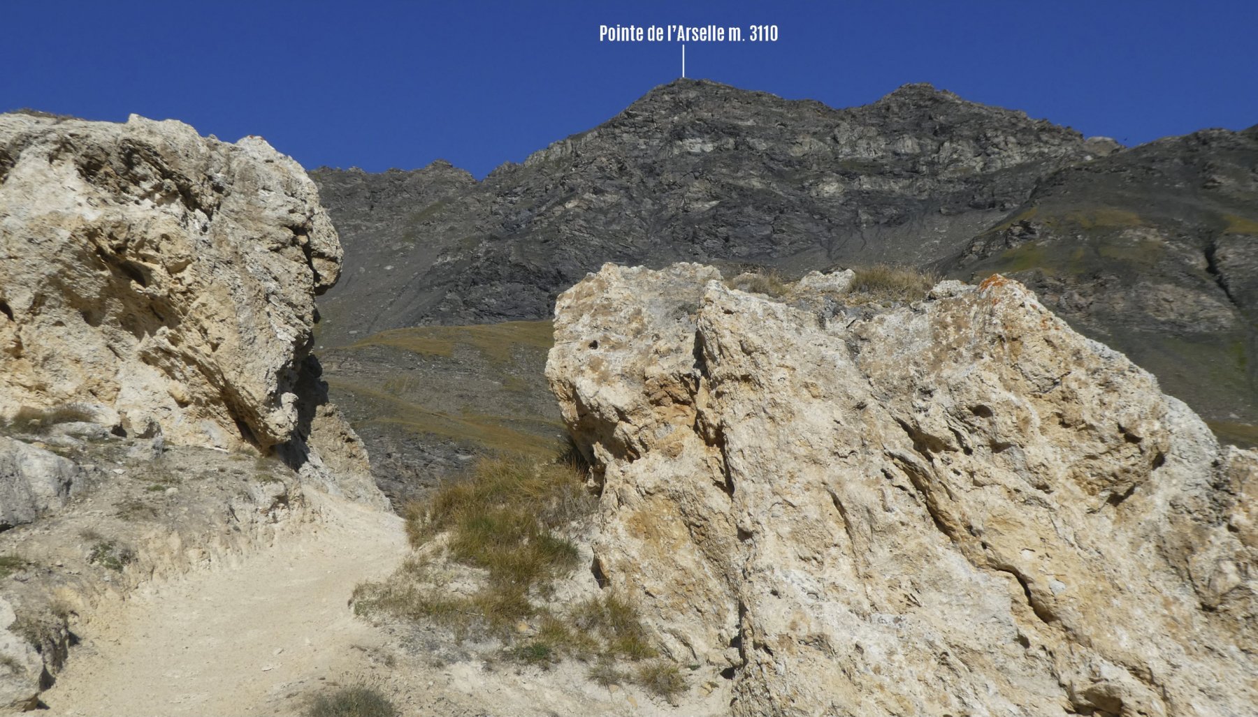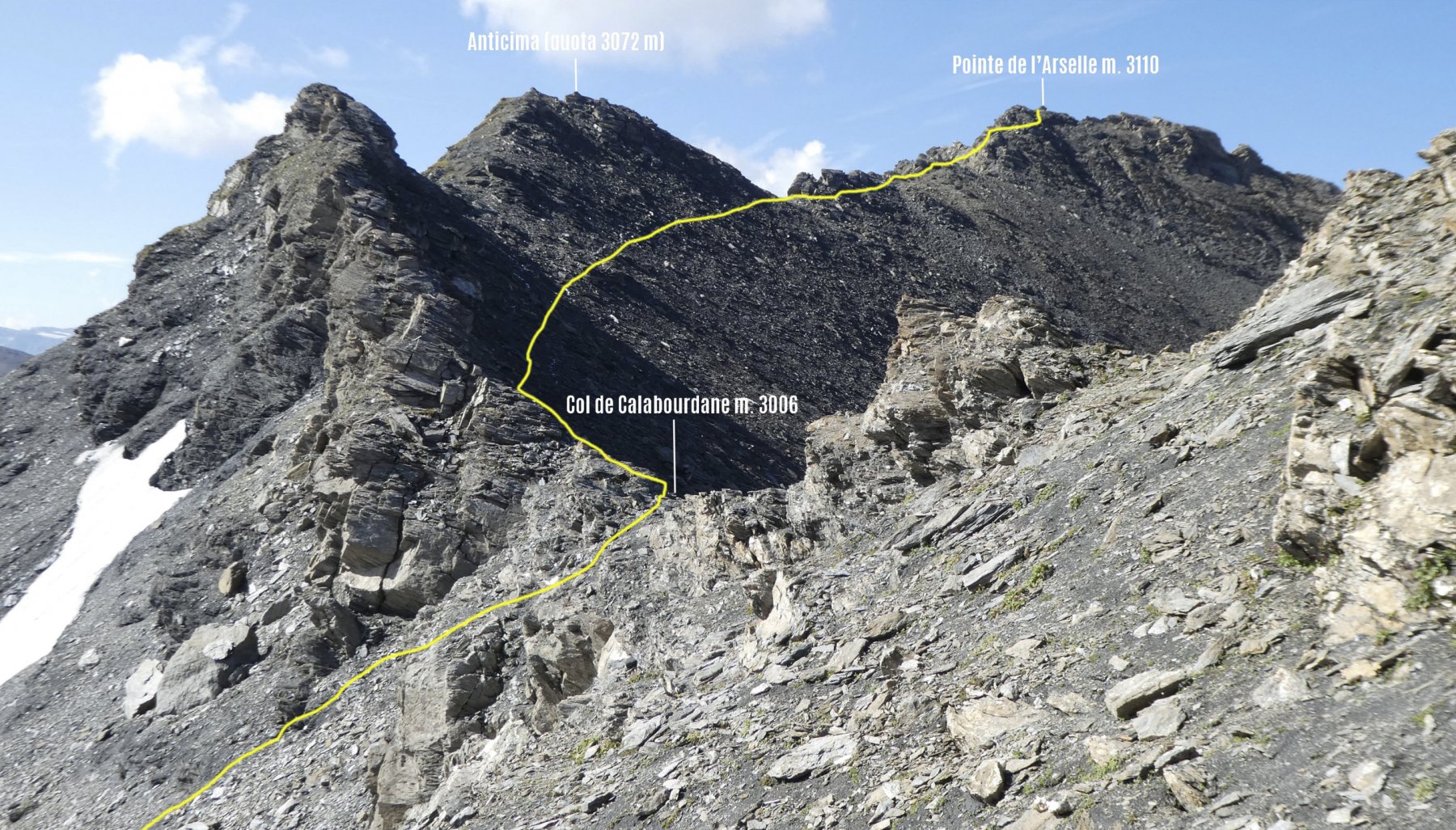 Dal Pont de la Neige m. 2528 (cartello indicatore per il Col des Fours) si inizia a seguire il sentiero che risale i primi pendii erbosi prima e detritici poi, superando alcuni roccioni giallastri ed entrando nella comba iniziale del vallone Ruisseau des Illards, fino a raggiungere un’ampia conca pianeggiante a quota 2700 m posta sotto le cime del Pelaou Blanc e della Pointe de l’Arselle sulla destra del versante di salita. Si abbandona quindi il sentiero che porta al Col des Fours e si piega a destra, non c’è un sentiero, ma solo qualche raro ometto, però il percorso da fare è abbastanza evidente, si individua il pendio-canale detritico che scende direttamente dal Col de Calabourdane visibile in alto, tra le cime della Pointe de l’Arselle (a sinistra) e de l’Ouillette (a destra) e si risale interamente su pendii detritici inizialmente più dolci e poi gradualmente più ripidi, tenendo il centro del canale oppure a destra salendo, superata una china di pietrame si raggiunge la conca sottostante il colle. Ora si deve risalire un ultimo ripido pendio detritico ed alcuni facili gradini rocciosi, con qualche elementare passo di arrampicata, portano al Col de Calabourdane m. 3006. Dal colle (indicato da un ometto di pietre e nessun cartello indicatore) si piega a sinistra lungo un sentierino che aggira l’elevazione rocciosa della punta senza nome (quota 3072 m su carte IGN) a destra, salendo in diagonale lungo un pendio detritico (qualche ometto indica la via) e con percorso evidente si raggiunge un intaglio posto tra la quota 3072 m (a sinistra) e la Pointe de l’Arselle (a destra), dove risalendo il risalto roccioso sommitale, con alcuni facili passaggi di arrampicata (I-II grado) prima direttamente e poi sfruttando una cengetta a destra, si raggiungono i due spuntoni rocciosi che costituiscono la cima di questa montagna.