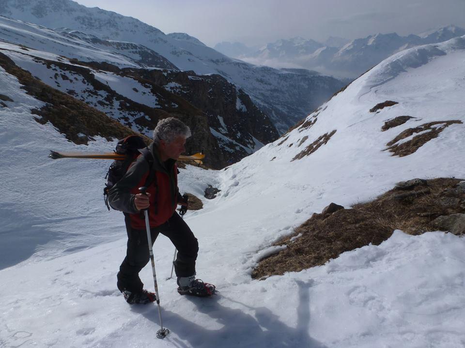 L’ho cominciato sci ai piedi, l’inizio e’ soft, x poi decidermi a calzare i ramponi(avessi avuto quelli d’acciaio invece che quelli di alluminio avrei preferito) sotto saggio consiglio dei soci in un punto abbastanza scomodo.