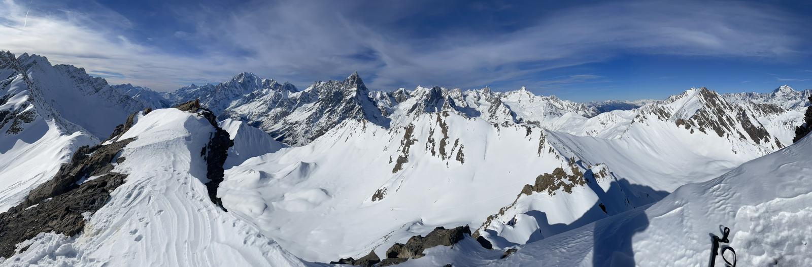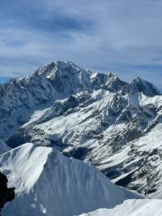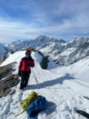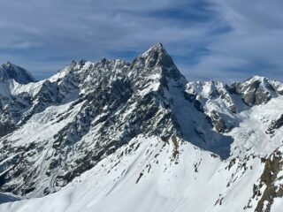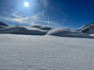 Discesa. Nella parte alta i tratti più ripidi presentano neve molto ammorbidita dal sole, sciabile con decisione, mentre i tratti con pendenza modesta sono tappezzati di farinella leggera, veloce e divertente. Nel canalino, trasformata perfetta, è il tratto più bello, da scendere però con attenzione. I piani bassi, solcati nella parte alta da tanti solchi, hanno troppa poca neve per godere a pieno la sciata. Meglio i prati finali.