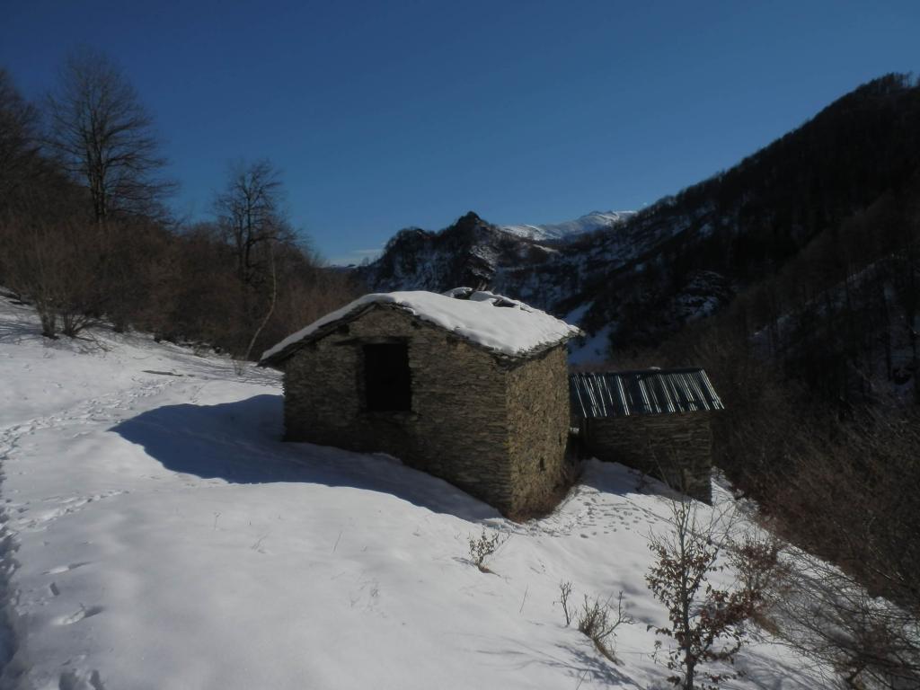 Dalle Meschie si devia a destra (cartello “Anello degli alpeggi/Stalle Artondù”) e si percorre un’ampia pista forestale per poche centinaia di metri fino ad arrivare ad un grande slargo, qui giunti si abbandona la pista (che prosegue a sx) e si svolta decisamente a dx salendo ad una casa in pietra (q.1180 m. circa) dapprima poco visibile. Si fiancheggia la casa e si svolta a sx seguendo un ampio sentiero che si addentra in una pineta a tratti molto fitta (qui neve sempre scarsa per alcune decine di metri).