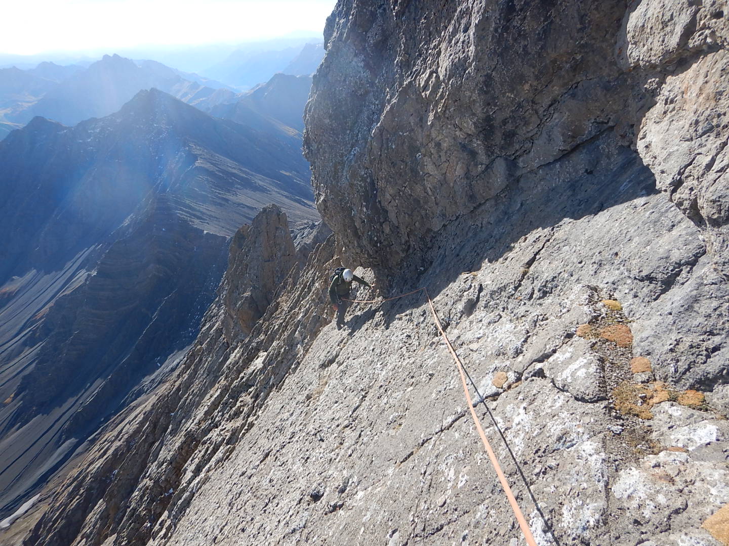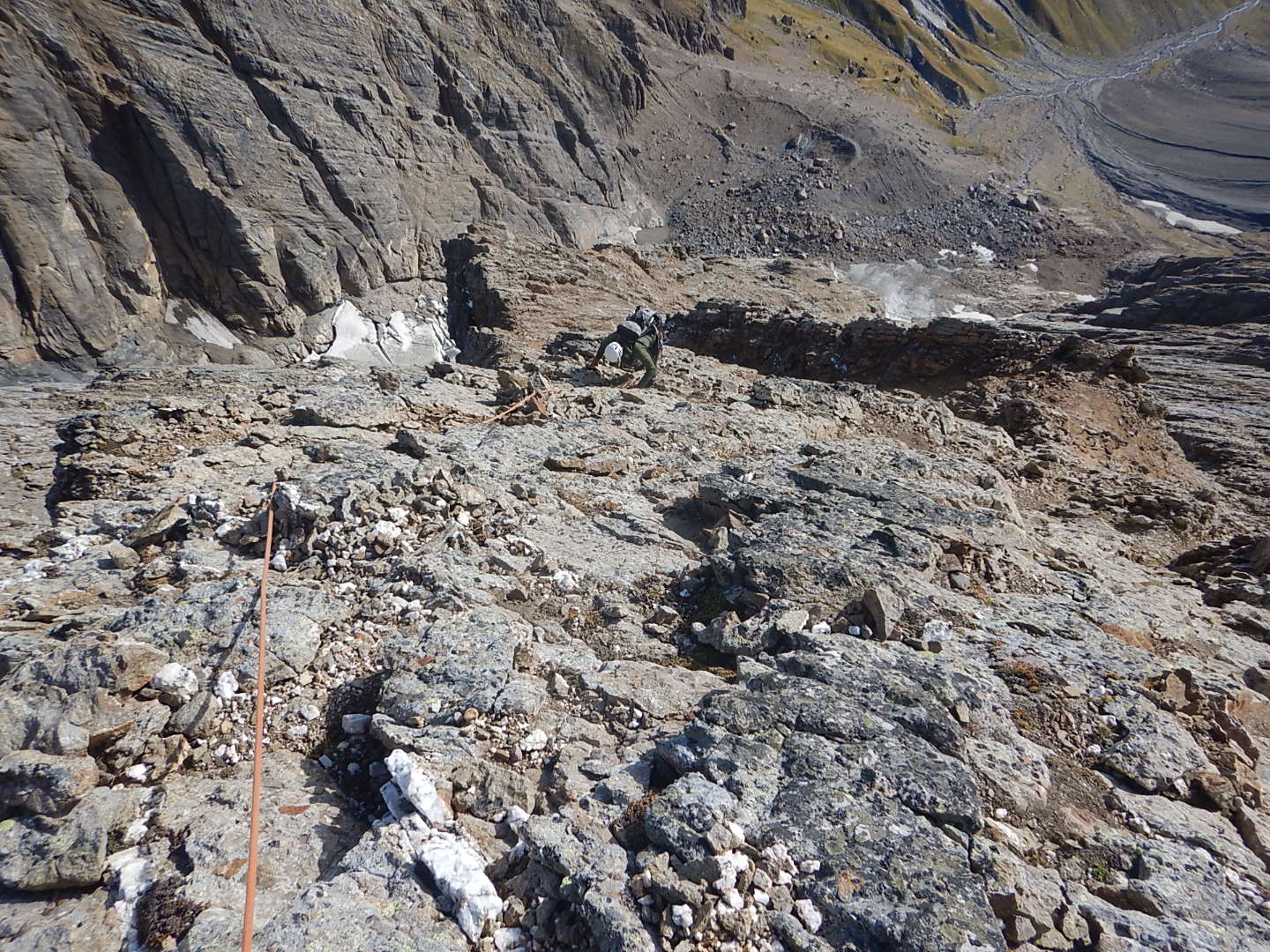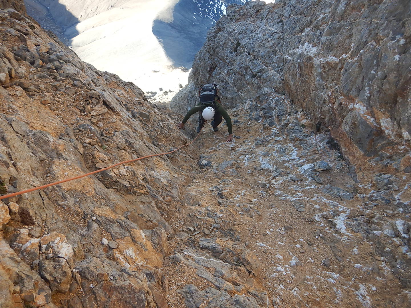 Discesa: dall’ultima sosta una calata di 30m fino alla penultima sopra il Mouvais pas. Da qui una seconda, aerea, di 20m direttamente fino alla Breche superiore. Da questa una calata nel canale della breche lato sud, poi disarrampicata (neve/ghiaccio fino a stagione inoltrata, delicato). A circa 50m dalla forcella un cordino con maillon su clessidra sul fondo del canale permette una seconda calata fino alla fine delle difficoltà. Con facile ma delicata disarrampicata si scende ancora brevemente il colatoio fin dove lo si aveva attraversato in salita (ometto). Per rampe verso dx si torna alla spalla detritica. Per tracce si scende allo sbocco del canalino roccioso iniziale che si può disarrampicare o evitare con una doppia.