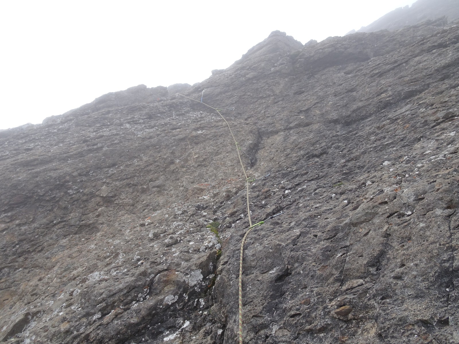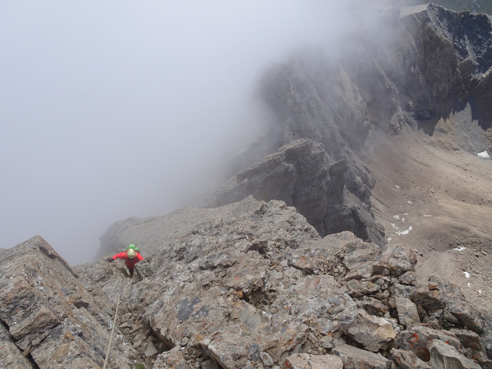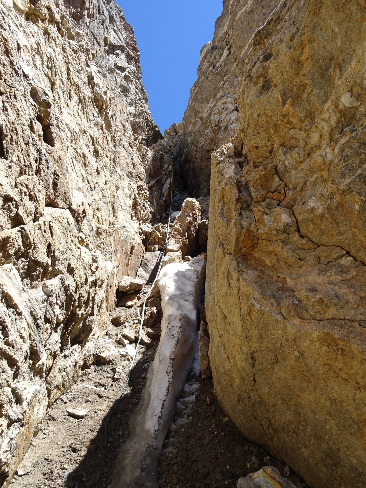 Discesa: dall’ultima sosta una calata di 30m fino alla penultima sopra il Mouvais pas. Da qui una seconda, aerea, di 20m direttamente fino alla Breche superiore. Da questa una calata nel canale della breche lato sud, poi disarrampicata (neve/ghiaccio fino a stagione inoltrata, delicato). A circa 50m dalla forcella un cordino con maillon su clessidra sul fondo del canale permette una seconda calata fino alla fine delle difficoltà. Con facile ma delicata disarrampicata si scende ancora brevemente il colatoio fin dove lo si aveva attraversato in salita (ometto). Per rampe verso dx si torna alla spalla detritica. Per tracce si scende allo sbocco del canalino roccioso iniziale che si può disarrampicare o evitare con una doppia.