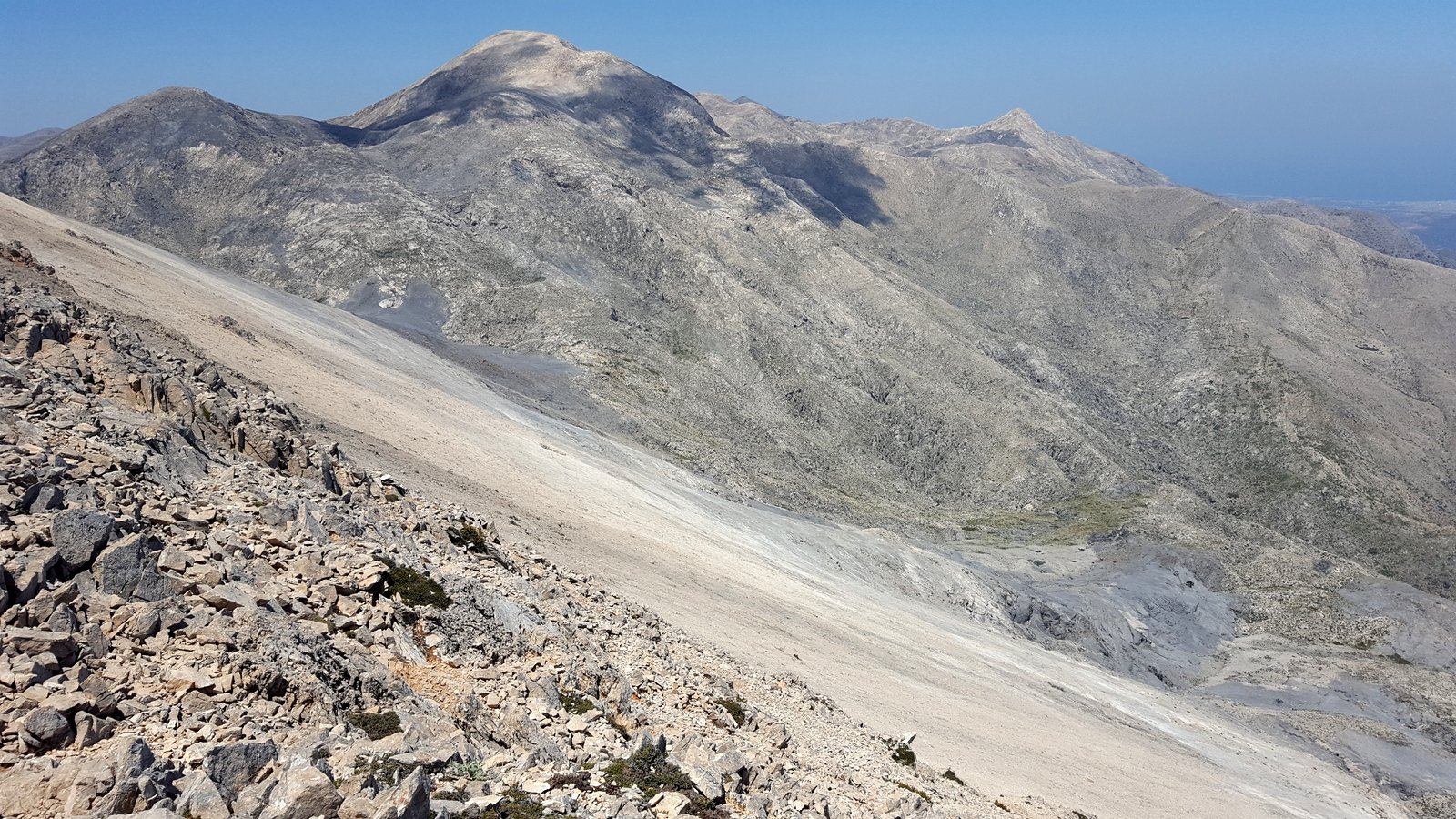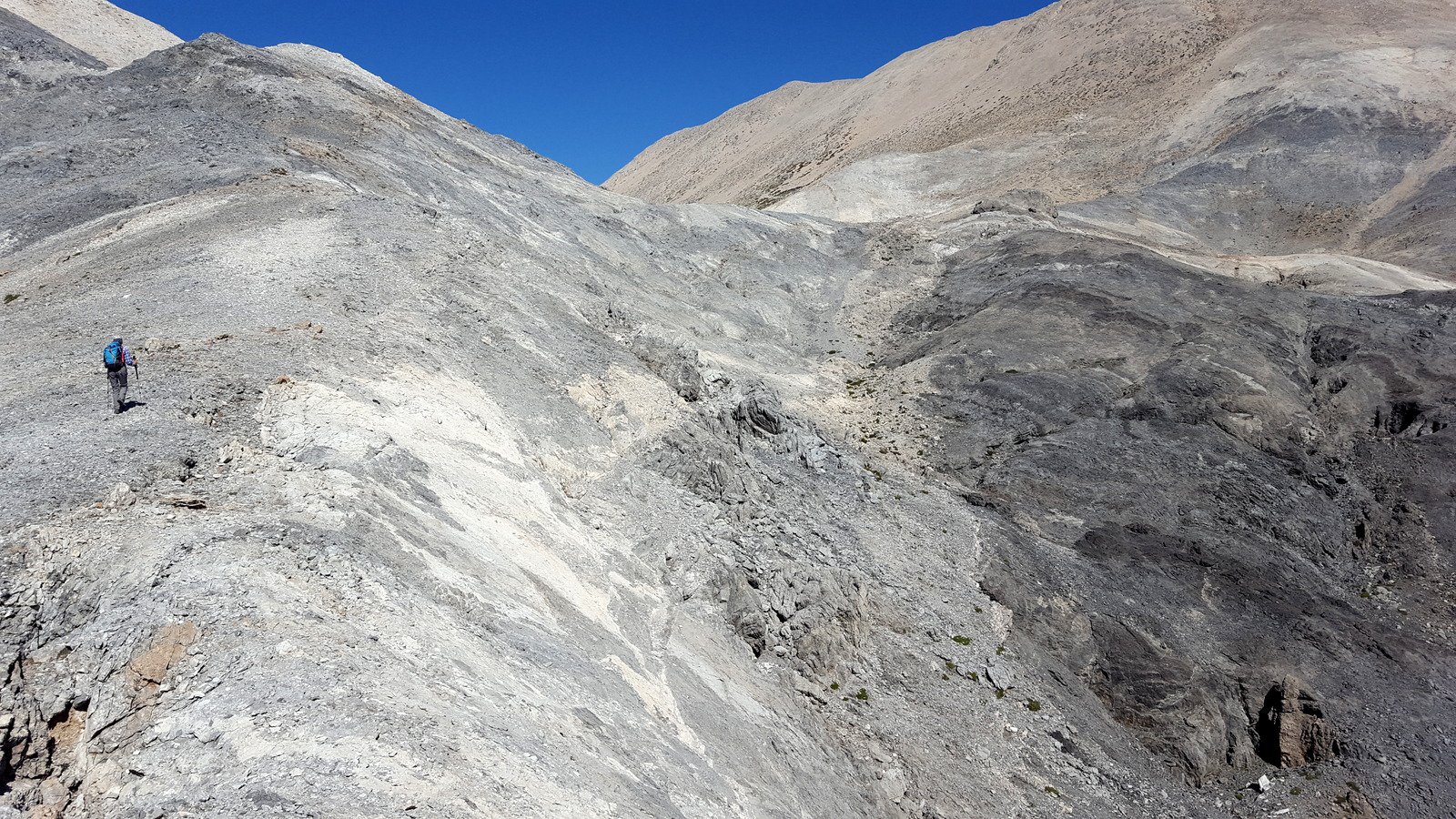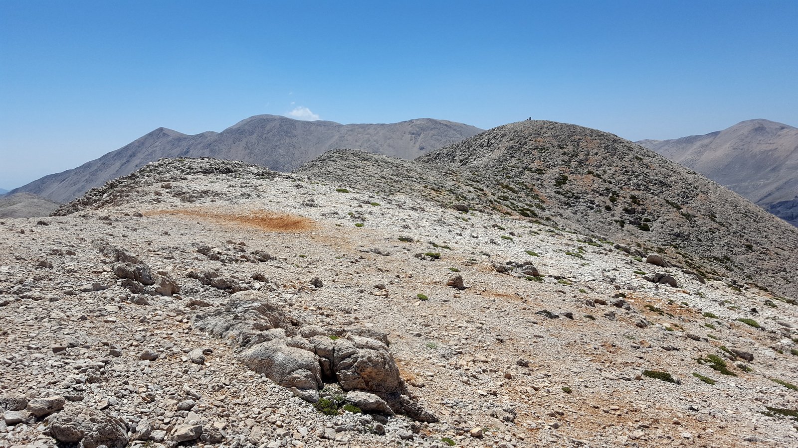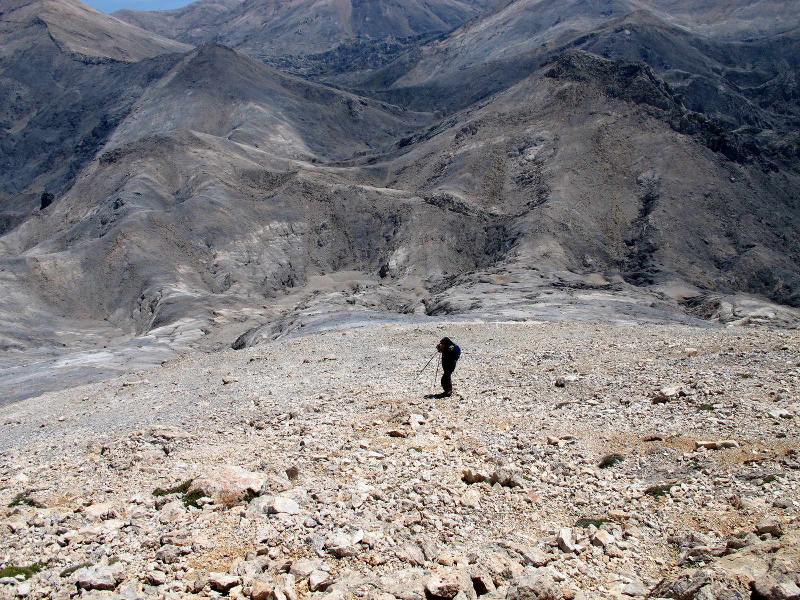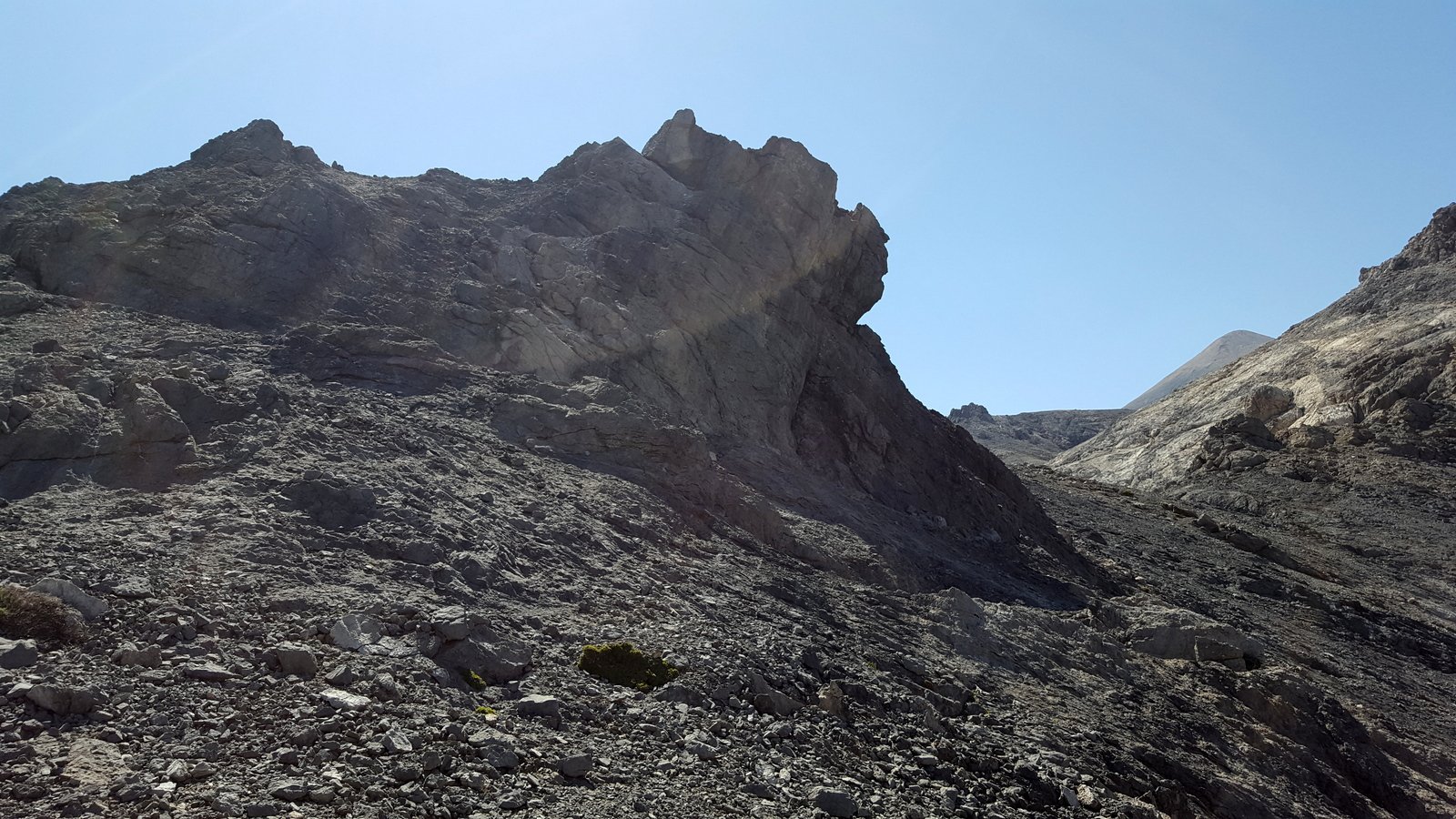 Si torna sul tracciato dell’E4 (segnavia giallo-neri) che, con traverso in direzione ESE, conduce al colletto alla base dell’Askyfiotikos Soros. Si abbandona nuovamente il sentiero e si risale faticosamente il pendio N del monte (qualche tracciolina fra i detriti) fino alla vetta (mt. 2213). Quindi si scende dalla parte opposta su terreno ripido e infido, sfruttando eventualmente gli affioramenti obliqui di roccia più salda. Arrivati alla base dell’Askyfiotikos, si continua lungo l’ampia dorsalona progressivamente verso SSE, oltrepassando due piccoli rilievi rocciosi e puntando ad un ultimo castello dove le dorsale finisce. Si aggira con attenzione quest’ultima formazione rocciosa alla sua base sx (breve passaggio che richiede l’uso delle mani) per portarsi sul pendio dal quale si accede ad un altro crinale che separa due vaste depressioni.